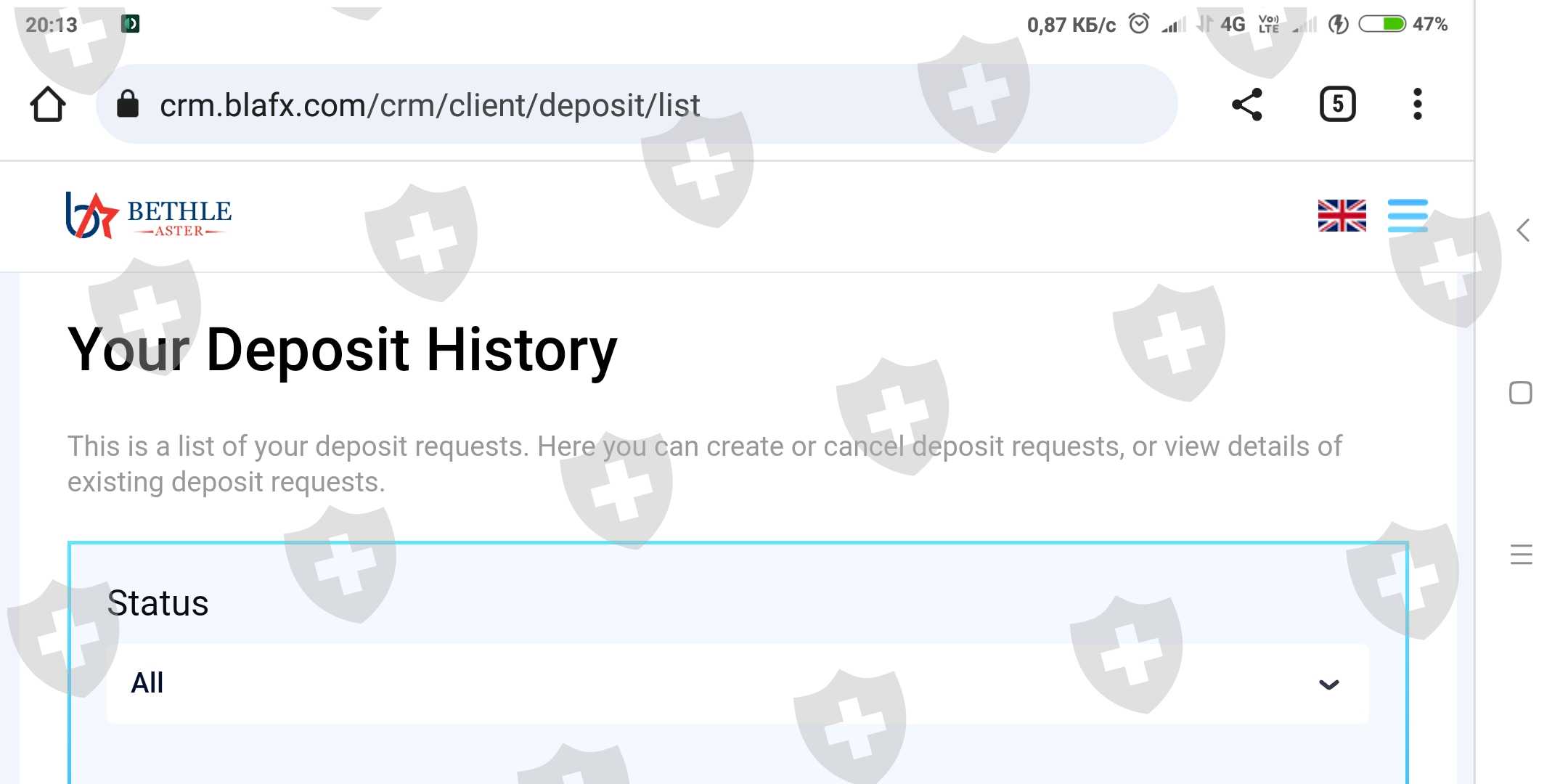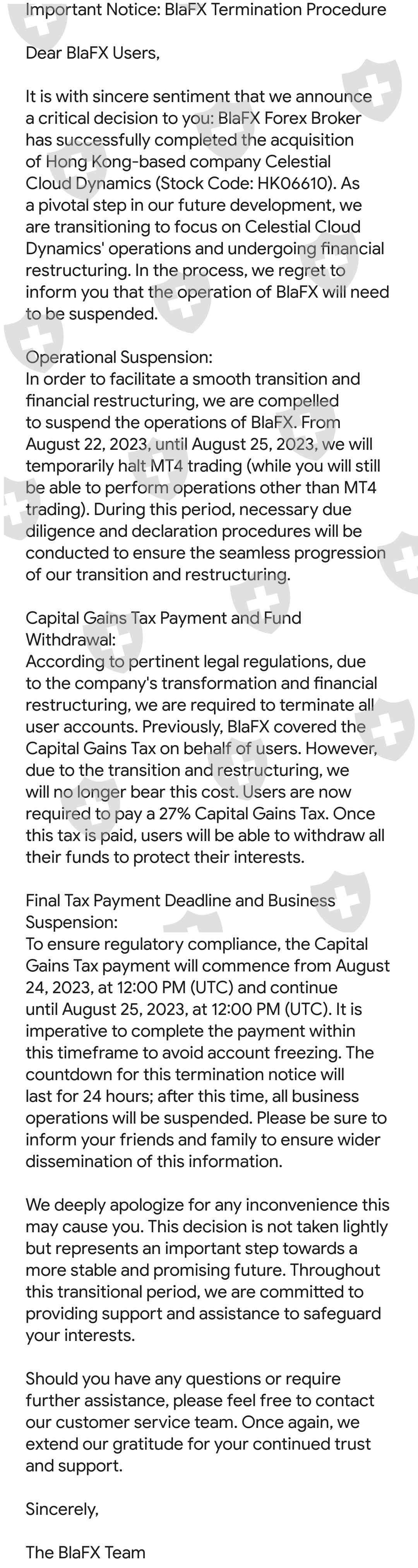 BlaFX заблокировал вывод средств 17 августа, объяснив это тем, что якобы с 18 по 25 августа они будут проводить акцию "+ 100% к депозиту" для торговли на неделю тем, кто внесёт в эти даты средства. Но уже 23 августа они отключили и MT4, объяснив это тем, что BlaFX якобы собирается покупать компанию, из-за этого им нужно приостановить торговлю. Но уже 24 августа в личном кабинете вышло следующее уведомление о том что, BlaFX приобрела компанию, но завершает своё существование и чтобы получить возможность вывести деньги, нужно внести налог 27%. Не уточняется, от какой суммы, от заработанного или от полного депозита, якобы они эти деньги перешлют в налоговую службу. Выводы, переводы до сих пор заблокированы, к МТ4 не подключиться.