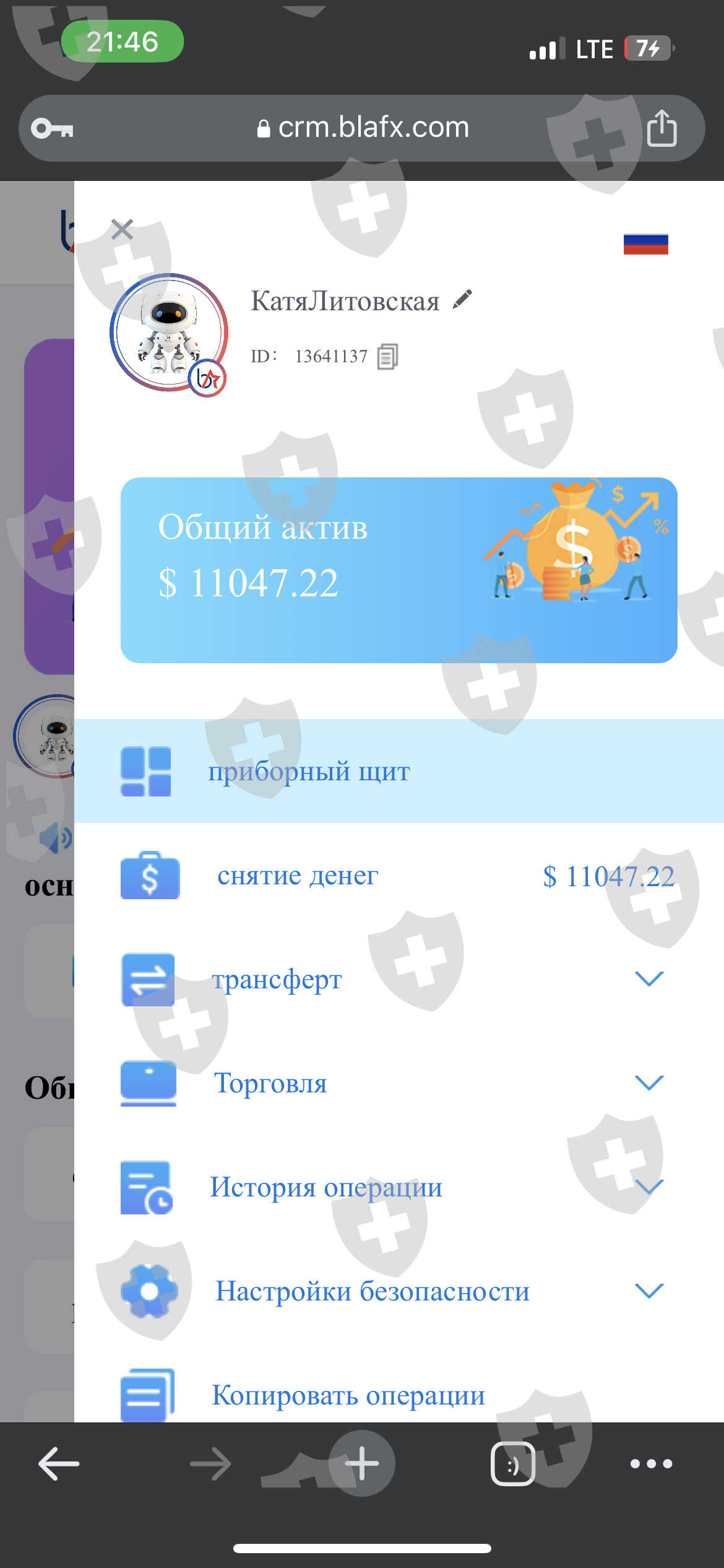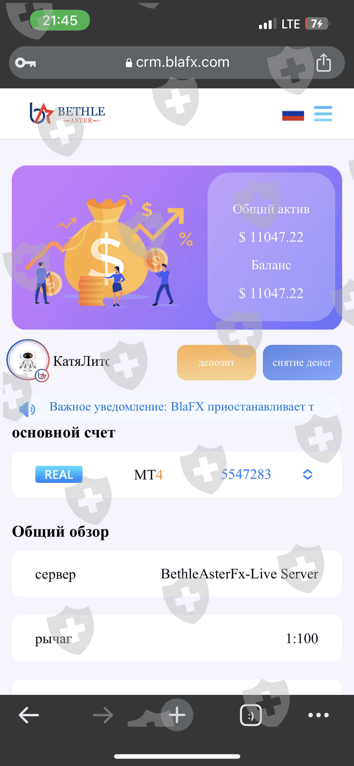 Сейчас там баланс 5547283 до сих пор лежит в BlaFX . Несколько раз пыталась снять их, невозможно. Буду благодарна за возврат денег!