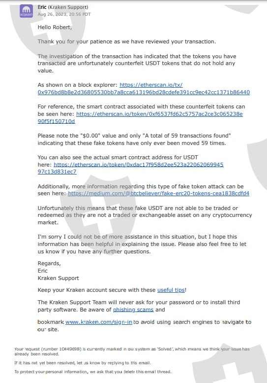 使用 Coinbase 钱包中的常规资金转移方法,我尝试将资金从 Coinbase 钱包转移到我的 Kraken 账户。 Coinbase 发送了转账,但是 karken calims 发送了假币,并向我发送了一封电子邮件,告诉我然后关闭了我的帐户。 见附件。 Coinbase 拒绝退还我原来的资金,kraken 甚至告诉我只能通过电子邮件与他们交谈,我发送了电子邮件但没有回复,所以现在我没有追索权。