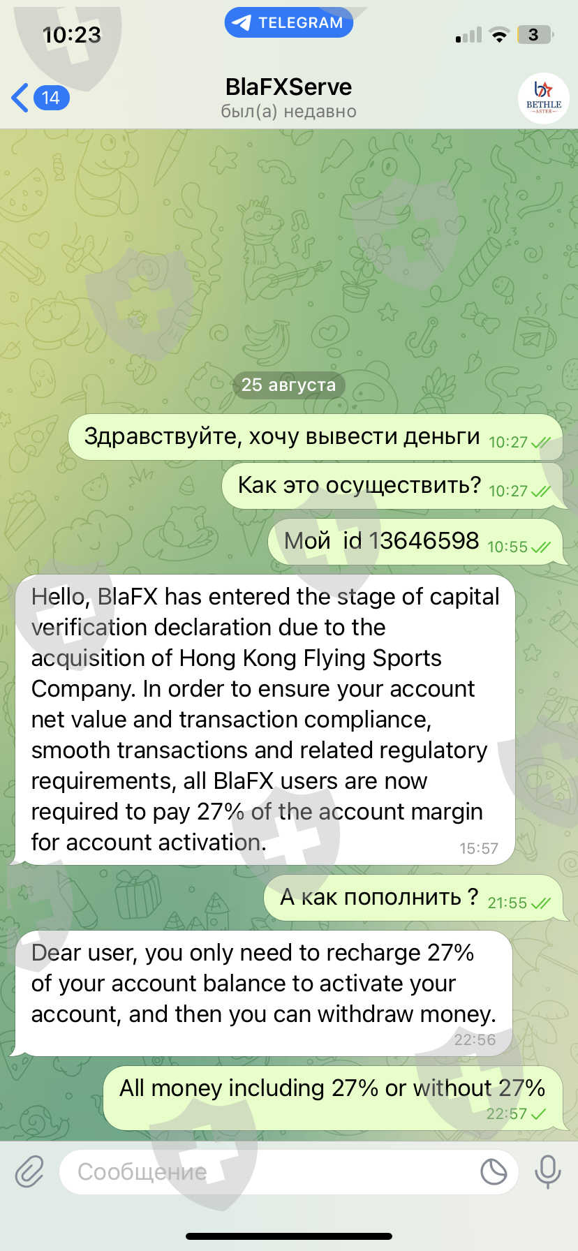 Добрый день. Не могу вывести свои собственные средства, в размере 2050$, требуют заплатить необоснованный налог 27%. Считаю действия данного брокера мошенничеством. Прошу разобраться в данной ситуации мой id 13646598
