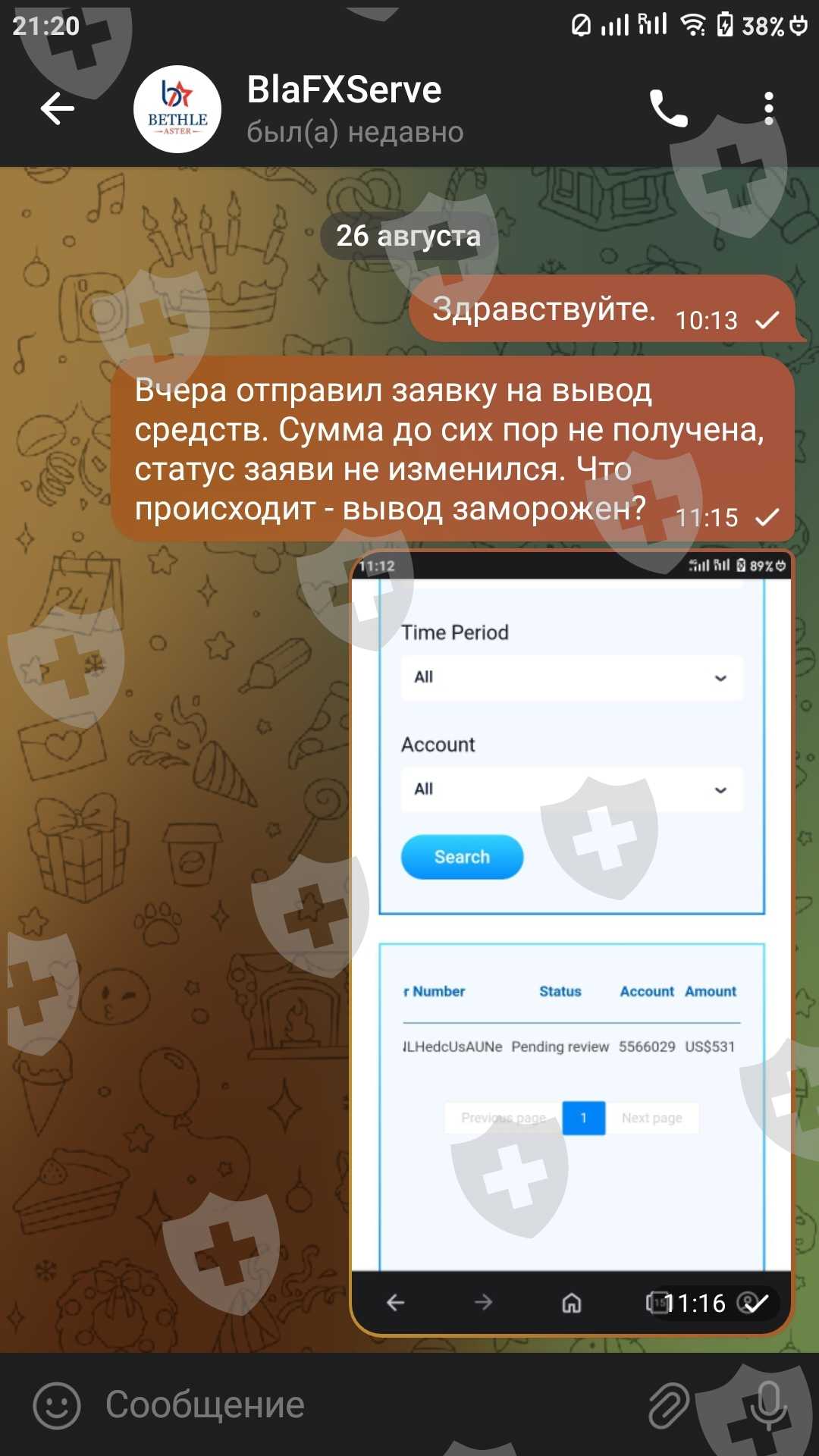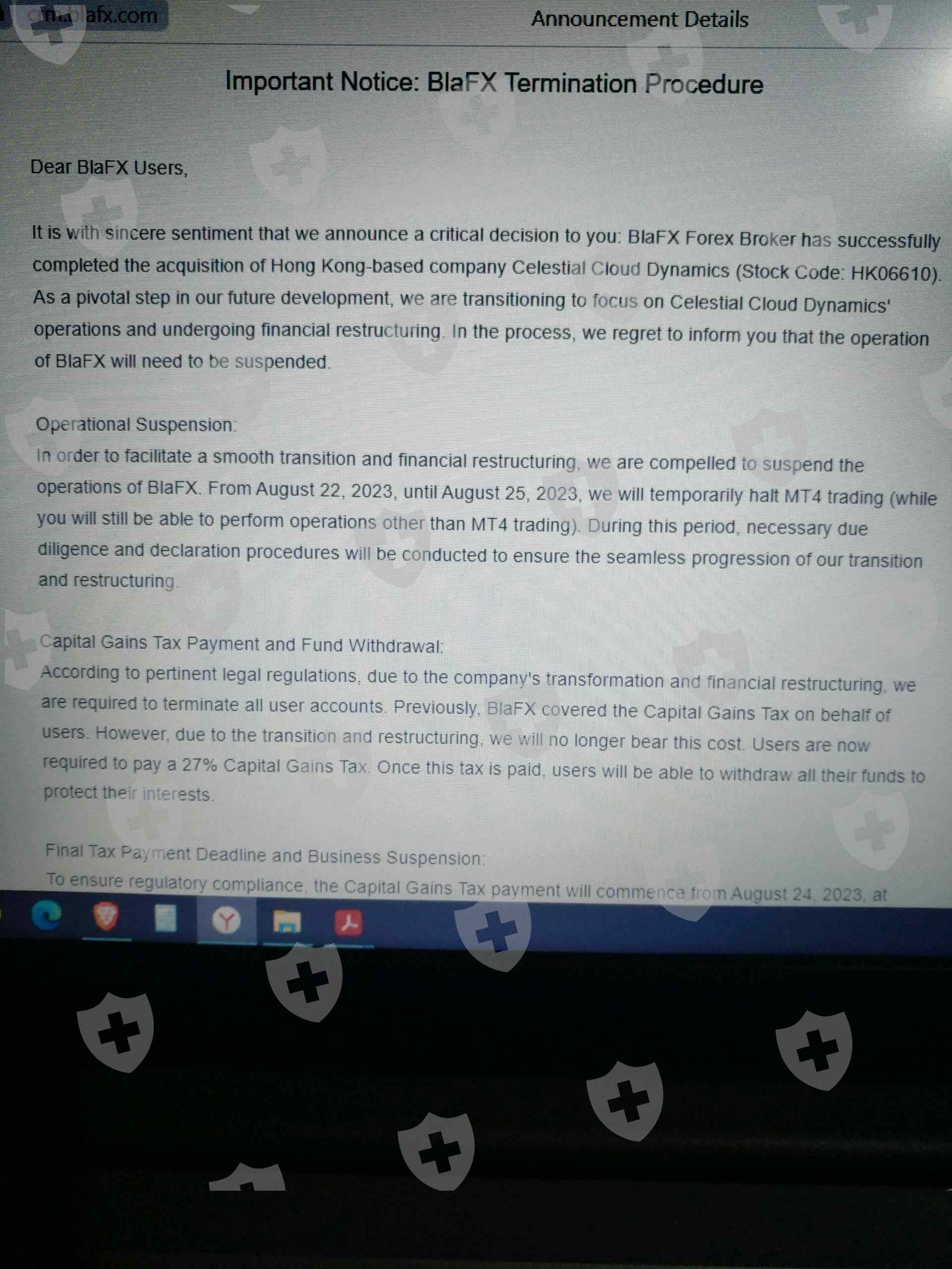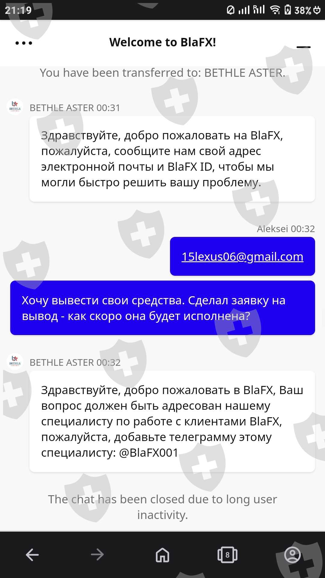 Зарегистрировался на бирже BlaFX 16.08.2024. Пополнил баланс на 500 USDT. Через несколько дней биржа заявила о приостановке работы. Ещё позже на сайте компании BlaFX появилась информация, что торговля приостановлена и нужно уплатить налог 27% на прирост капитала. Сделал заявку на вывод средств с депозита, она не исполнена до сих пор. Служба технической поддержки не отвечает. MetaTrader 4 от этой биржи отключили. Помогите вернуть депозит