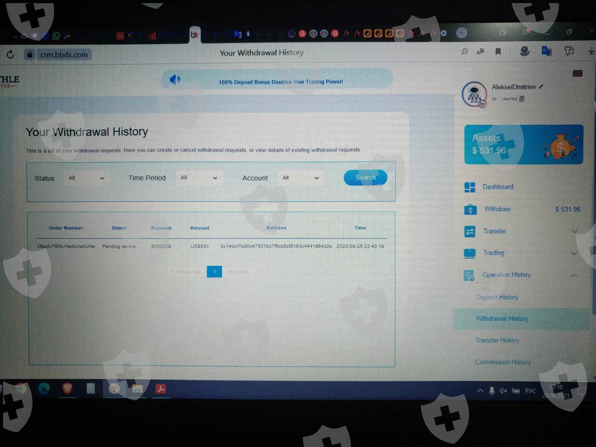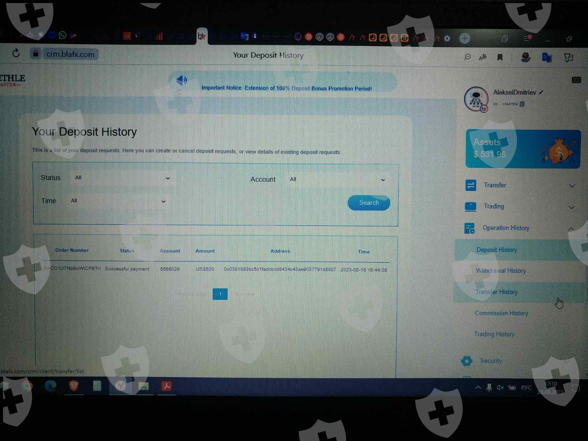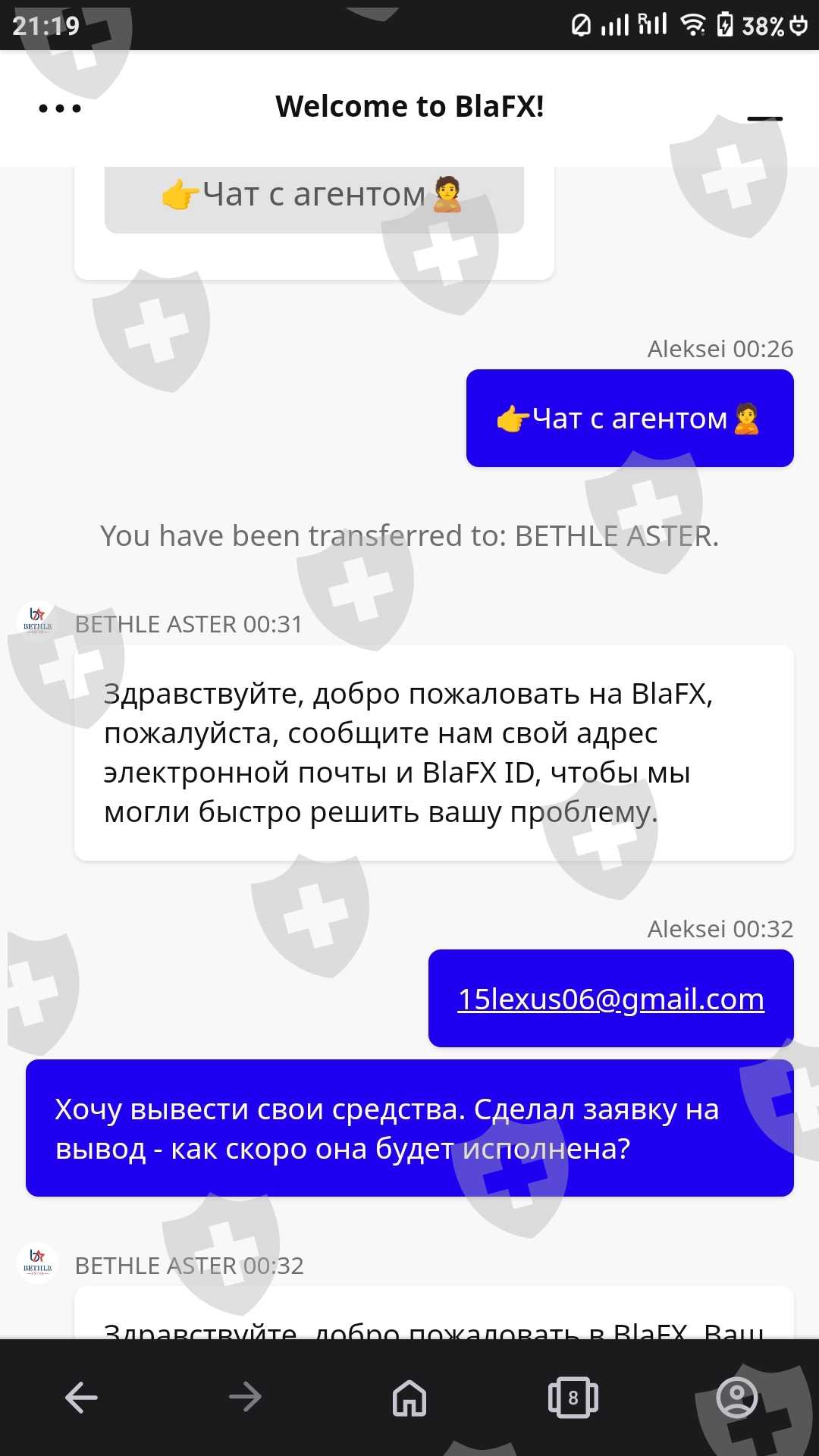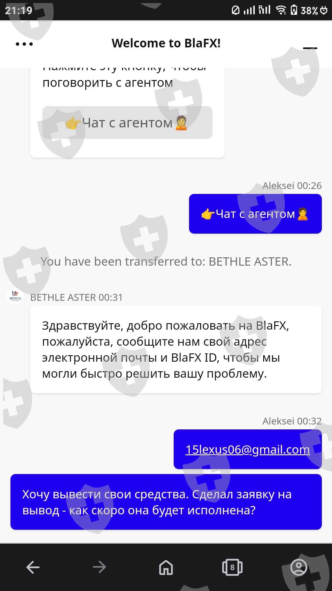 Зарегистрировался на бирже BlaFX 16.08.2024. Пополнил баланс на 500 USDT. Через несколько дней биржа заявила о приостановке работы. Ещё позже на сайте компании BlaFX появилась информация, что торговля приостановлена и нужно уплатить налог 27% на прирост капитала. Сделал заявку на вывод средств с депозита, она не исполнена до сих пор. Служба технической поддержки не отвечает. MetaTrader 4 от этой биржи отключили. Помогите вернуть депозит
