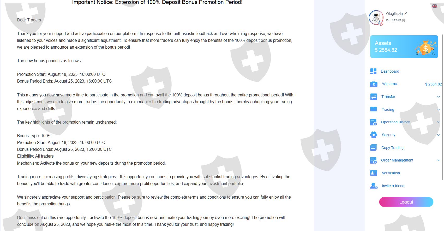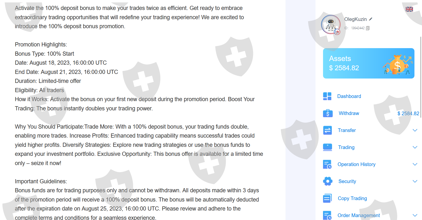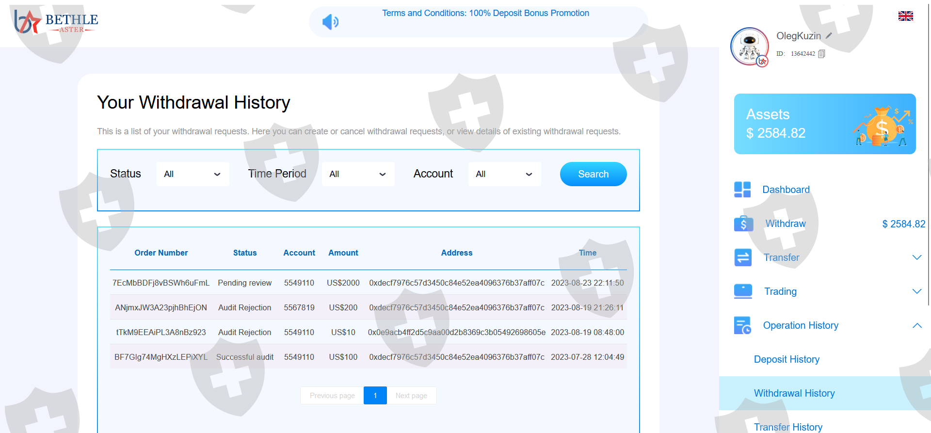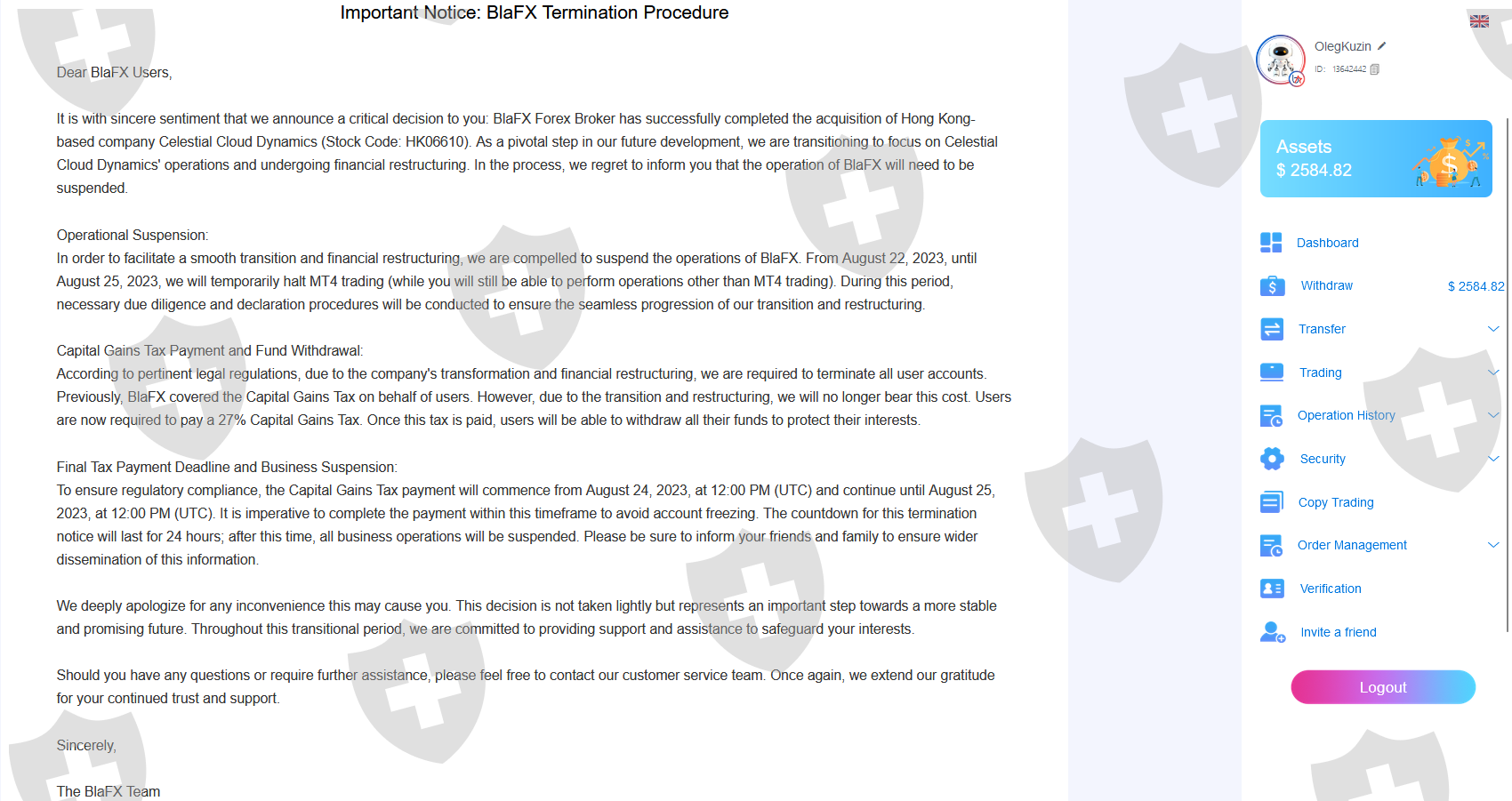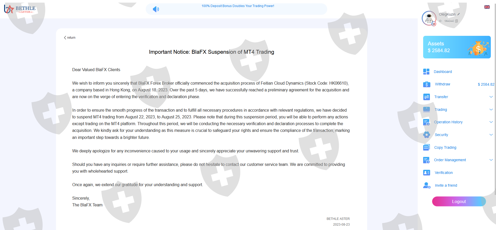 我不明白什么样的内容重复存在问题以及为什么我的申请不被接受。添加了信息和屏幕截图。 佰利安环球他们不允许以促销为幌子从 18.08 提款,在 25.08 之前存款为 100%。 8 月 25 日,他们宣布关闭,并愿意支付 27% 的额外税款以退出。总共投资1985美元。未付款时的余额为 2584.82 美元。