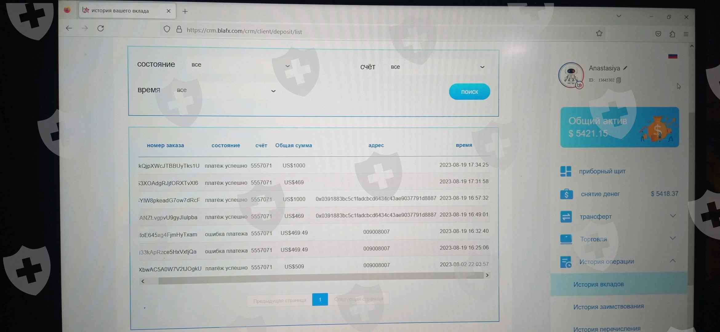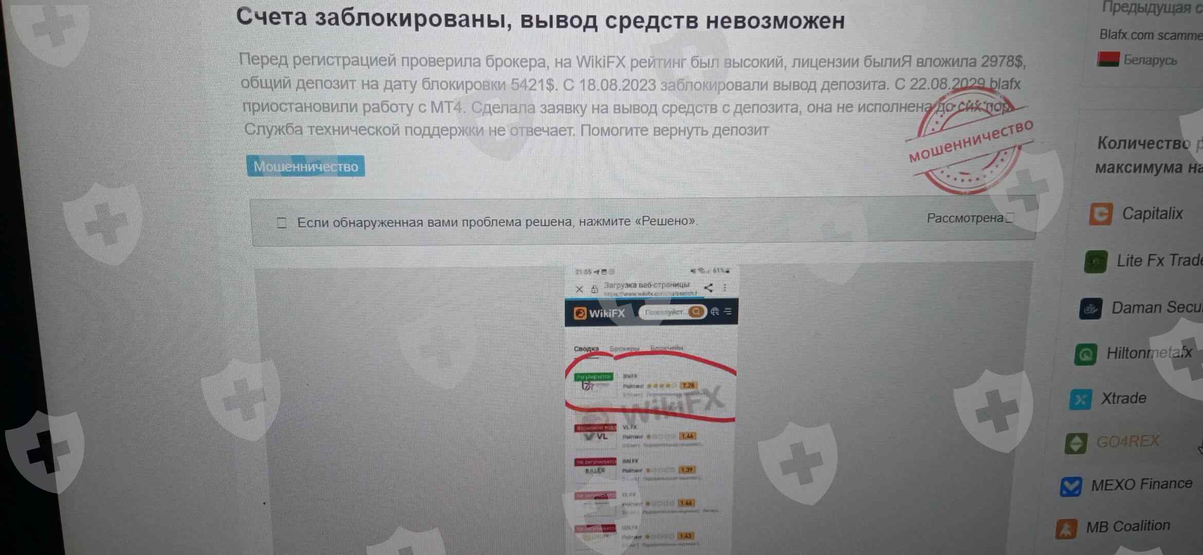 Я вложила 2978$, общий депозит на дату блокировки счетов 5421$. С 18.08.2023 заблокировали вывод депозита. С 22.08.2029 blafx приостановили работу с МТ4. Сделала заявку на вывод средств с депозита, она не исполнена до сих пор. Служба технической поддержки не отвечает. Будьте внимательны! Помогите вернуть депозит!