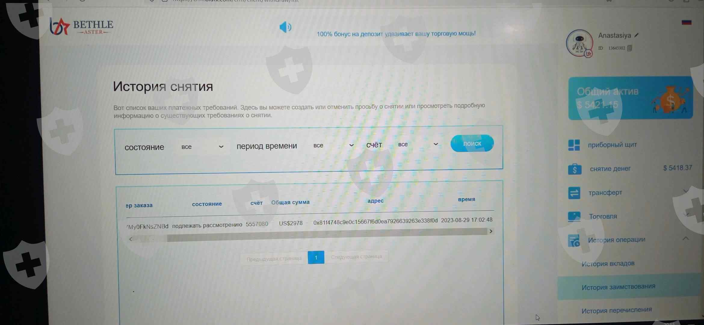 我投资了 2978 美元,帐户冻结之日的存款总额为 5421 美元。自2023年8月18日起,存款提现被阻止。从2029年8月22日起 佰利安环球暂停与 mt4 的合作。提出了从存款中提取资金的请求,但迄今为止尚未执行。技术支持未响应。当心!帮我拿回押金!