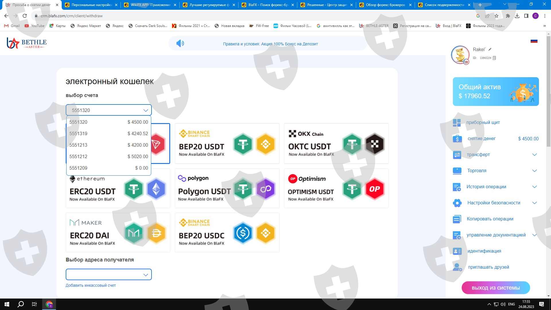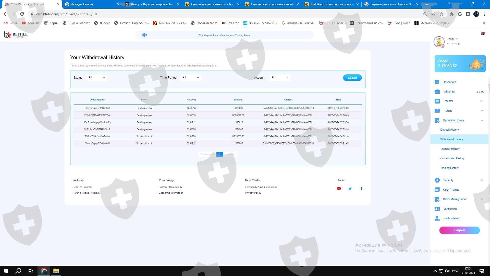 Брокер Вlаfх.соm обманул инвесторов проведя с 18.08.2023г без предупреждения и согласия пользователей (инвесторов) акцию+100% к пополняемому депозиту и заблокировали вывод средств до конца акции 25.08 2023г. C 22.08.2023 на Blаfx.соm прекратились торговые операции с МТ4 и заморозил счета. Сумму моего депозита я указал ниже, приложив скриншот моего аккаунта и адреcа пополнения с OKX.com. Так же с 22. 08.2023г поддержка сайта blafx.com в чатах начала давать ссылку на телеграмм канал в котором, требовала внести залог в размере 50% от имеющегося депозита, потом все 100%. А 25.08.2023г на сайте появилось сообщение о реструктуризации и внесении налога (залога) в 27% от имеющегося депозита, если мы хотим вывести свои средства. После 25.08.2023г. по окончанию акции политика вывода средств не изменилась. Начиная с 23. 08. 2023 средства вывести не возможно, пишет что средства находятся в статусе "на рассмотрении". Требую возврат моих средств от брокера Вlafx.соm! Надеюсь на вашу помощь и поддержку!