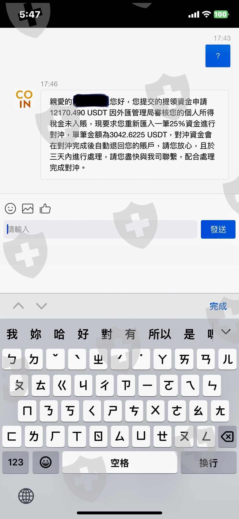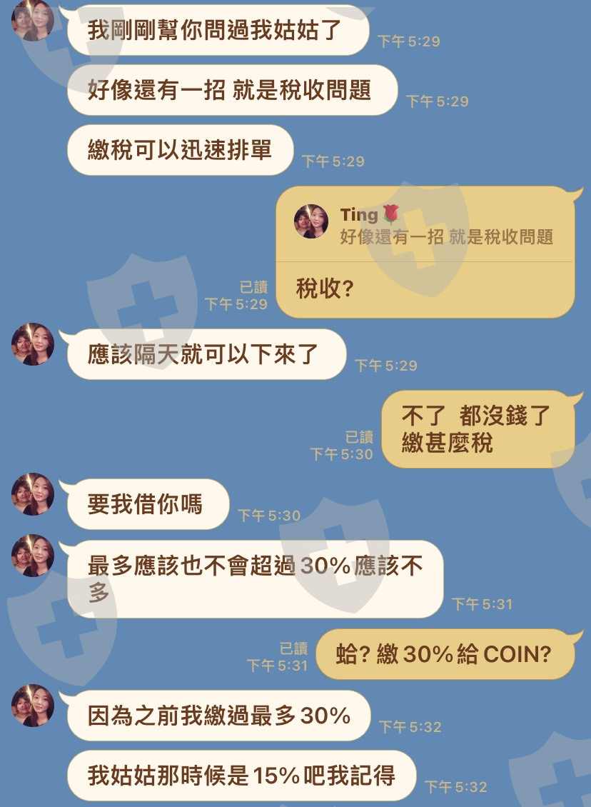 網路上認識一個網友,一直要我投資,一開始投資將近1萬U,後續又要我貸款100萬,我就有點不信任,像coininvest申請出金,結果需要等3個禮拜時間,因為那個網友說出金要快可以問看看繳稅機制,結果問了以後,對方客服直接強制開啟稅收機制,我必須要繳3千多的USDT,否則就會凍結帳戶,後續客戶就一直講三日繳稅金否則凍結帳戶。