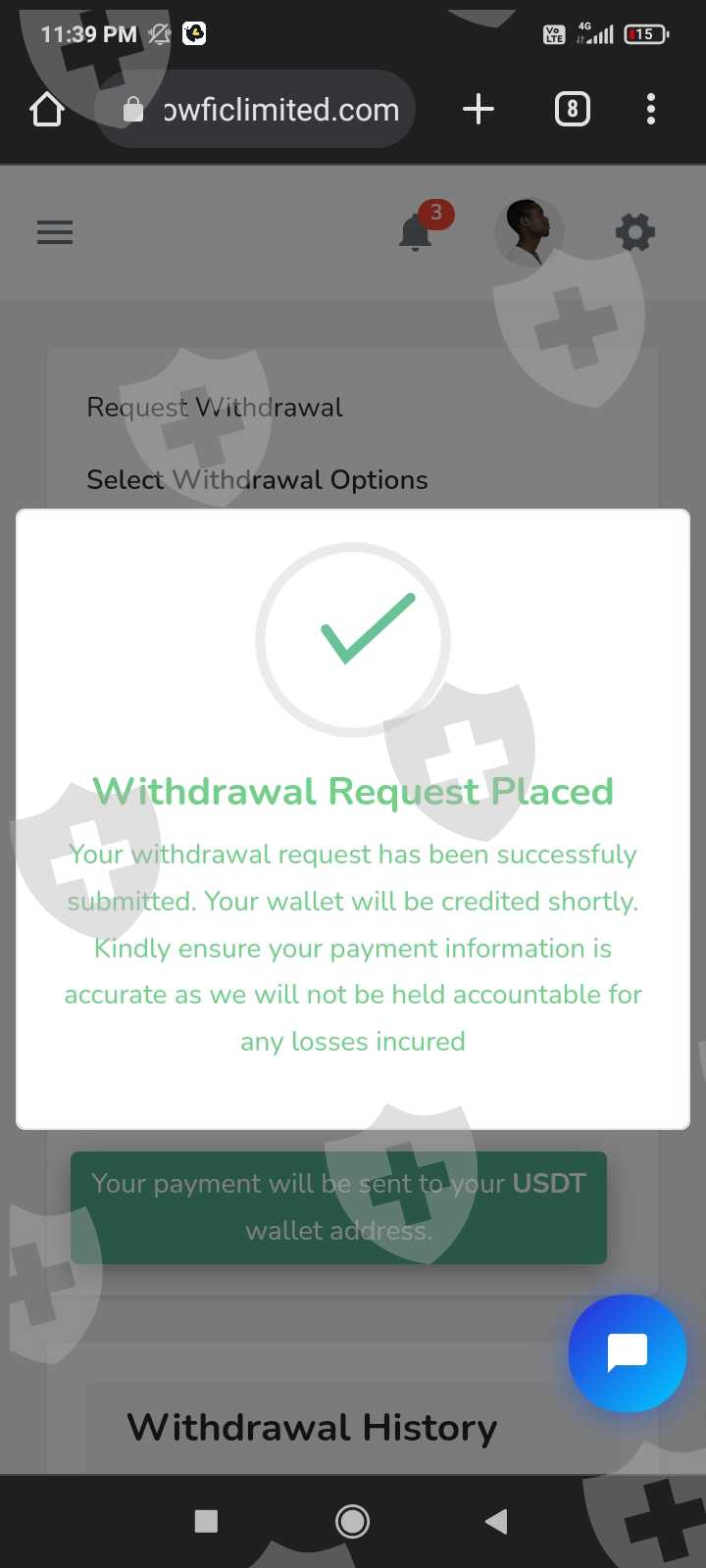 他们先让你交50美元作为起始资金,然后给你500美元,告诉你在他们的网站上创建一个账号,然后让你用110美元投资lvl2,我们可以在升级后出金。如果你付了钱,他们会发送你在他们网站创建的资金帐户,并且告诉你可以出金,但是出金不会到你的钱包。我已经出金了,但是资金还没有到我的币安钱包,附上截图