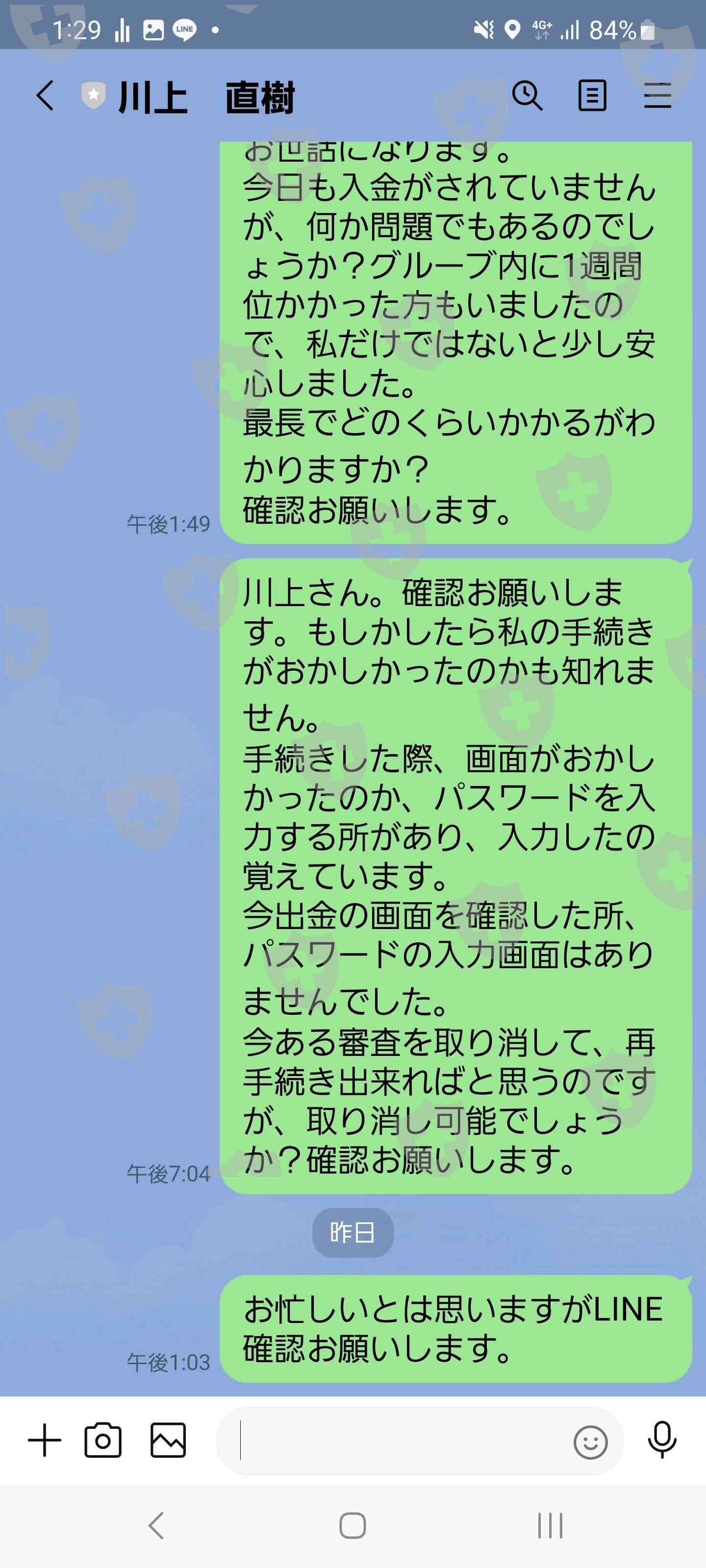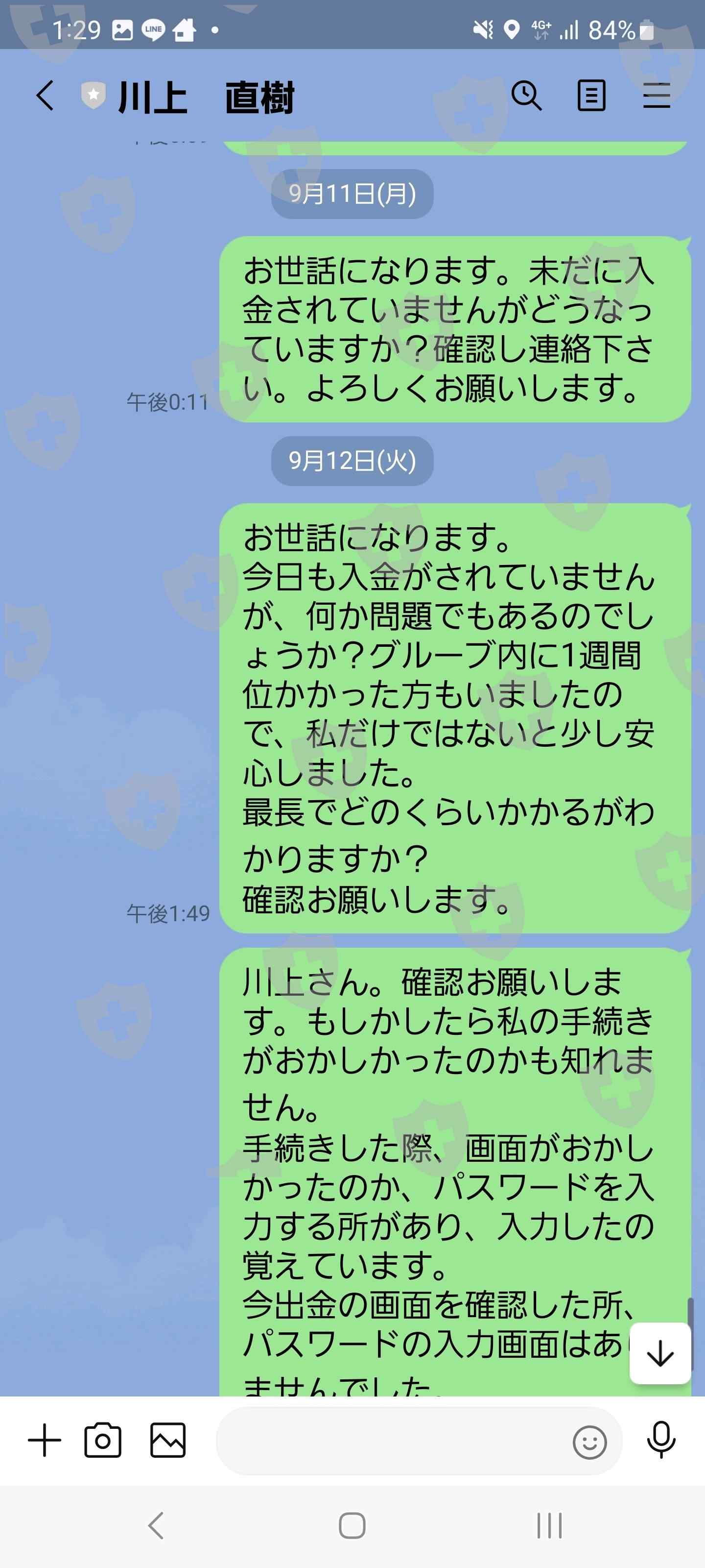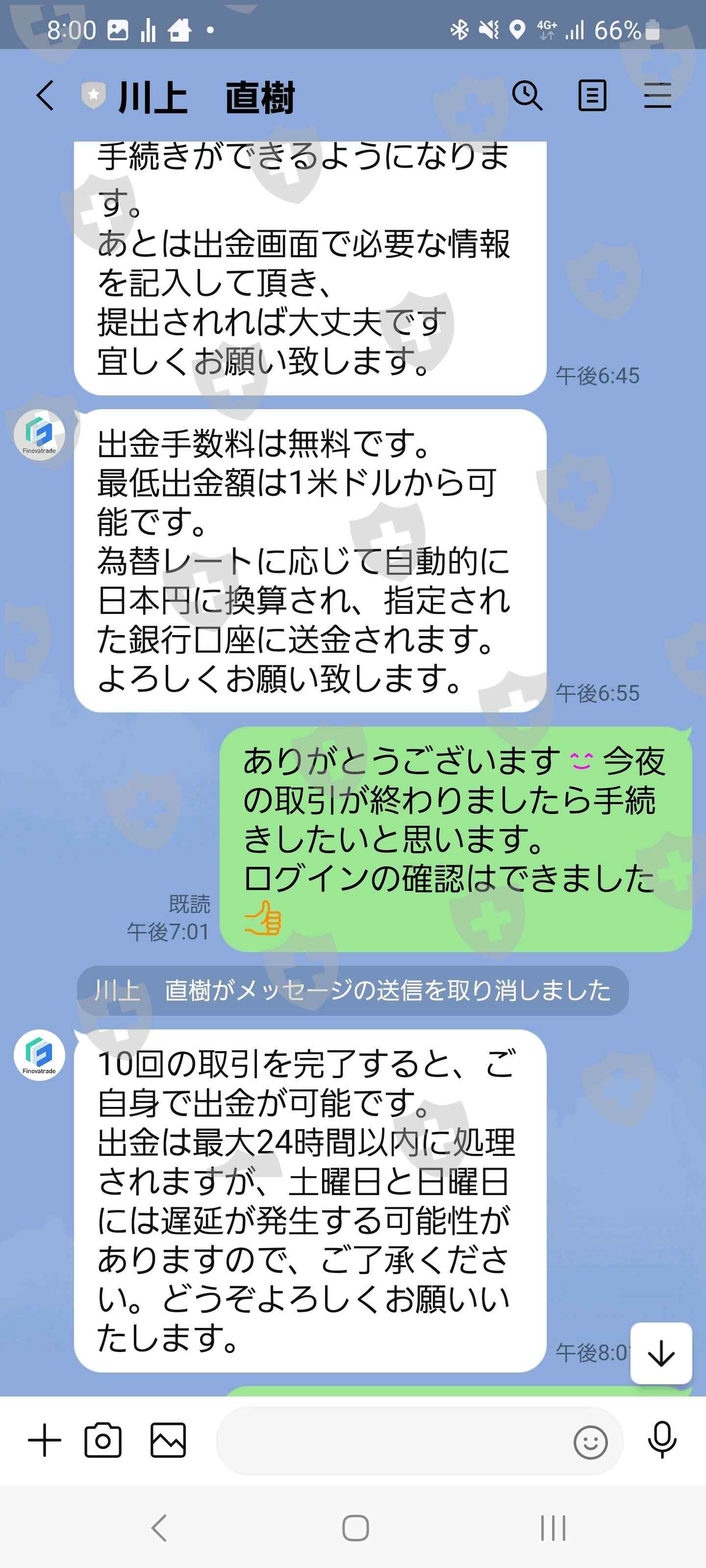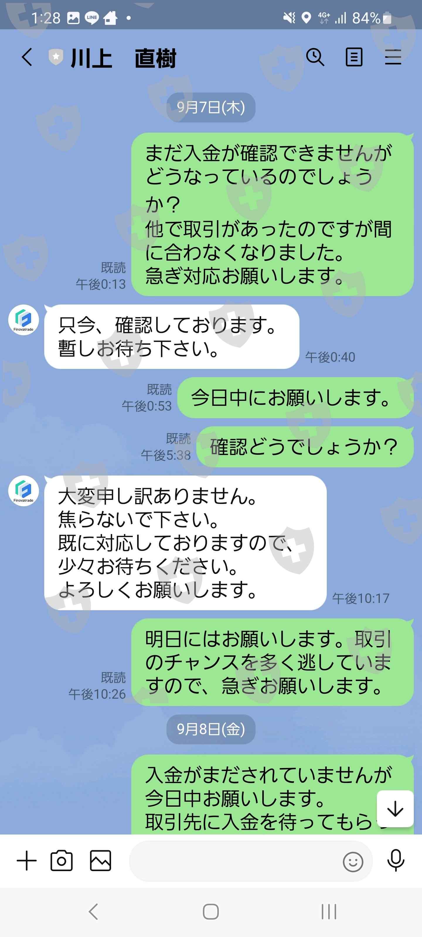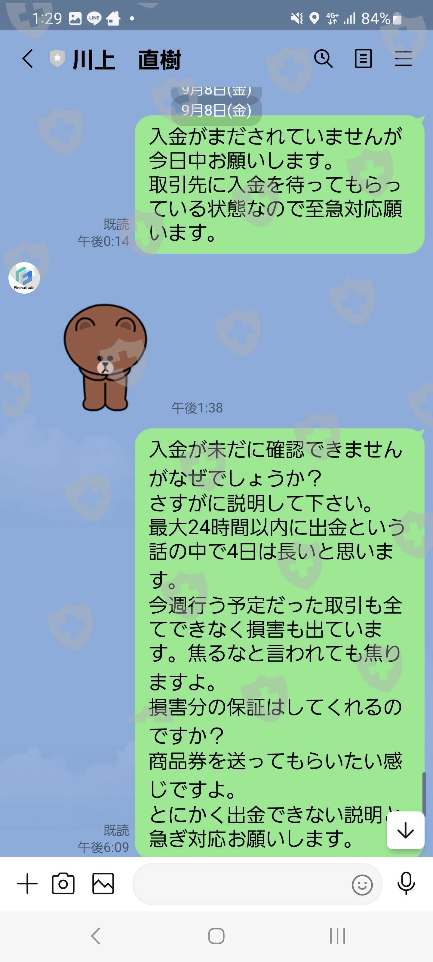 お世話になります。出勤は最長で24時間以内と言われていましたが全額出金の手続きをした所、1週間半以上立っても入金がありません。担当の方は、調べて連絡しますや対応していますと先週ありましたが、今週は既読にもなりません。finovaのサポートにもメールしましたが連絡がありません。出金の手続きを間違えたのかとも思いましたので、審査中になっている出金手続きを取り消し依頼しましたが担当とfinovaから連絡なしです。入金がないと戻ってくるのかも心配な為、ご協力お願い出来ますでしょうか?よろしくお願い致します。必要な情報などありましたら連絡下さい。