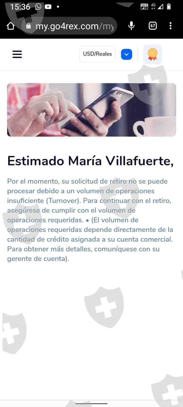 Expongo el caso de mi madre, una mujer de 65 años jubilada, GO4REX llegó a su vida a través de un anuncio publicitario en Facebook, a través de este anuncio se reprodujeron videos publicitarios con "testimonios" de gente que ganó dinero con esta plataforma. Posterior a esto se le realizaron llamadas de supuestos asesores persuadiendola a invertir con ellos, se le indicó que únicamente debería depositar $500 dólares y se le duplicarían sus ganancias, posteriormente, ella accedió y facilitó datos de su tarjeta de crédito a través de una llamada, progresivamente realizaban cobros acumulando un total de $3000 debitados de su tarjeta de crédito. Acaba de contarme lo sucedido y recurro a ustedes solicitando asesoría, debido a que se niegan a tramitar el retiro de dinero aduciendo "no cumplir con el volumen de operaciones requeridas", además se le han hecho débitos del capital invertido a razón de "Tarifa de inactividad". Adjunto evidencias a continuación.