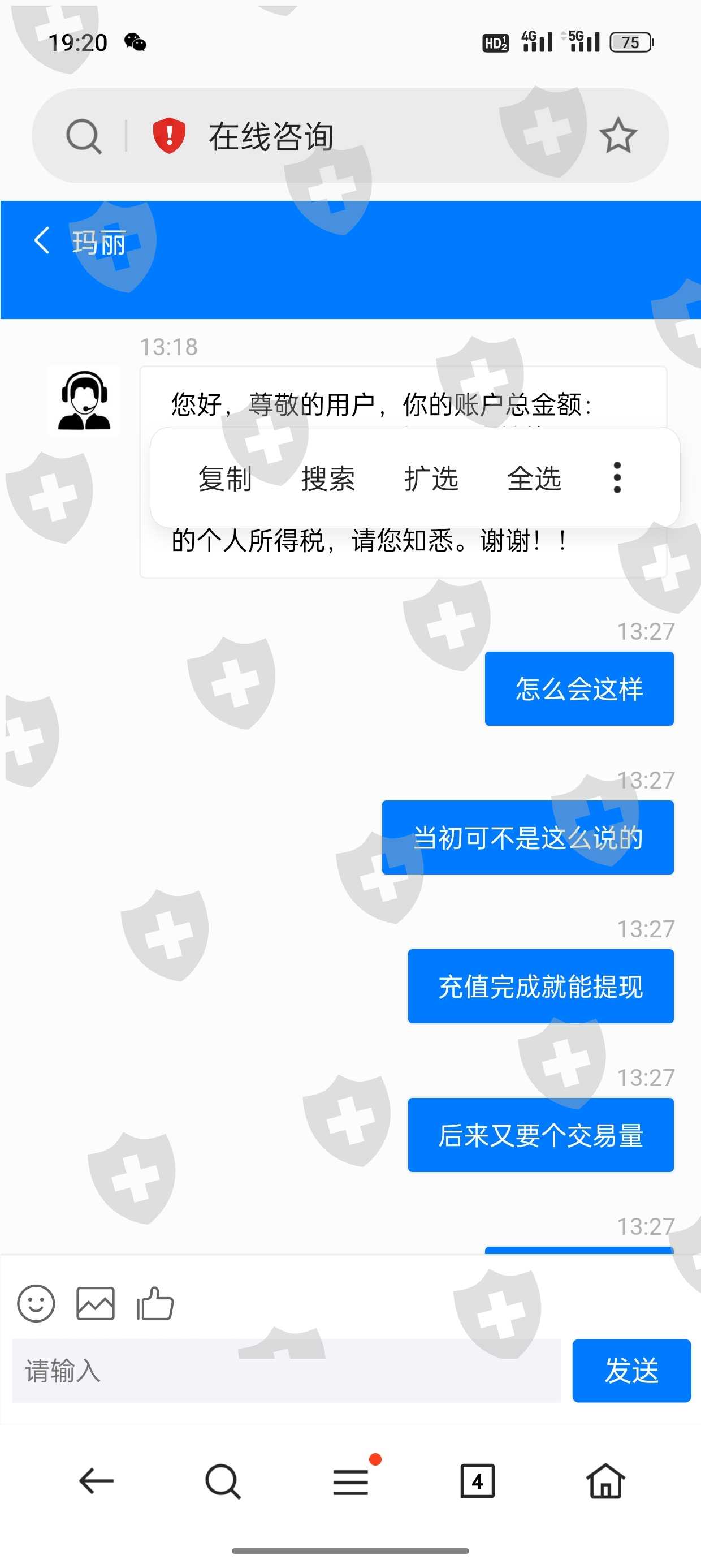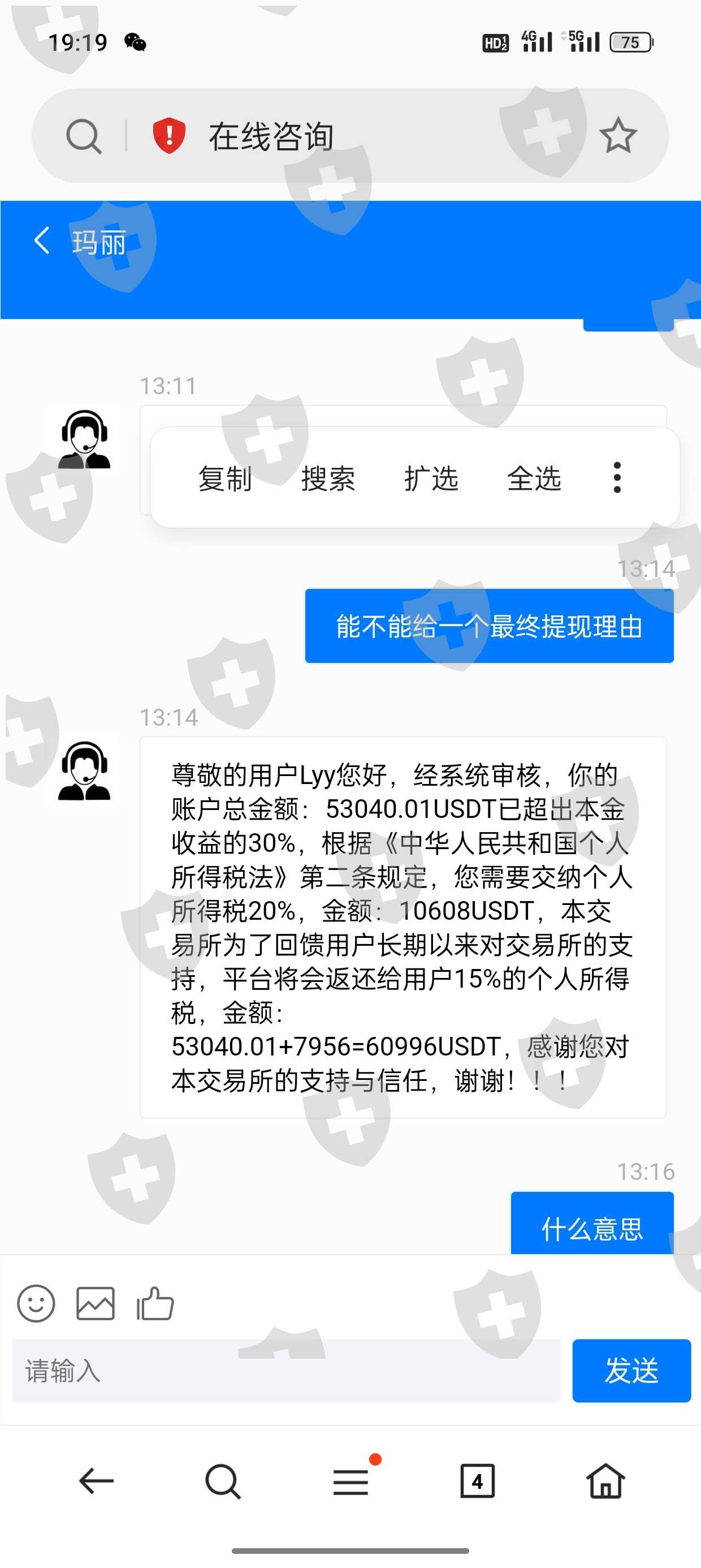 2023年9月2买入15000多u,参加了交易所的情侣活动,当天提现不了,说需要充值13140USDT,充值完成即可提币,9月15号我充值完成,客服说需要打交易量10000USDT,我打了15922USDT,提现又不成功,客服又说需要交个人所得税20%,又让充值10608USDT,不知道充值完成,客服又出什么套路,这是HFM交易所网址,https://sj.hfm66.net.im/vip/