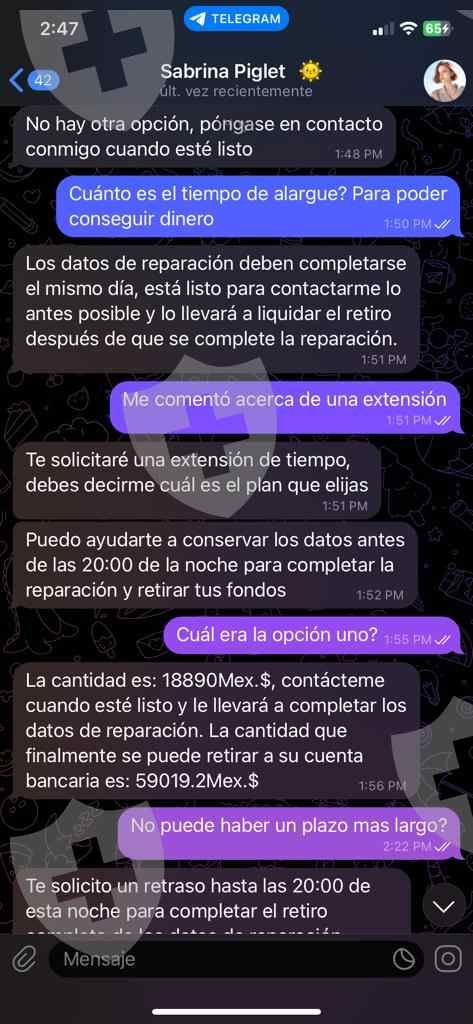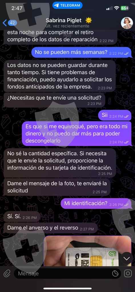 你好,我叫奥马尔·蒙特斯,来自墨西哥。首先他们在 WhatsApp 上联系我,给了我简单的任务评级,然后他们要求我支付 300 美元的押金,以便稍后他们会退还 450 美元,这确实发生了,然后他们又向我要了 1000 美元,在 3150 美元之后, 7460结束,我尽我所能存入了这笔钱,这笔钱本来是要存入加密货币的,但我错误地把它存入了与他们告诉我的不同的货币中,现在他们向我索要 18k,我显然可以因为我不工作而无法收回被冻结的钱。他们给了我今天晚上 8 点的截止日期:(