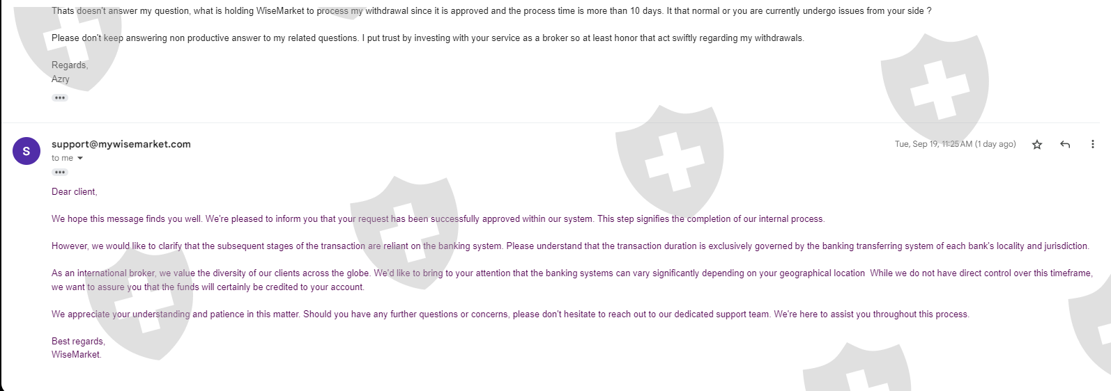 Made withdrawal since 30/8/23 and 7/9/23 for 200$ respectively both approved by their system but up until now no payment made to my bank account. Have been communicating through their support team but unfortunately responds with the same unproductive answers with end up with frustration. Strongly not recommending this broker for forex trading purposes because seems to have few suspicious signs as a fraudulent broker.
