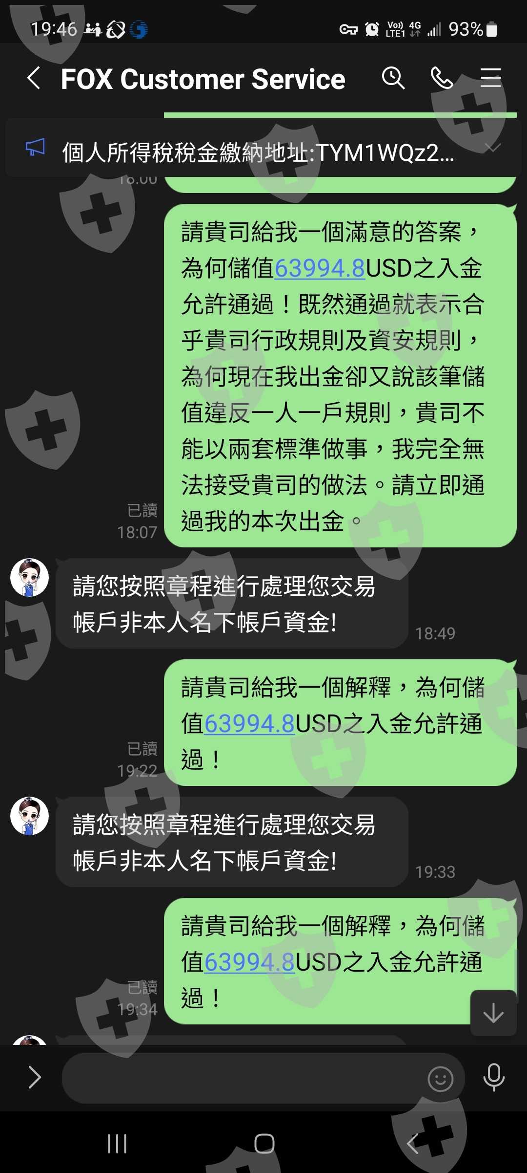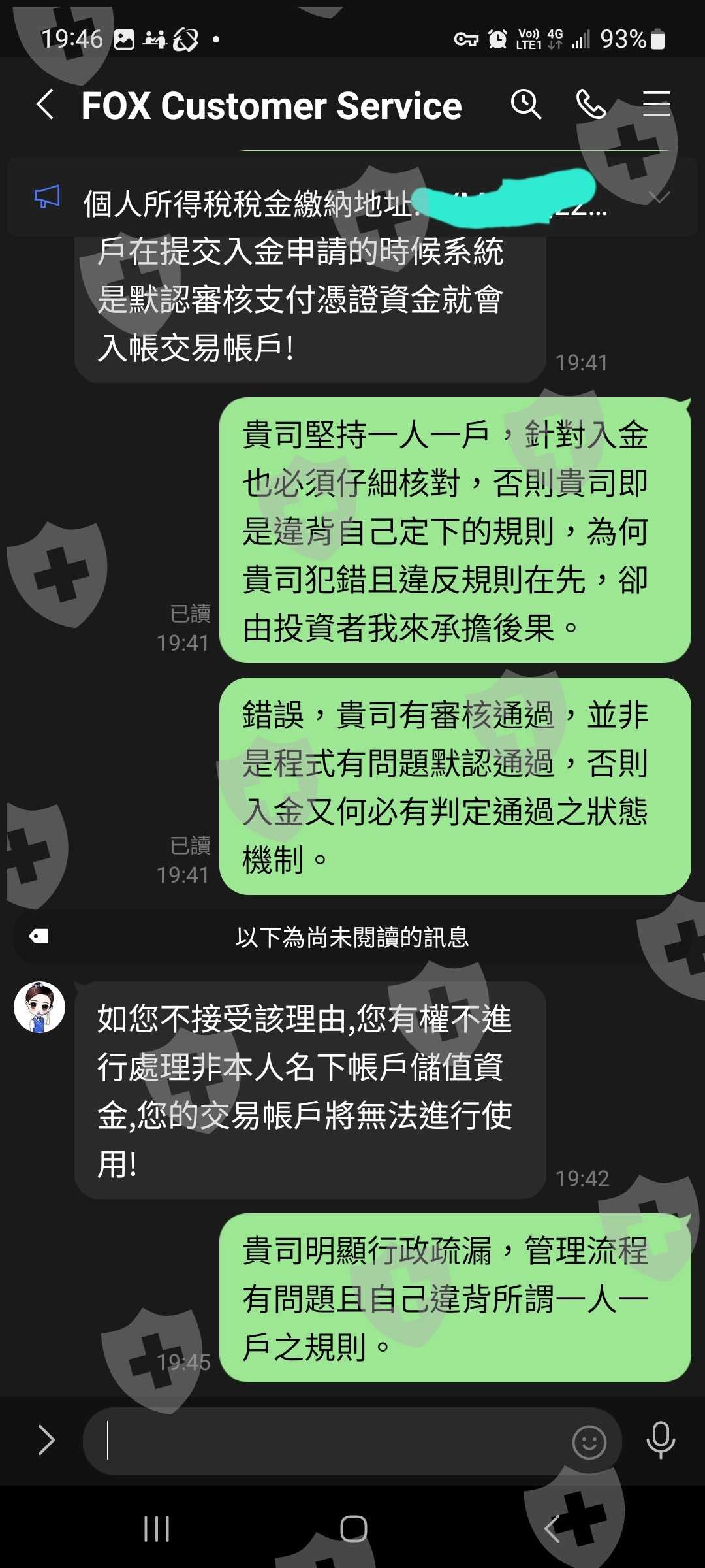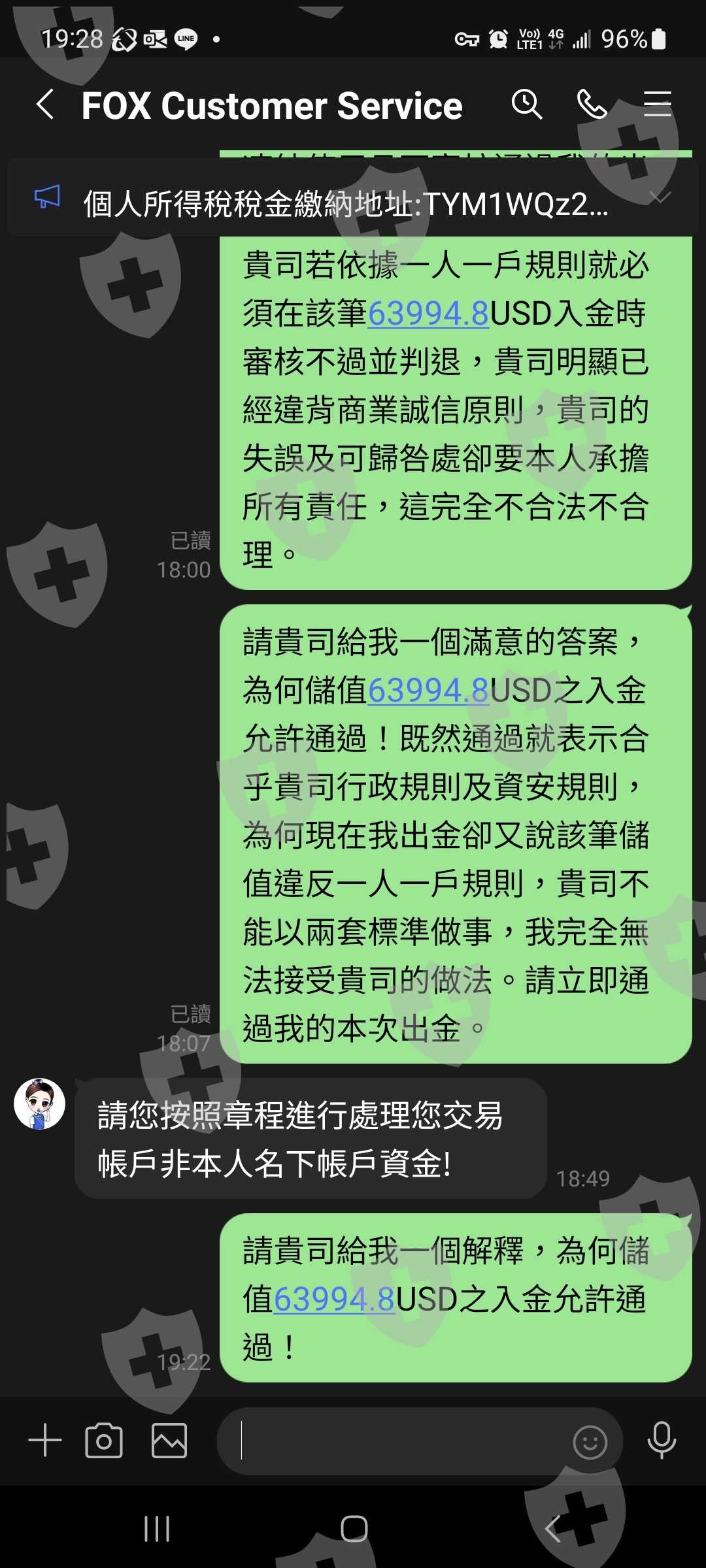 本人正常入金儲值到Fox Global後,開始進行交易並於獲利後申請出金,但該平台要我先繳個人所得稅金後才能通過出金審核,我繳了個人所得稅後不僅無法出金,該黑平台聲稱我的帳戶入金出現一筆非本人名下(錢包約定之地址)儲值,違反該平台一人一戶規則並直接凍結我的帳戶及出金流程,且要我重新對該金額儲值後才能順利通過出金。