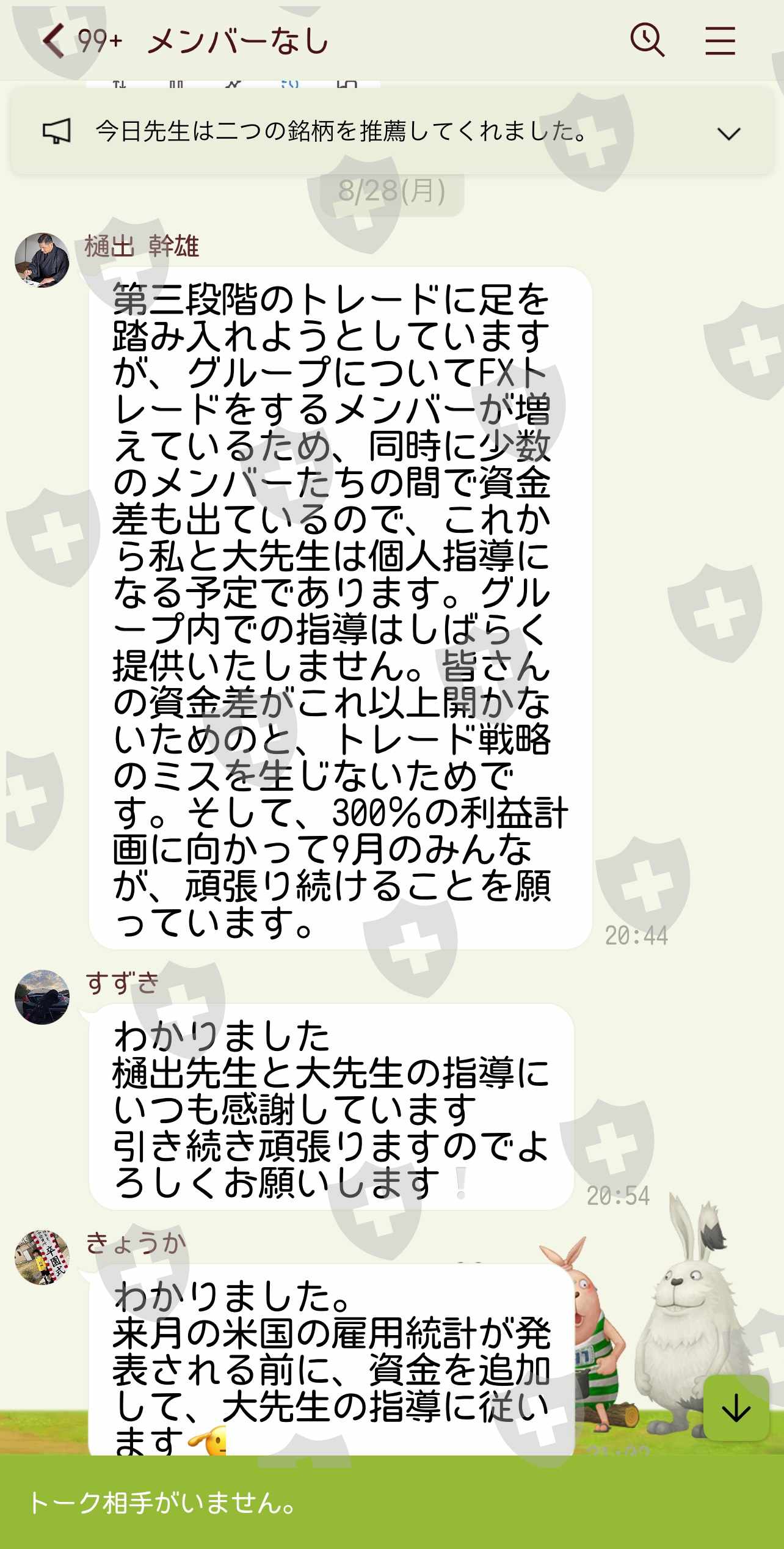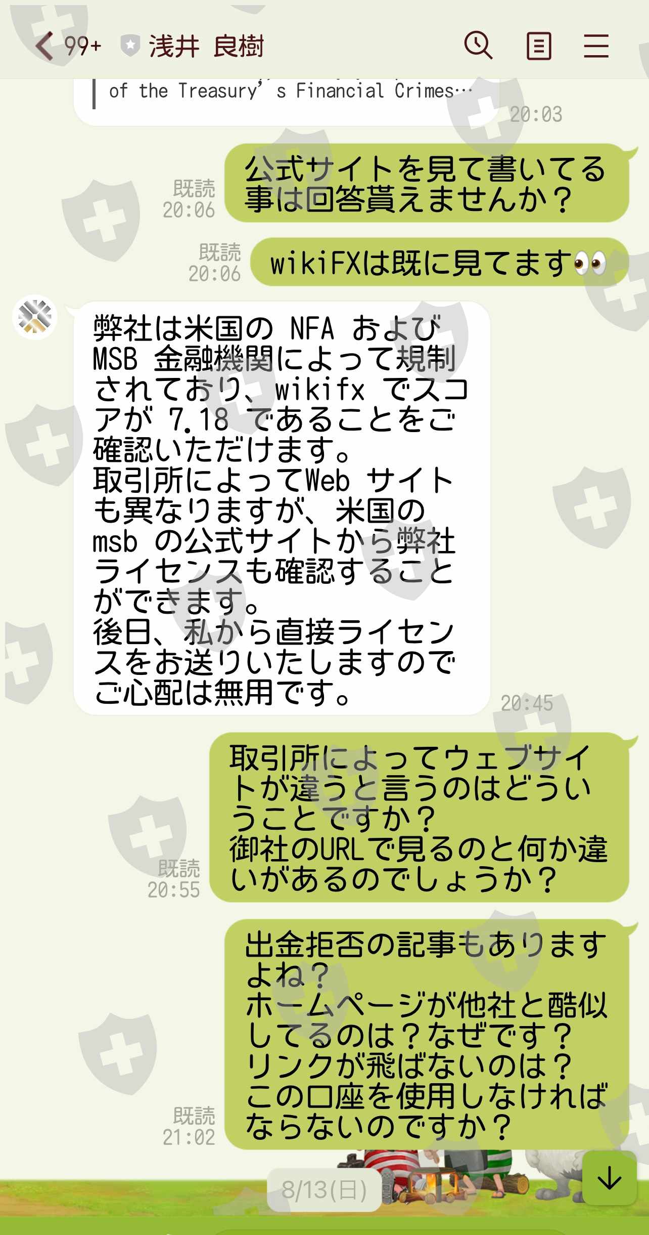 他の方がここに書き込んでいるようになってしまいますが、LINEグループからやり取りが始まり、毎日株式の話や経済状況をついて話をしていて、FXの話になり、指南する先生と呼ばれる者がポジションやlot数の指示をLINEで提示、みんなそれで利益を得てスクショで取引結果や入金の明細を貼っていた。これら調べていながらも半信半疑で取引を始めてみようとしましたが、他の口座ではスプレッドの違いとかlot数やレバレッジの統一がどうのこうの言われ誘導されたブローカーの取引所で開設する話になった。調べて怪しい所などそ口座開設のブローカーとも暫しやり合ったが結局解説して半信半疑のまま少額の入金で始めました、勝つは勝つんですよ(笑) チャートの操作でもしてるのであろうと他の主権会社のチャートと見比べながらやってみてましたが、所詮上か下なので誤差があっても明らかにチャートの操作は判り切らなかったし、この進行時期の併せて少しずつこの詐欺の話が現実味が色濃くなってきたなと思った時には遅かったですグループLINEも消えて個別の連絡も全て誰も既読になりません。いい勉強になりましたが半信半疑でやっていても少々欲を出した分勉強代がちょいと嵩増ししました汗