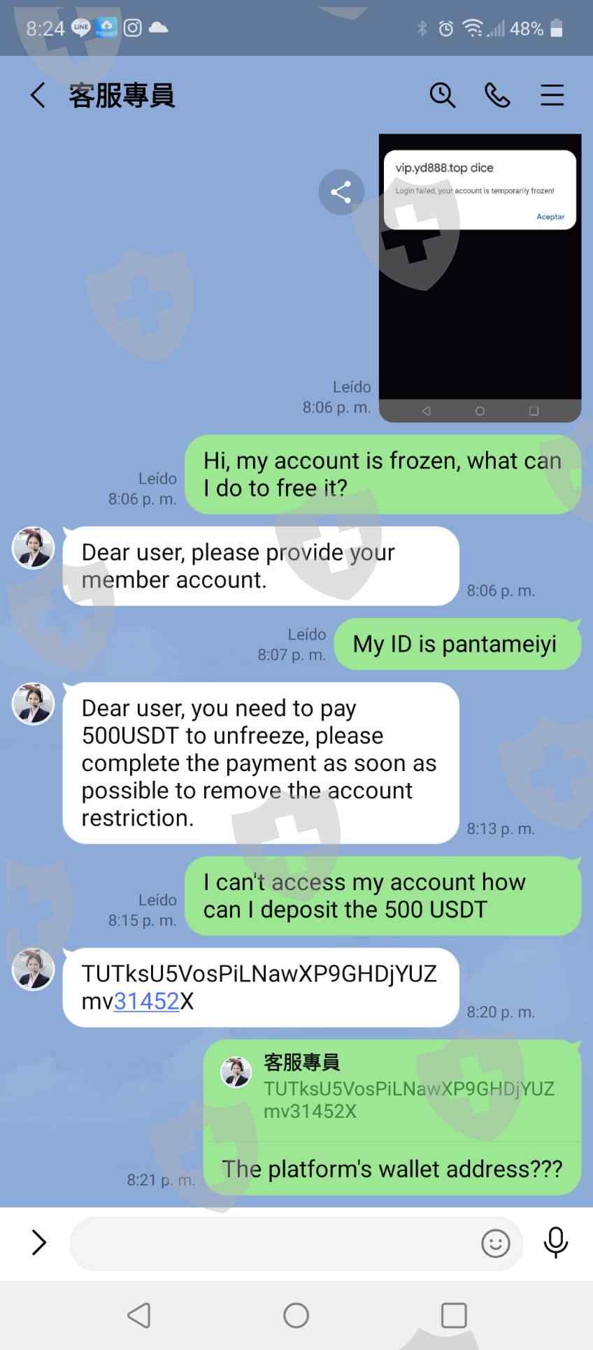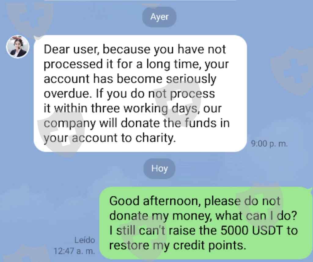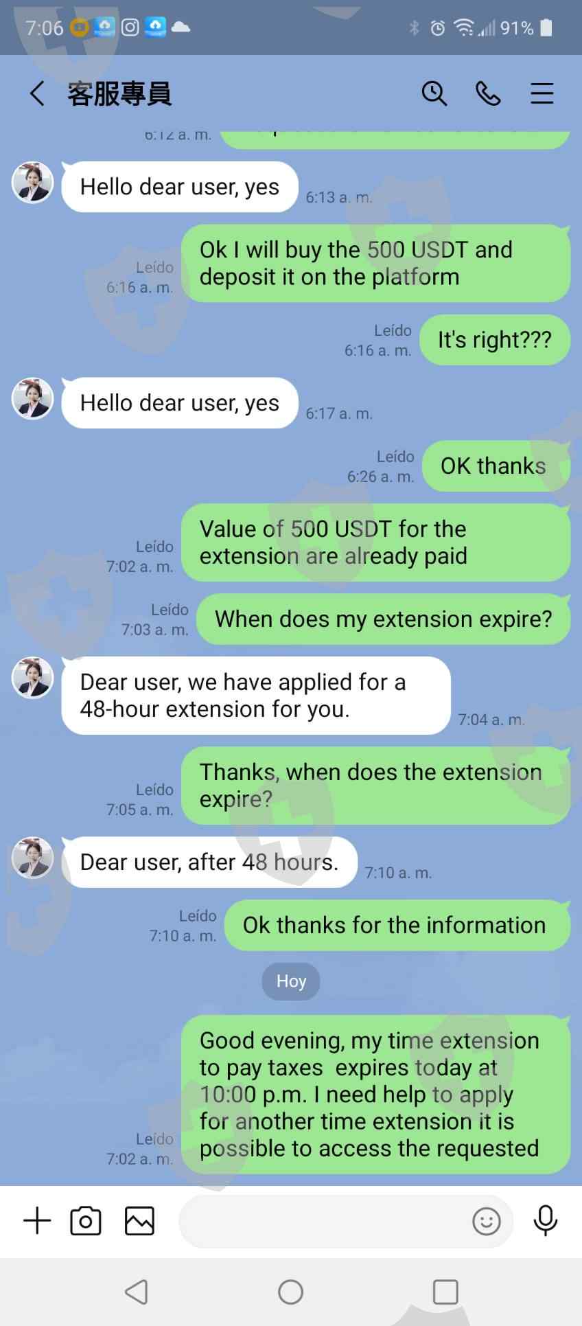 我在这个平台上已经3个月了,他们在不同的时间操纵让你赚取不成比例的收入,他们让你尽可能多地通过交易所充值USDT,同时他们只允许你进行3次小额提款,在当我以GAS NATURAL货币完成投资时,我正准备提取我的利润加上投资的26,000美元,信用卡和银行贷款的钱,客服告知我必须在2017年向台湾财政部支付10%利润税是289,000 USDT,我要缴纳大约28,000 USDT,税费已经缴纳,当由于一系列价值500 USDT的付款和延期请求而试图再次提款时,他们扣除了50现在我想提取我的钱,他们不允许我,因为我必须恢复我的信用点,他们要求取消 5000 USDT 才能恢复我的信用点。我认为自己完全被骗了,因为目前提供的投资顾问当我投资 GAS NATURAL 货币时,我没有被告知平台的规则,而是被告知在什么时间通过购买 600 秒进行交易,并通过以 USDT 购买的加密货币产生利润,通过兑换转账存入平台账户服务 告知客户如果不恢复积分,赚到的USDT加上购买USDT借出的钱都会捐给慈善机构,你选择语言,注册后就进入平台. 平台环境. 他们工作的平台. 货币. 就我而言,投资顾问诱导我投资GAS NATURAL 货币. 你购买600秒并等待结果,你的利润会累积,平台的投资顾问告诉我您操作的时间和日期,这样您总是赢,该平台旨在从用户那里获取所有可用资金,努力遵守规定,以便能够提取所有投资资金,千方百计满足客户服务需求,他们支付了500 USDT延期,账户也被额外支付了500 USDT解冻,从一开始他们就不解释平台规则,让你陷入漏洞为了让你无法在他们规定的期限内取消金额并拿走你的钱和所谓的利润,我在tik tok上遇到了该平台的顾问,她在其中分享了她的LINE ID,你联系了她,她开始诱使你堕落陷入平台的陷阱。
