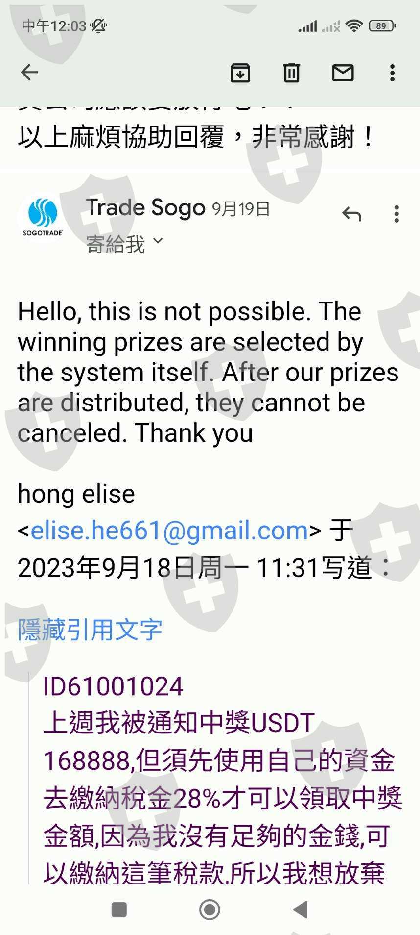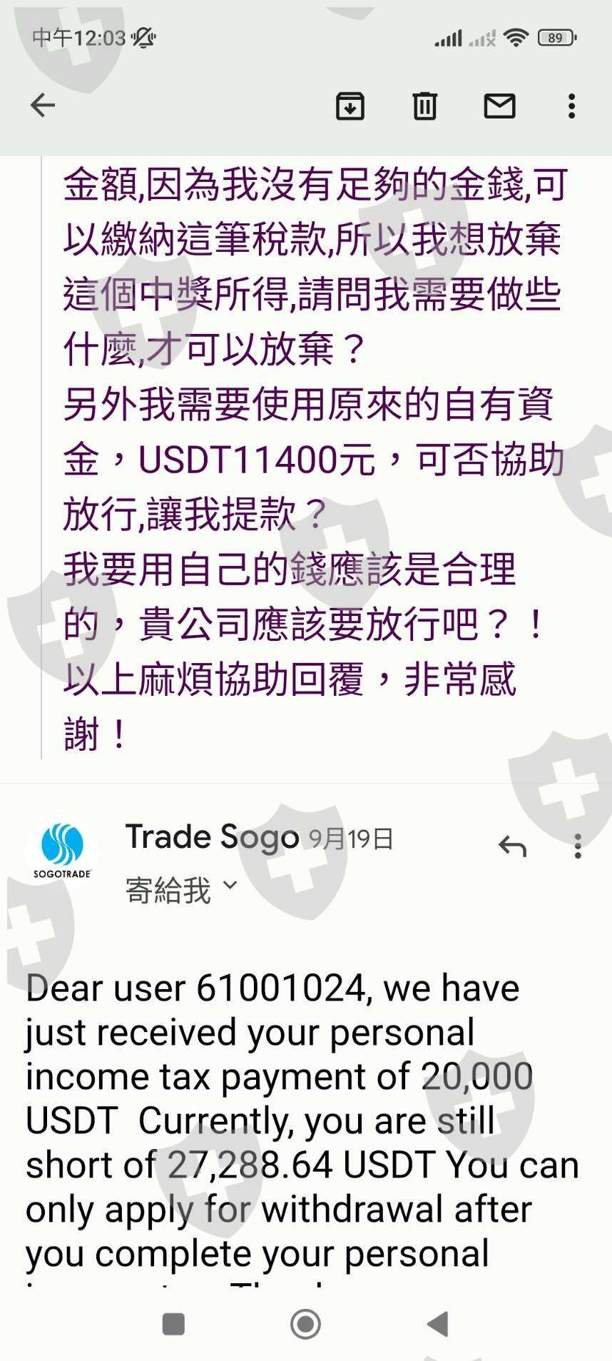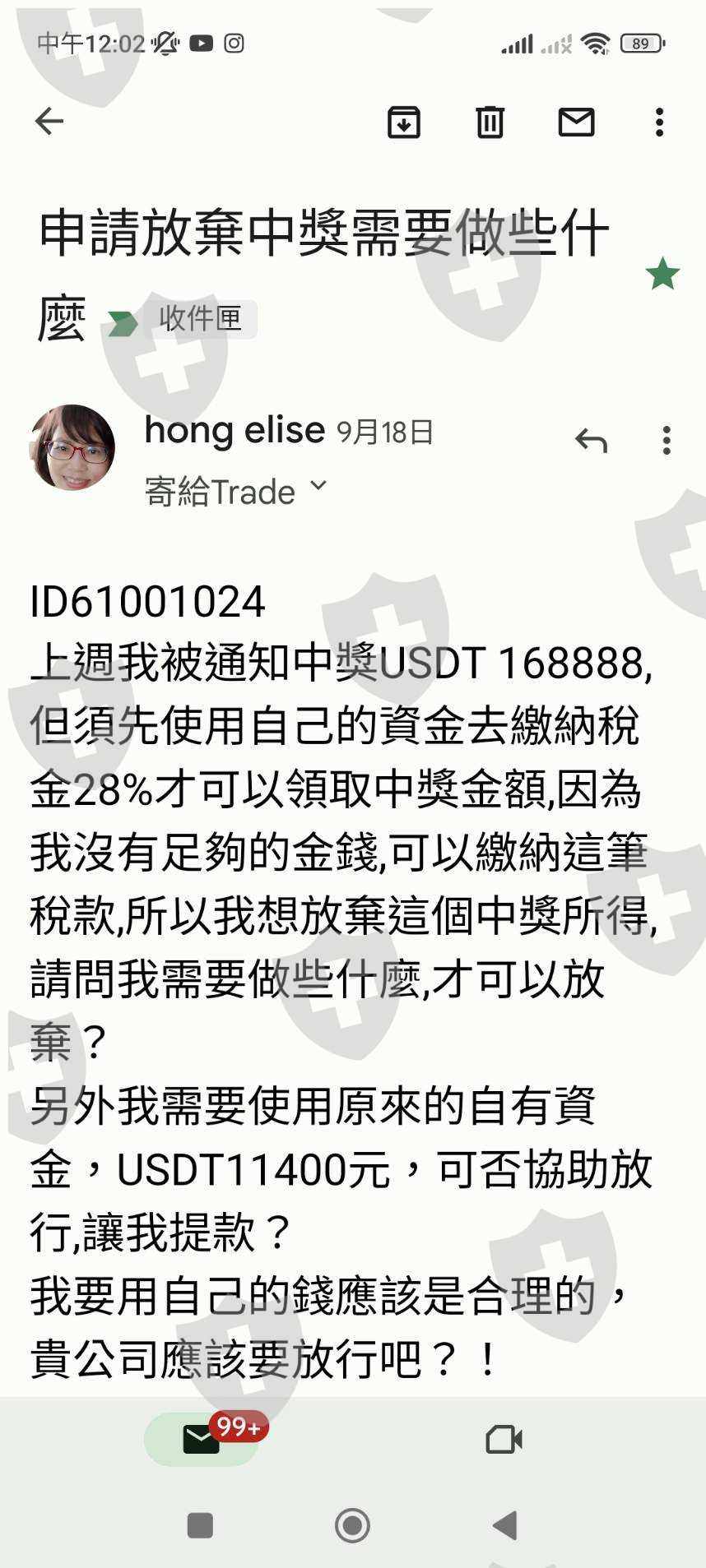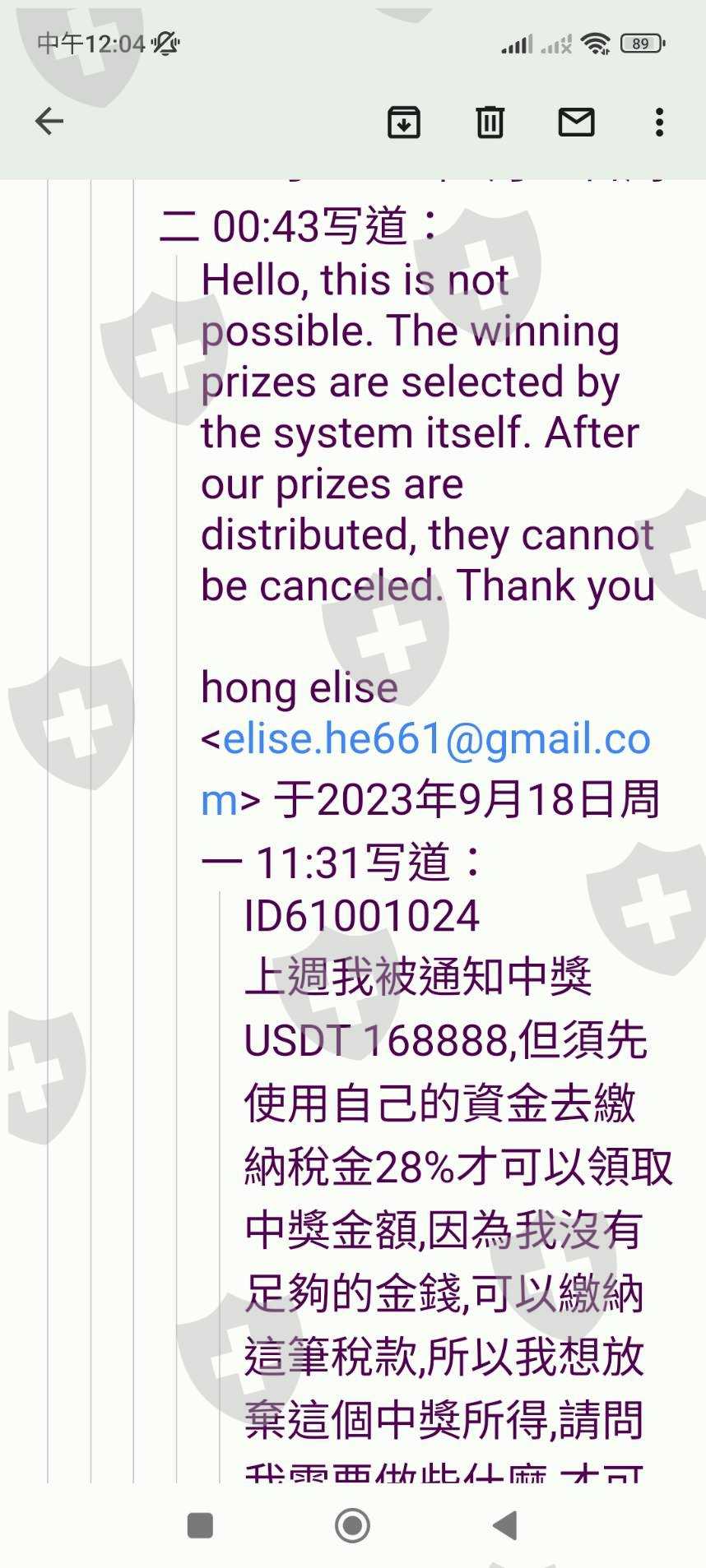 email詢問後,得知我中獎了!然後我詢問中獎需要做些什麼嗎,對方才回覆我需要繳28趴的稅金到聯合國的管理單位.經過衡量我並沒有能力繳納28趴的稅,所以我回信告知要放棄中獎,他們說不能取消,不能放棄,只能繳納完稅,之後我的全部資金才可以使用。在這段期間,我的所有自有資金全部被凍結.之後我再三去函告知這是不合理的,對方回信永遠是叫我繳納完税才能動用。後來有一個朋友剛好手上有usdt,他就幫我講那個28000元左右的税,但後面也不夠錢,所以現在還是一直被卡著。