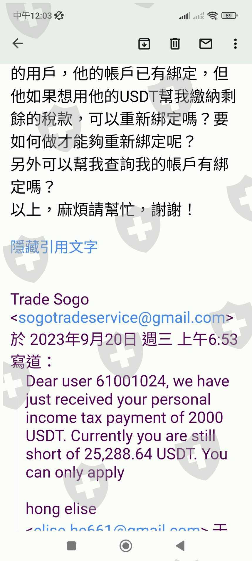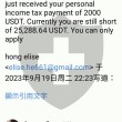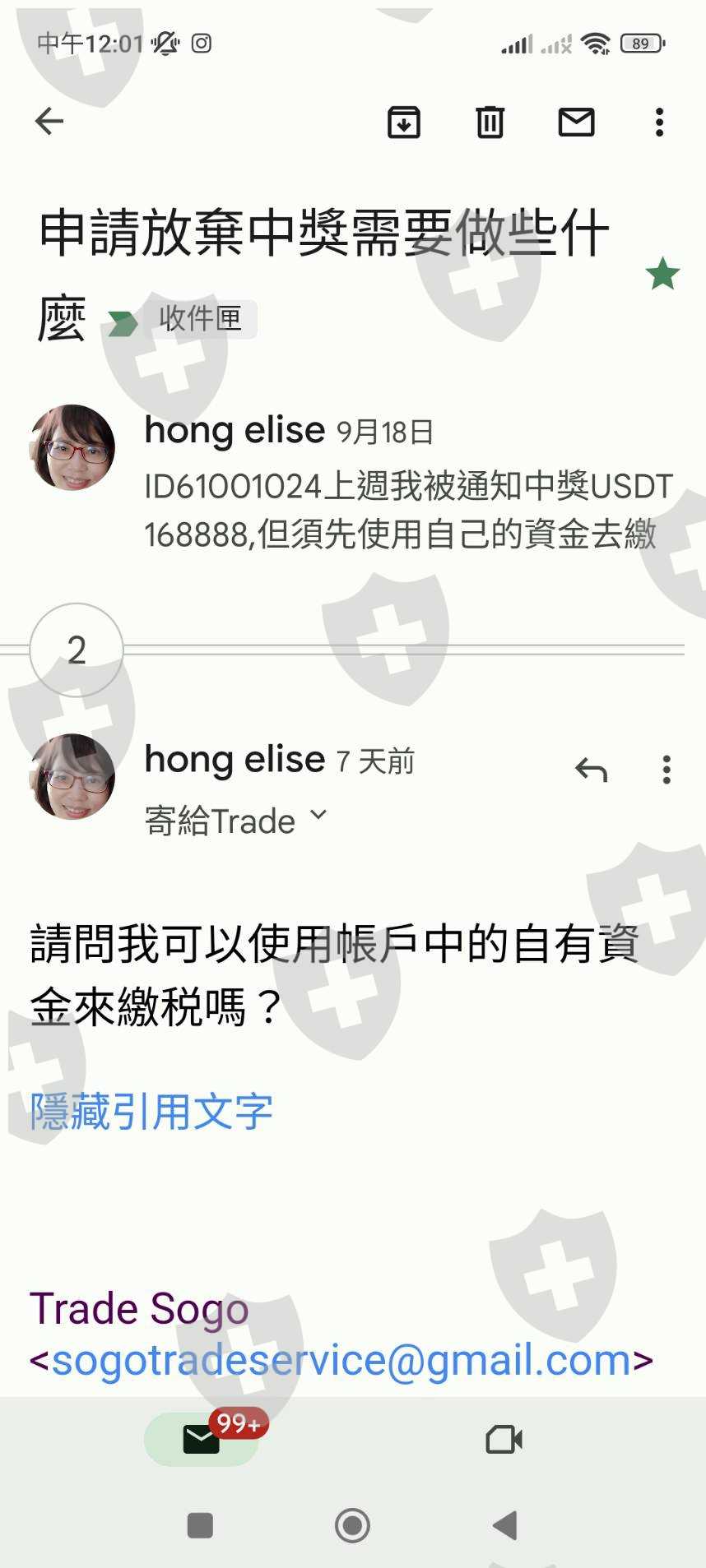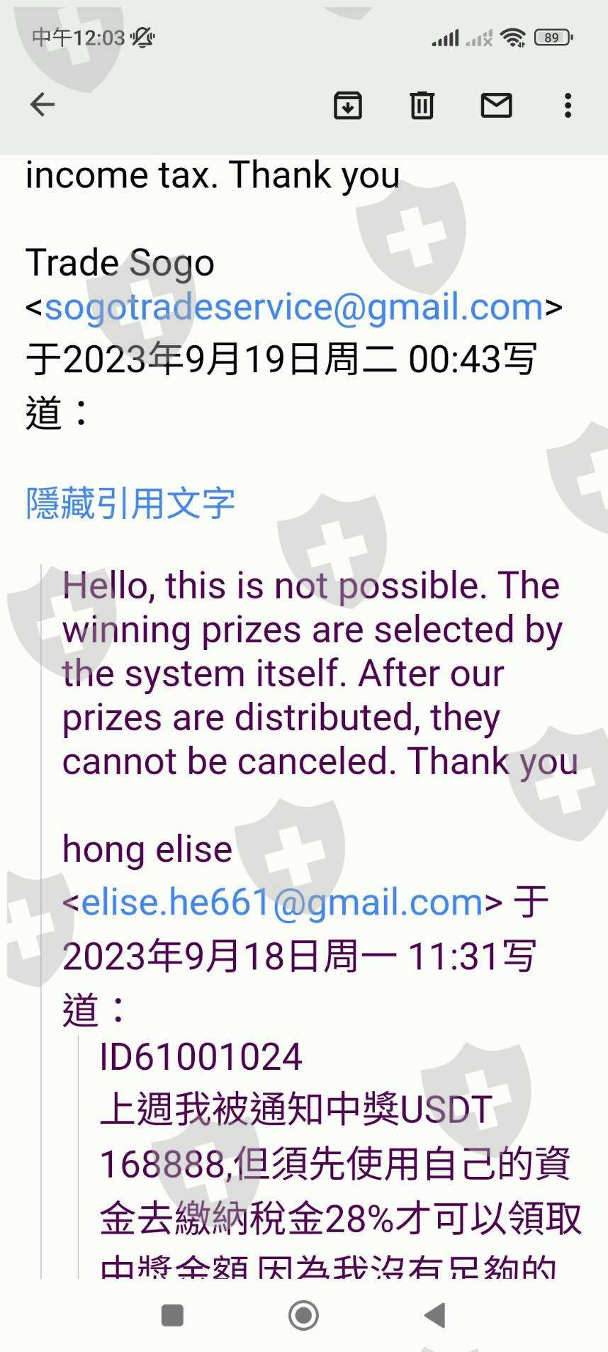email詢問後,得知我中獎了!然後我詢問中獎需要做些什麼嗎,對方才回覆我需要繳28趴的稅金到聯合國的管理單位.經過衡量我並沒有能力繳納28趴的稅,所以我回信告知要放棄中獎,他們說不能取消,不能放棄,只能繳納完稅,之後我的全部資金才可以使用。在這段期間,我的所有自有資金全部被凍結.之後我再三去函告知這是不合理的,對方回信永遠是叫我繳納完税才能動用。後來有一個朋友剛好手上有usdt,他就幫我講那個28000元左右的税,但後面也不夠錢,所以現在還是一直被卡著。