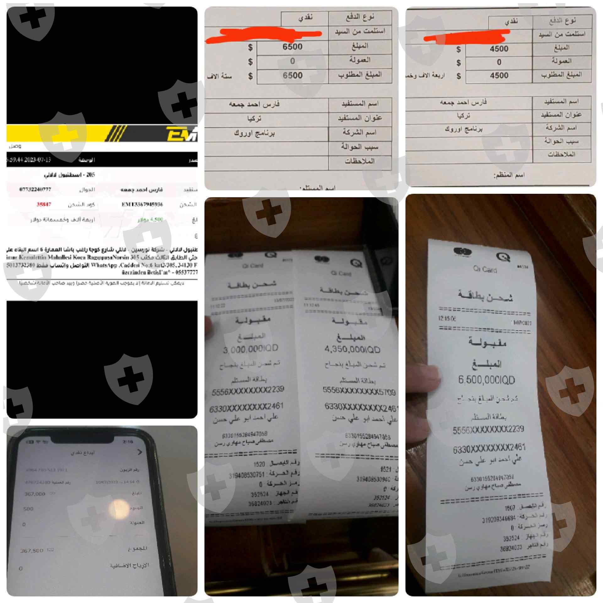 اوهموني ب ايداع مبلغ 30000$ على منصتهم شركه المشرق الموجوده بالامارات وانه سيحقق ارباح 60000$،ولم يتم تسليمي اي شي،محتالين وهذه ارقامهم والتحويلات المرفقه بالصور واسم الشخص الذي تم له التحويل في تركياالذي يتبع لهم واخر في العراق تابع لهم،وارقام بطاقاتهم مرفقه بالصور واليكم احيل شكواي