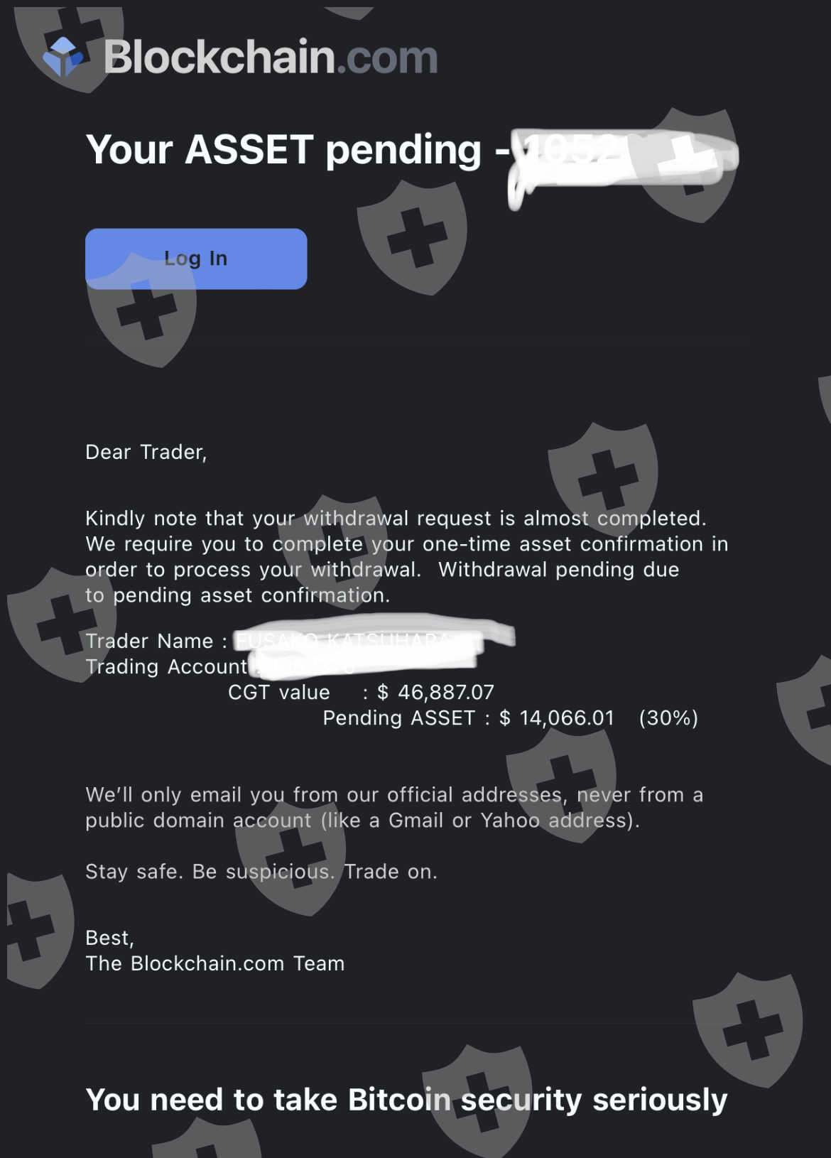 ブロックチェーンを名乗る、総出金額と保留額の書かれたメールが来る