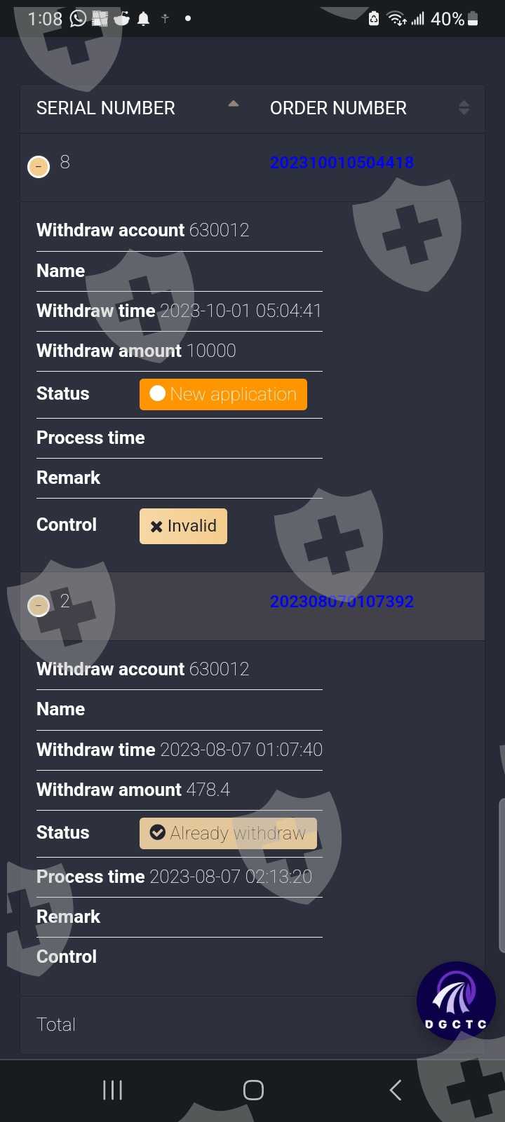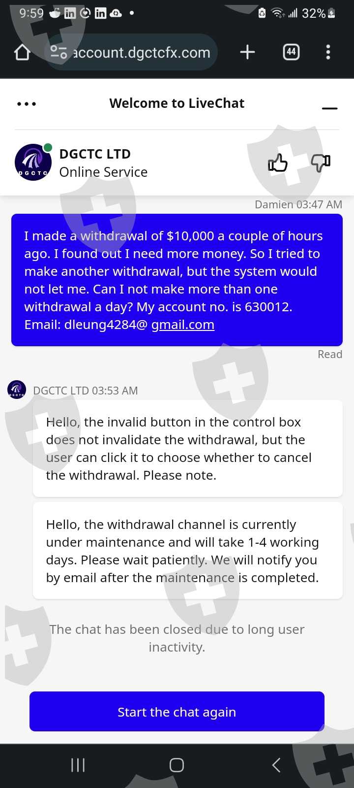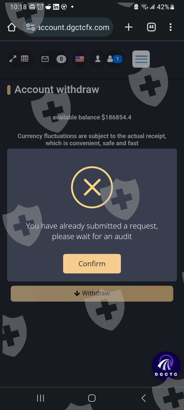 I have $185000 invested with DGCTC. Early this morning, I tried to withdraw $10000. The request went through but pending approval. Then I tried to make another withdrawal but the request did not go through. The site said for me to wait for audit. Then I messaged the online chat and they reply is that the Withdrawal site is under maintenance that will take 1 - 4 working days. I suspect fraud.
