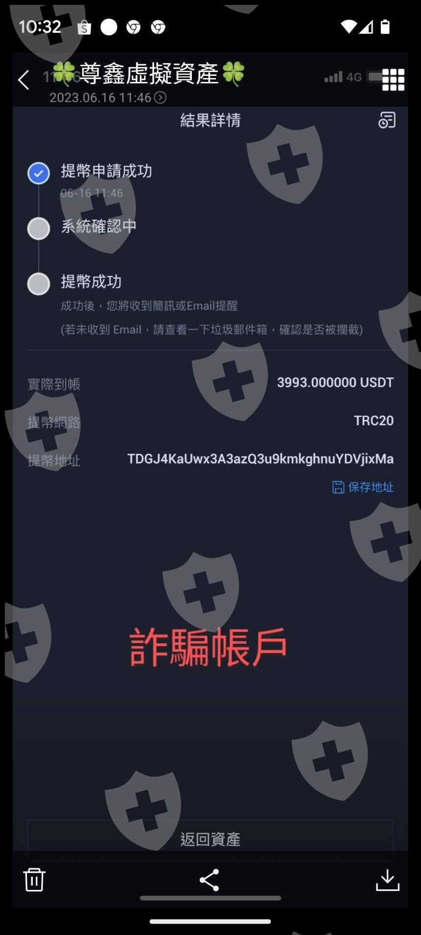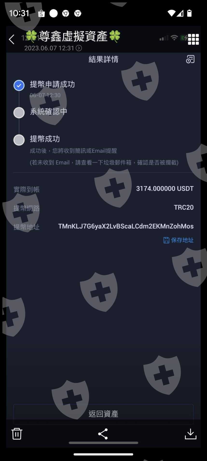 當初加入的平台是m.fpmarkpro.com,入金的方式是永道-沈夢瑤請我們加入LINE暱稱”尊鑫虛擬資產”的人,這是火幣商(虛擬幣U商),我們將台幣現金面交給U商後,他們給我們USDT幣,然後我們再儲存到自己的TRC電子錢包地(TMnKLJ7G6yaX2LvBScaLCdm2EKMnZohMos)。我在112/6/7開始分批存五筆,共NT 300萬,因為操作期間有賺的錢需繳交佣金給劉專員,當時給NT 125,000元(3993U)是存到劉專員說的詐騙帳戶(TDGJ4KaUwx3A3azQ3u9kmkghnuYDVjixMa)。112/6/16儲值後已達大戶圈(300萬以上),所以當天他們就請我改成到m.fpmarkpro.vip平台做出、入金操作,因為他們說等級不一樣了。結果當天晚上群組內有位張克增,他表示他朋友有在玩比特幣,今天112/6/16(星期五)的時機非常好,他說反正還沒有做原油操作,您先玩一下比特幣也沒關係,因為群組早期就認識張克增,不疑有他就跟著操作比特幣。在操作當下覺得很奇怪,帳戶一直在賠錢,當時也有問他發生甚麼事,但為時已晚,帳戶已全賠光,還變成負數(負數約換算成台幣為100萬),當下很緊張就跟助理-沈夢瑤說明,沈說:你沒跟著陳老師操作,你的帳戶負數要快補上,不然平台會向法院告您,因為當時很緊張,所以就趕快籌錢補上帳戶負數金額。故我在112/6/21又跟U商換NT 150萬(47923U),然後再入金到我的平台帳戶。其中100萬是補上賠錢的100萬,50萬想再繼續投資賺回我失去的錢。所以我從112/6/21又繼續操作原油投資,因為金額少,所以每天都要給佣金45%,故112/6/22從兆豐銀行匯款到台新銀行(2888-1010-5376-09)-NT 18,803元、112/6/23從兆豐銀行匯款到台新銀行(2888-1010-5376-09)-NT 19,437元、112/6/27從兆豐銀行匯款到土地銀行005(0000064005380276)-NT 20,846元。其實在112/6/26我就覺得永道公司的行為有點怪怪的,所以112/6/27我有試著出金700U到我兆豐銀行,當時收到700U(台幣NT 21,987元)到我兆豐帳戶,但非常的慢才收到,我收到的是112/6/28從台新銀行(0000263540198824)匯款到兆豐銀行。後來112/6/27投資老師-陳華峰就說,你投資金額少,這樣一直給抽成你也覺得麻煩,我看你還是退出好了,剩餘所有金額你都可以提領走。因為當時我也急著用錢,後來想想就乾脆退出,所以我在112/6/28有申請出金全部餘額到兆豐銀行,正常來說應該112/6/29可以到我指定的兆豐銀行戶頭,但112/6/28晚上7點多我就覺得LINE群組怎麼沒在操作原油投資,當下就覺得好像被詐騙了,所以趕快上平台去看我的帳戶是否沒問題(m.fpmarkpro.vip)?後來才發現平台也無法再上去了,我就肯定自己被詐騙了,所以就趕緊跑到桃園分局報案。