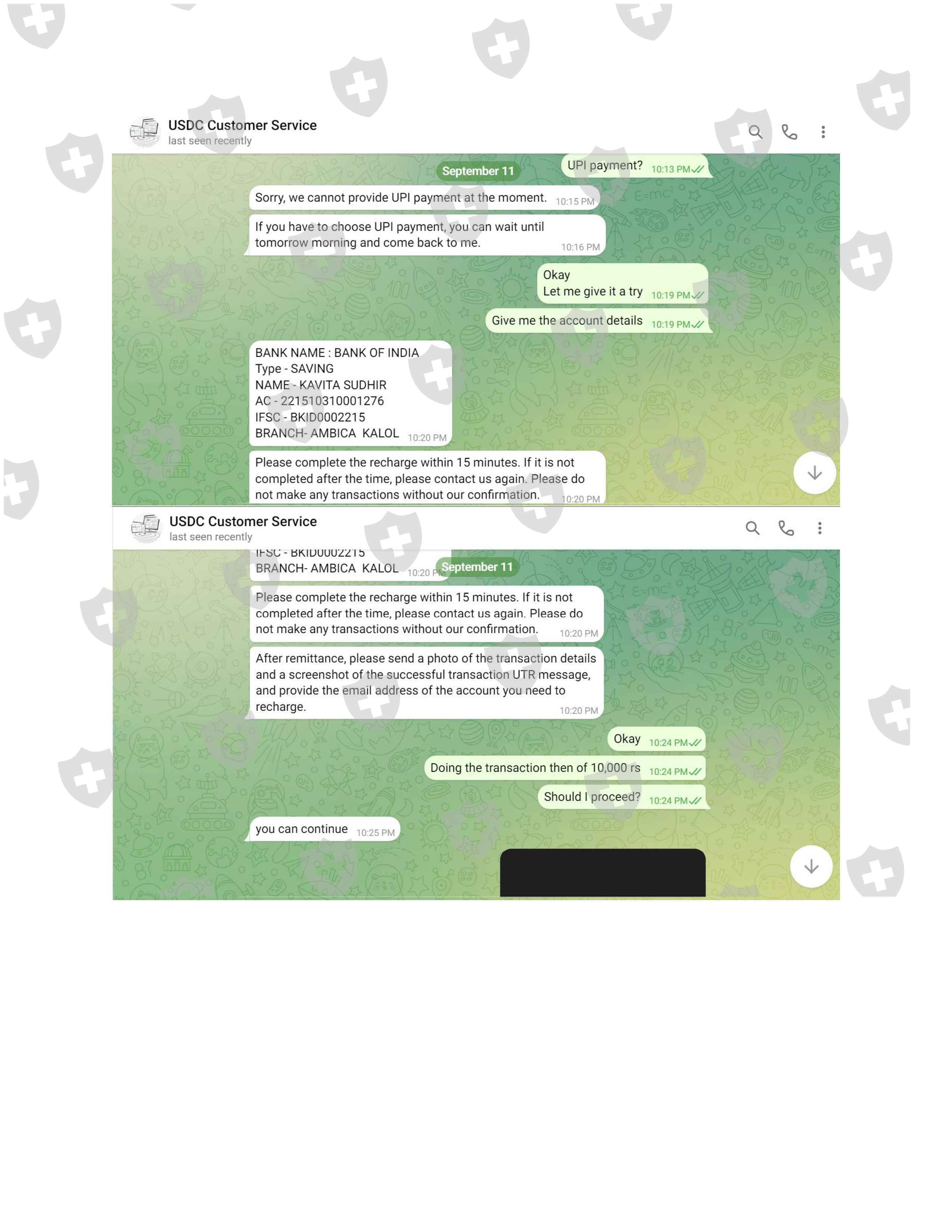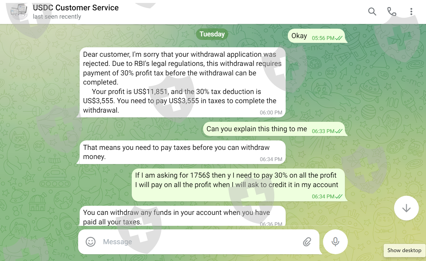 2023 年 9 月 11 日,我下载了Smartrade5 (https://apps.apple.com/us/app/smartrade5-plus/id6461349760) 的应用。这个应用是Simran Kaur 女士推荐的,公司名为 USDC Investment Limited,是一个外汇交易平台。我于 9 月 11 日在该平台上进行了模拟交易,并在同一天在同一平台上开设了账户。然后,Simran Kaur 女士建议我通过电报 (https://t.me/USDC_FX_07) 联系 USDC 在线客服,查看我的姓名验证过程并为我的账户充值。她说客服会给我发一个卡号,然后我应该用 IMPS 转账,在线客服会帮助将卢比兑换成美元,并将金额转入我的平台账户。我给账户充值了 10000 卢比(125 美元),做了一笔交易,获利 12 美元并出金。然后她让我增加本金,看到出金和盈利,我又增加了 50000 卢比的本金。然后我又出金 100 美元。在这之前,一切都很顺利。然后,Simran Kaur 女士再次要求我增加本金,以赚取丰厚的利润。她强迫我借个人贷款,我上了她的当,借了 10 万个人贷款,并把钱投资到 USDC Investment Limited 平台。之后,我赚了一些钱,但没有出金。9 月 26 日,我申请出金 600 美元。但在线客服告诉我,我的出金申请被拒绝了,因为在出金申请期间,我的账户有交易变动。我再次尝试出金 1756 美元,但这次在线客服又以新的理由拒绝了我的出金申请。这次他说,由于 RBI 的规定,这次出金需要支付 30% 的利润税才能完成出金。当时我的利润是 11,851 美元,而在线客服要求我预付 3,555 美元给他。这对我来说没有任何意义,因为在出金时,平台可以扣除税款并提取剩余金额。但在线客服仍要求我向平台预付税款。现在我无法使用账户余额中的金额。平台网站的链接是 (https://usdc-vipfx.com/),现在我请求上级部门为我提供一个解决方案,如何将我的平台账户余额转入我的银行账户。我现在毫无头绪。预付税款是否合法?请给予帮助和支持。我现在经济不稳定,因为还要偿还我的个人贷款,我没有钱支付我的 EMI。