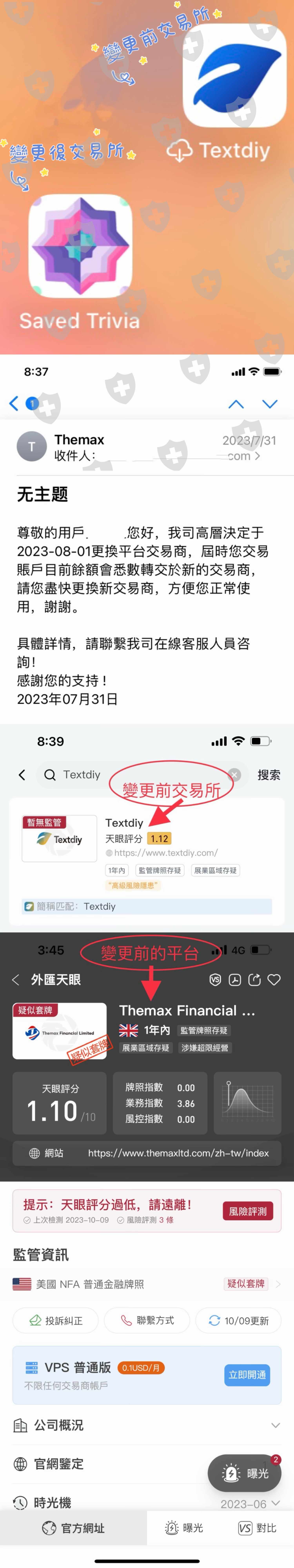 1、我是詐騙平台NYFX(交易所:Saved Trivia)受害者,前期交易所是:Textdiy (平台:Themax)於2023/7/31收到更換交易所的郵件.