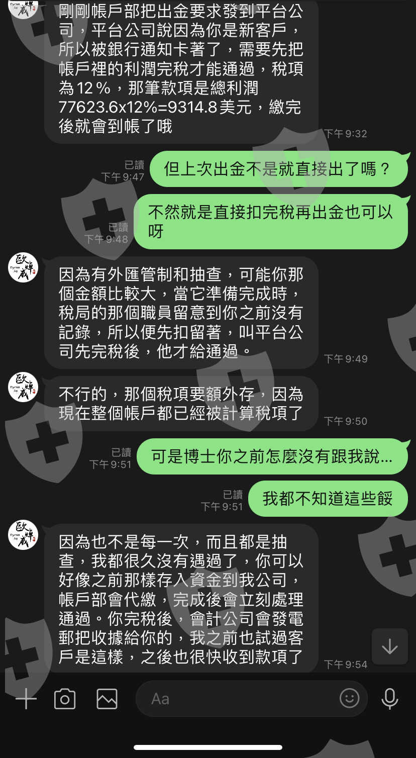 剛開始接觸是因為在交友軟體認識的人,他介紹一位稱作是交易總監的歐博士給我,說可以幫忙進行外匯交易,然后就用了他們公司提供的MT4平台交易,最初那位歐博士說要最低本金1000美才能開始進行交易,所以我當時就入了1009美進去,當時交易了一週,我就嘗試出金,當時只出了160美,有成功取出;之後博士在一天問我要不要參加平台的活動,說儲值50000會送20000美,但我沒那麼多錢,所以博士就說可以先幫我申請,之後再補回就好,我就答應了,另一位交友軟體認識的那位女生,也說可以先出39000美,剩下的請我補足,我就依照他們說的去做,然后又入了11004美進去,問了博士說能否提領,他說可以,結果提領申請出去後,兩天都沒消息,我就問了博士,結果他說因為我申請出金的金額過大(我申請出金70000美)所以被稅務局查到,說要繳納利潤12%的稅(一共是9314.8美)後才能出金…