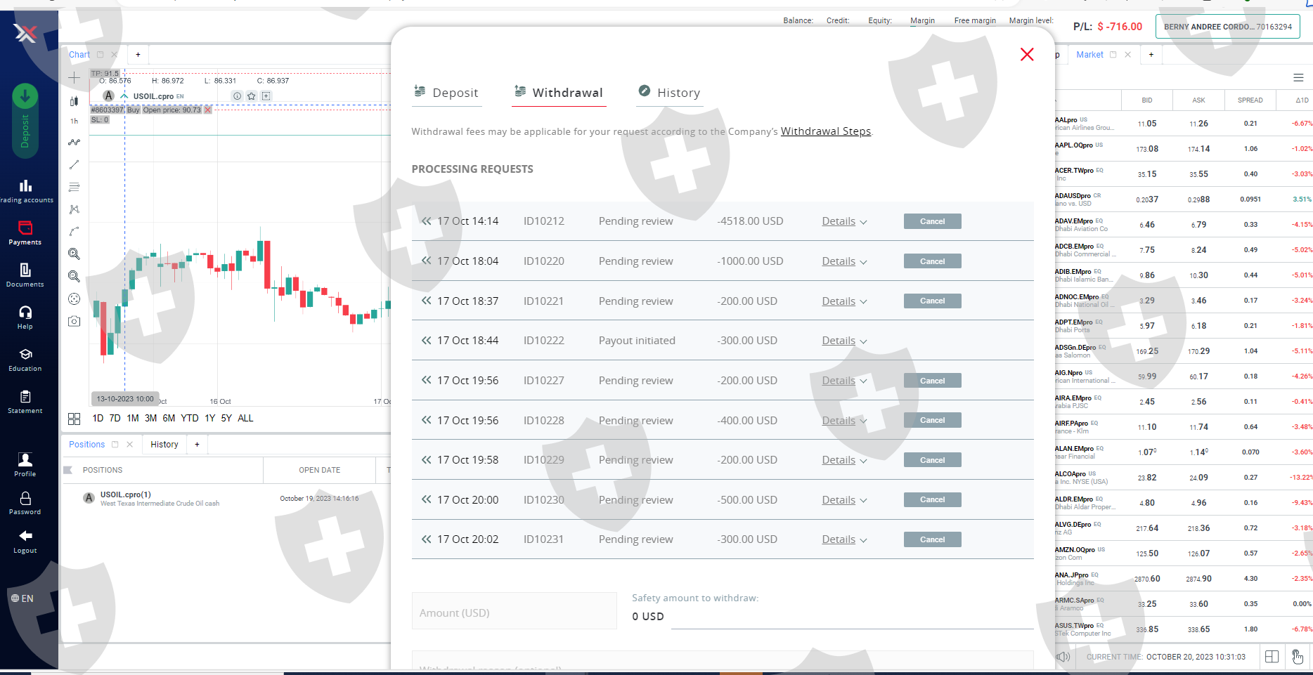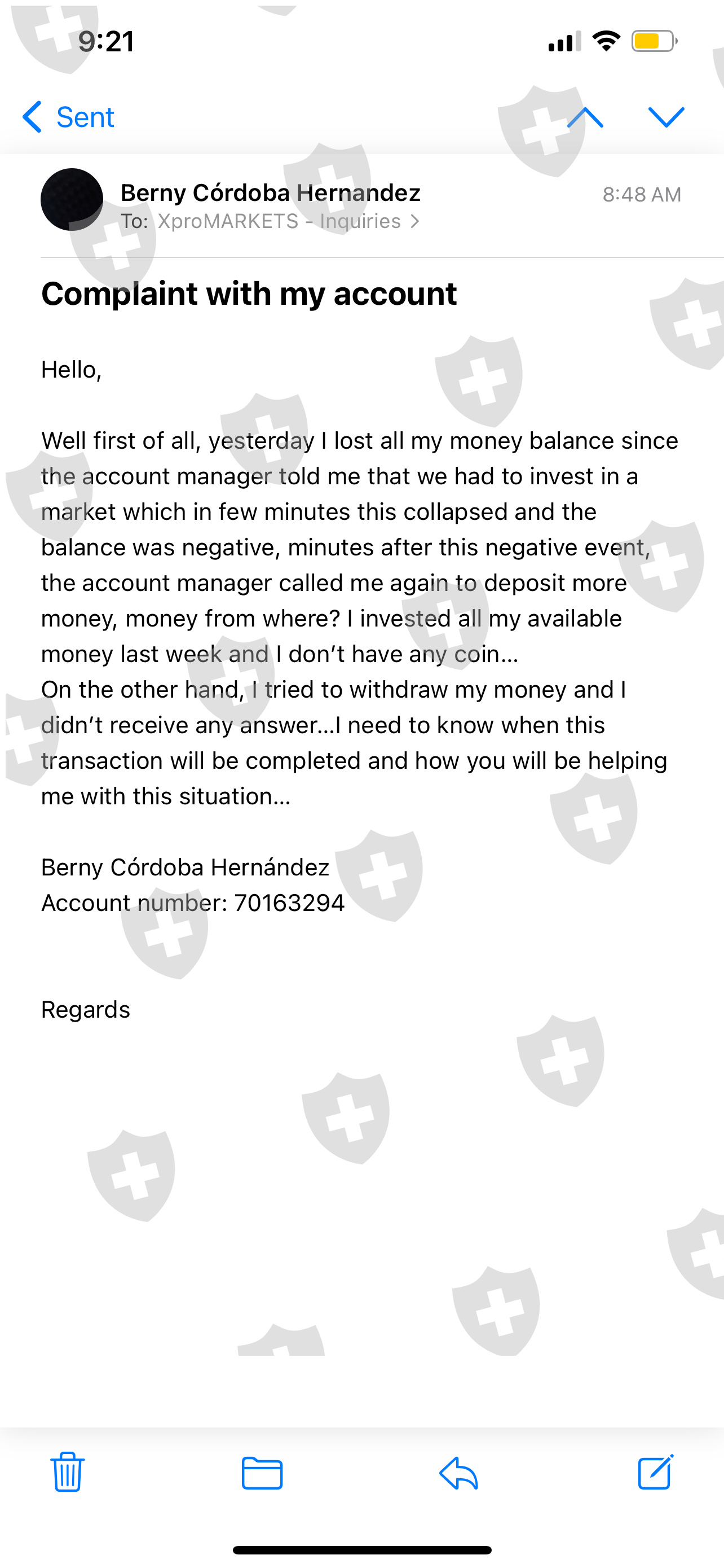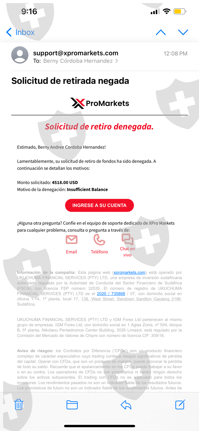 这一切都始于 2023 年 10 月 17 日,当时在讨论如何使用该平台后,经纪人“Lucas Monfort”(我认为是虚构的名字)“指导”了我使用该平台并产生利润的过程。谈话后,他说服我,如果我存入3000美元,他们将奖励我2000美元,我输入3740美元进行操作,果然市场呈指数级增长,因此我赚了7700美元。第二天,即 2023 年 10 月 18 日,卢卡斯·蒙福特 (Lucas Monfort) 每分钟用不同的号码给我打电话,并通过 Telegram 应用程序给我写信,他告诉我他将取消利润以继续投资,就在那时我开始了阅读人们的经验。一旦成功,他们就产生了 7,700 美元的利润,就在那一刻,我开始阅读一些人的评论,这些人已经失去了所有的钱,所以我拒绝同意取消。他每天都打电话让我做,但我没有做。周四他们给我存了300美元,让我释放利润,但我也没有这样做,需要注意的是,从10月17日周二开始,我的账户出现了待提款的情况。接下来发生的事情是,昨天,即 10 月 23 日星期一,他告诉我,我们将使用已批准给我的奖金进行运营,我同意使用这笔钱,我想也许这样他们就可以从中获得利润,他们会更快地释放我的钱,然而,几分钟后,我的账户出现负数,我的债务为-1200美元,他们告诉我必须从卡中存入1200美元以弥补损失。我没有这样做,所以他们给我发了一封电子邮件,告诉我我的帐户已经完成,我登录后一切都为零,几分钟后他们又给我发了一封电子邮件,由于“余额不足”而取消了我的提款。我开始发送电子邮件索要我的钱,我向南非金融部门行为监管局发送了一封电子邮件,因为他们是该国的监管机构,对此案进行了投诉,但我没有收到任何回复。我害怕失去这笔钱,因为它是来自信用卡的,当我账户上没有这笔钱时,我就突然失去了一切。经纪人卢卡斯·蒙福特(Lucas Monfort)打电话给我,并向我发送消息,要求我进行更多投资,以收回“损失”的资金,而这很容易成为骗局。这些人不是专业人士,他们只想偷你的钱,系统说需要3天才能存款,但这是我们看到的例子,这不是真的......我希望你能尽快帮助我,我需要拿回我的钱。