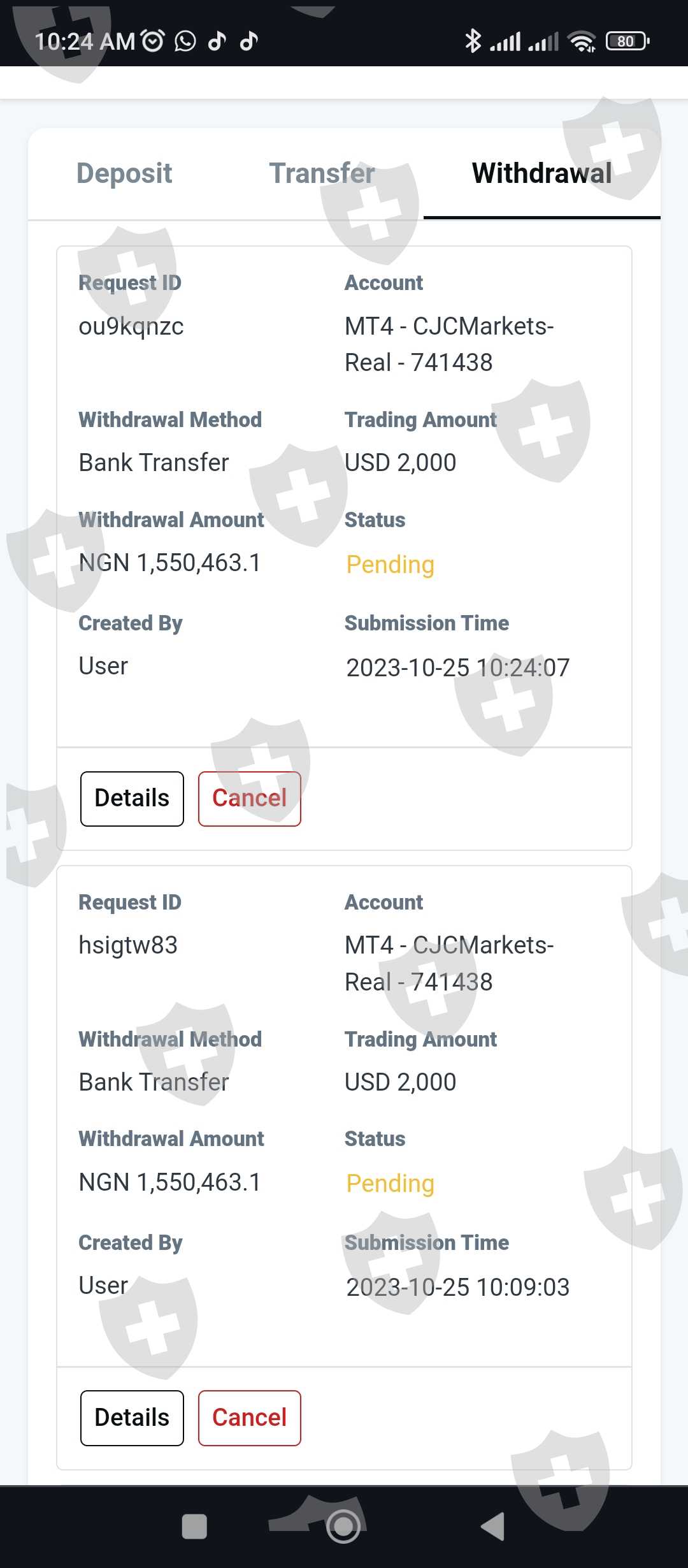 我已经在尼日利亚拉各斯的 CJC Markets 交易了两年,我尝试出金,但一直显示为 "待处理"。尼日利亚拉各斯的 CJC Markets 给我发了一封邮件,说他们已经关闭了尼日利亚办事处。从那时起,我就无法出金了。我的出金一直显示'待处理',资金没有转入我的个人账户。请帮帮我。我去了他们在拉各斯的办公地点核实,发现他们说的是真的,他们已经关闭了业务,没有退我的钱,我只想拿回我的钱。我怀疑这是诈骗。到目前为止,我已经交易了 5000 多美元,附上相关详细信息,以便您进行调查。