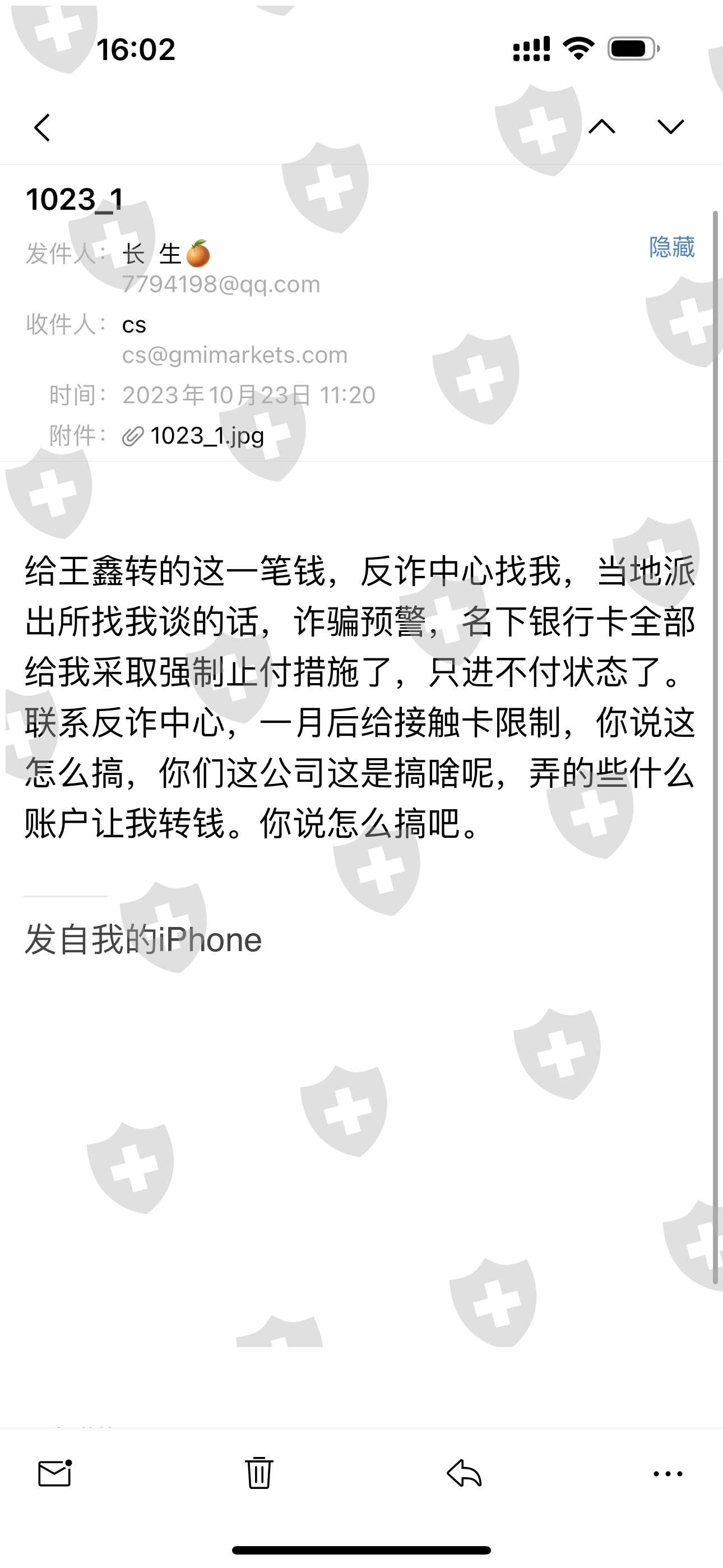 因为给平台入金转账,平台收金卡涉嫌诈骗被冻结卡一个月,在之后交易中联系平台发邮件入金,导致损失爆仓。
