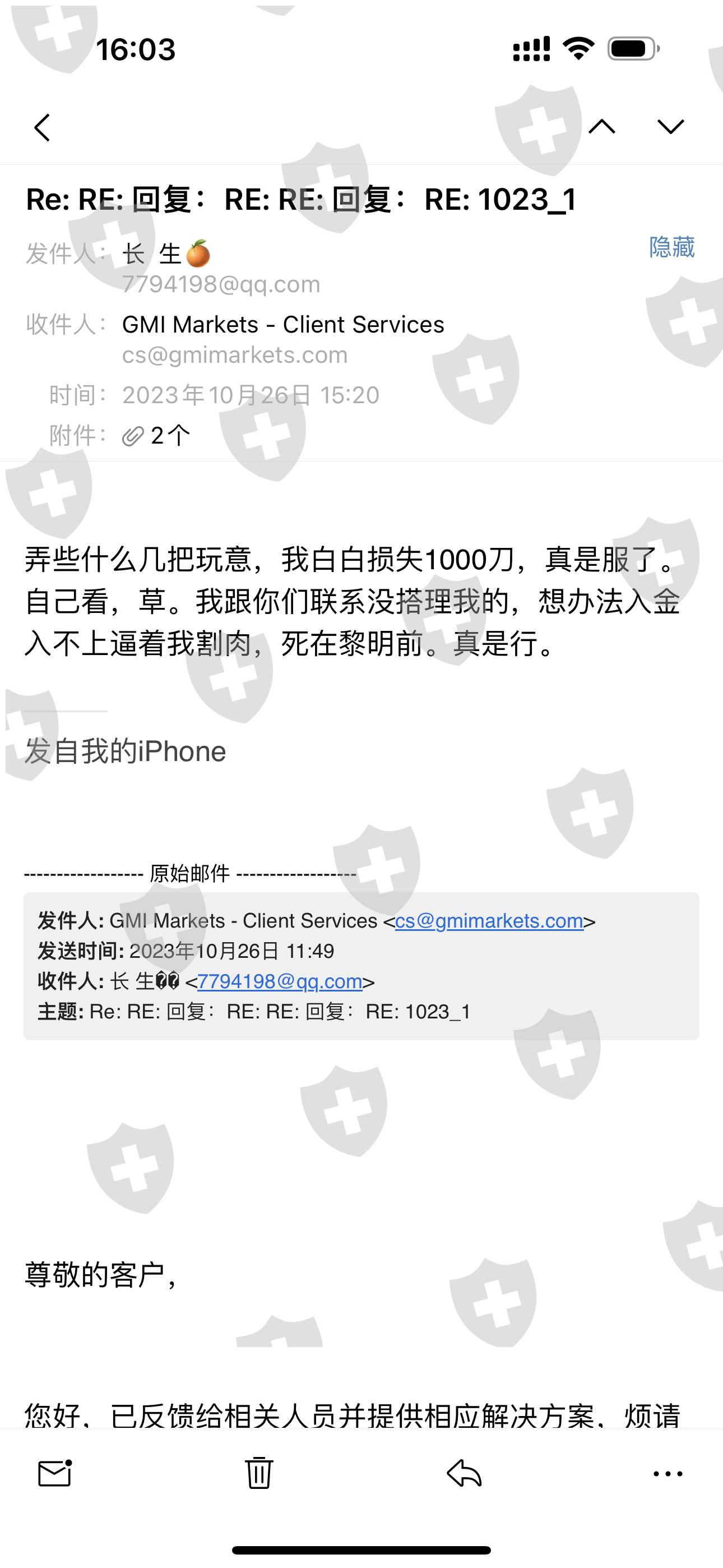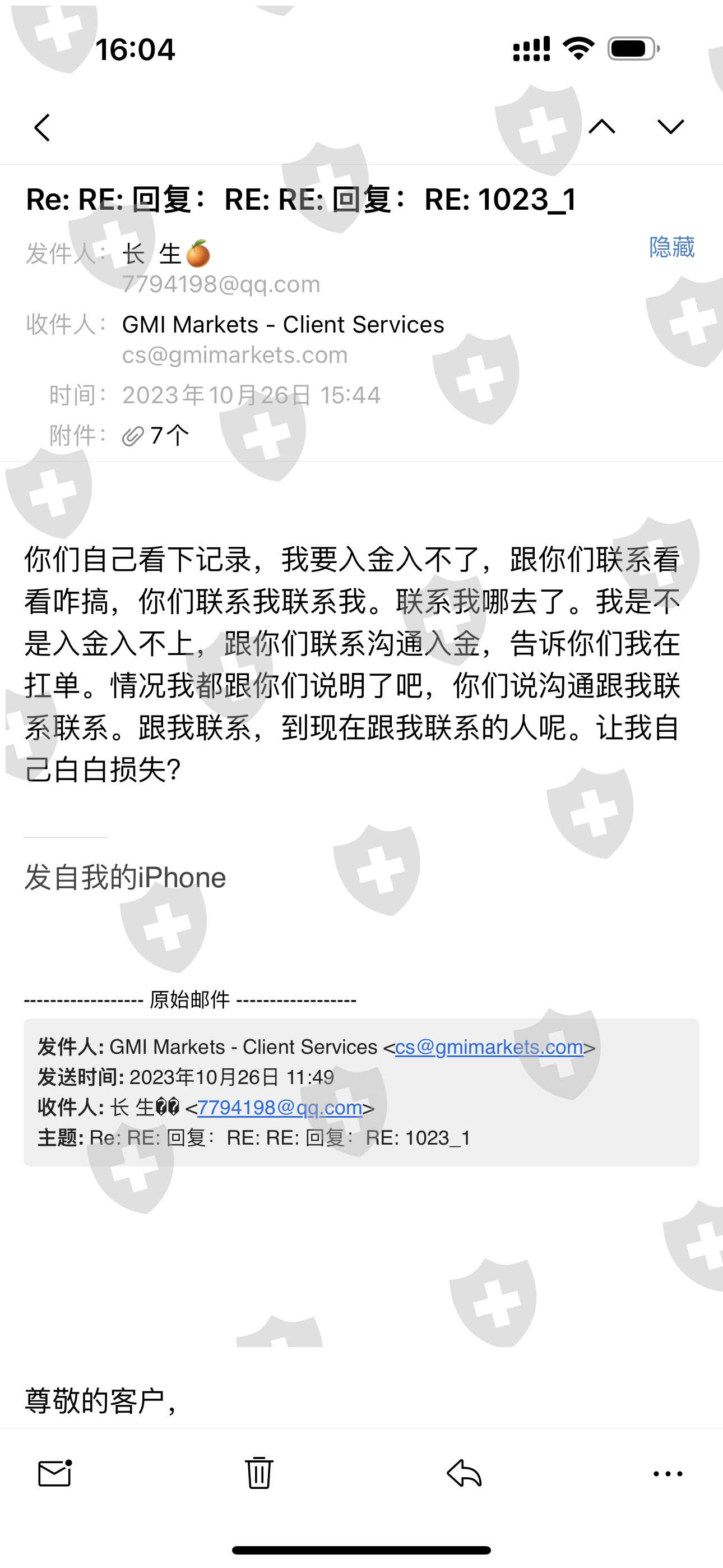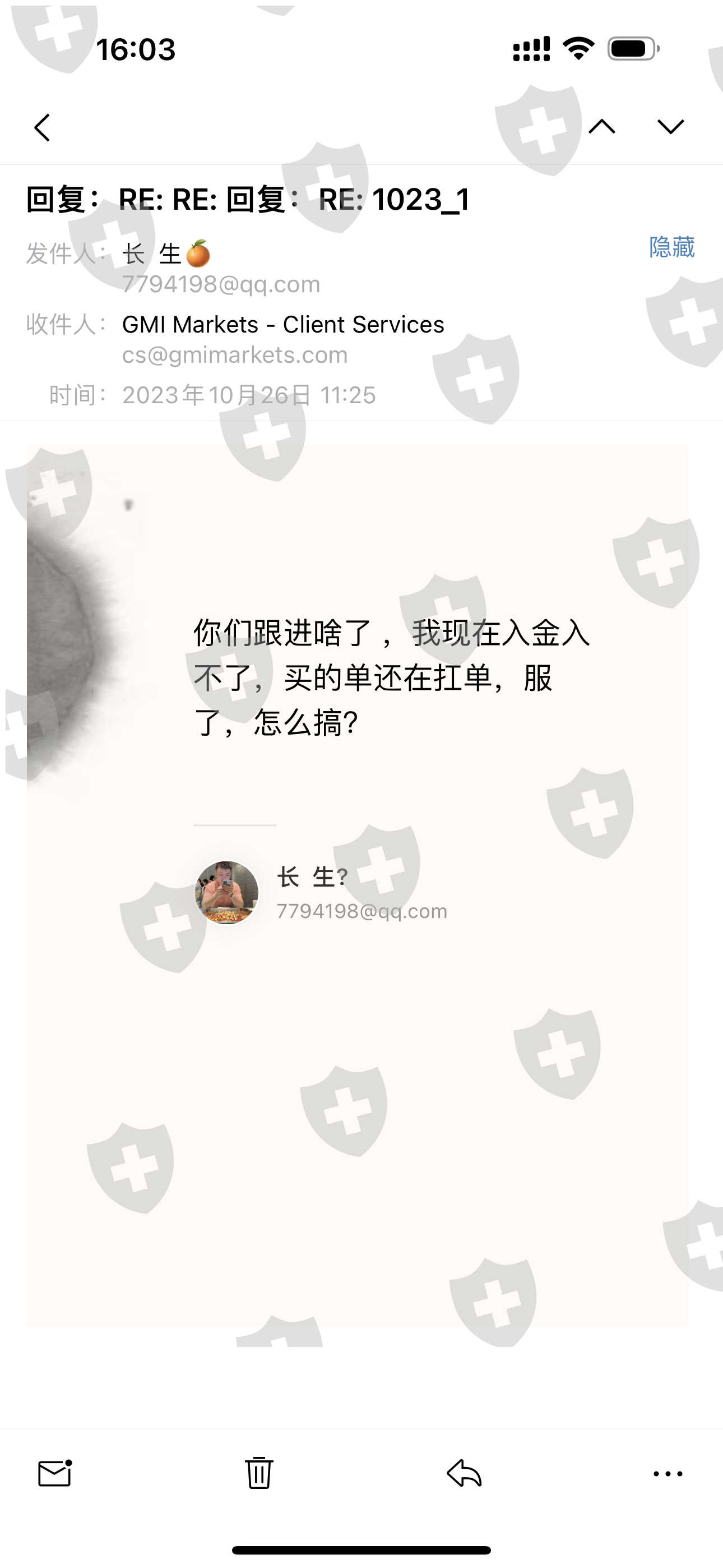 然后在10.25号-26号之间,我在mt4做了一笔美日的交易,一直有挂单,挂单成功了,我就联系平台入金,我说我仓位太小,我要入金,要么扛单,扛抗给我拉爆仓了。给他们联系沟通想办法入金,他们就是回复跟我联系,注意信息,到如今没个消息信息电话的跟我沟通。导致我在交易中逼着割肉,白白损失916刀,死在黎明前。