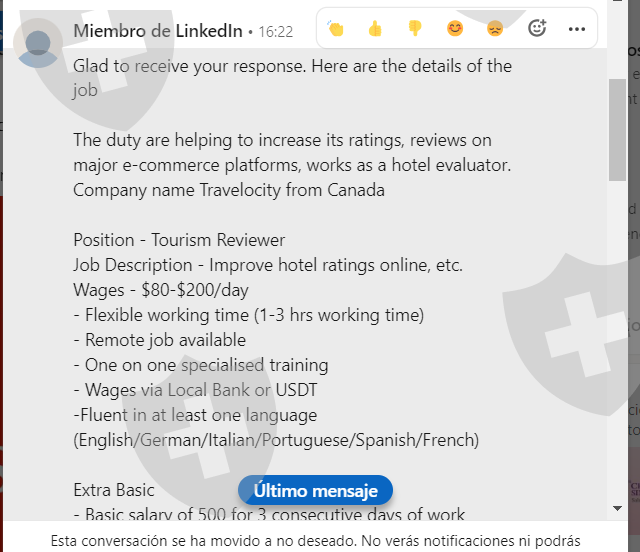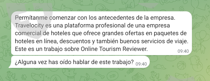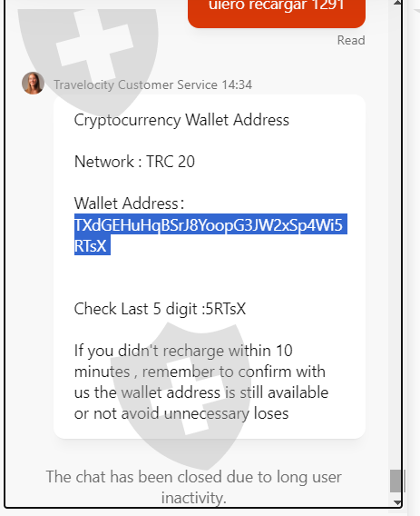 El viernes 27 me contactan por LinkedIn con una oferta laboral como Hotel evaluator de una empresa Canadiense Travelocity.Al siguiente día por Telegram me contacta Cassandra Davis para enseñarme a usar la plataforma. El trabajo era completar 40 revisiones de diferentes Hoteles y tenían paquetes delux, lo cuales se debían pagar para poder calificarlos.El 29 de octubre, hice la prueba y me fue bien me engancharon. El 30 de octubre me solicitan mas y mas dinero al punto de no poder completar las tareas por falta de dinero y hasta no realizarlas no puedo retirar mi dinero invertido.Ellos tienen un servicio al cliente donde se carga la plataforma el donde enviar una dirección: TXdGEHuHqBSrJ8YoopG3JW2xSp4Wi5RTsX y Address:TYc2fP7Wbhbdw44YVmNUjuDwyRWPQKFq2PNo he podido recuperar mi dinero invertido por que no he finalizado las tareas, pero no las puedo terminar por que no tengo el dinero, me solicitan 1291 USDT.