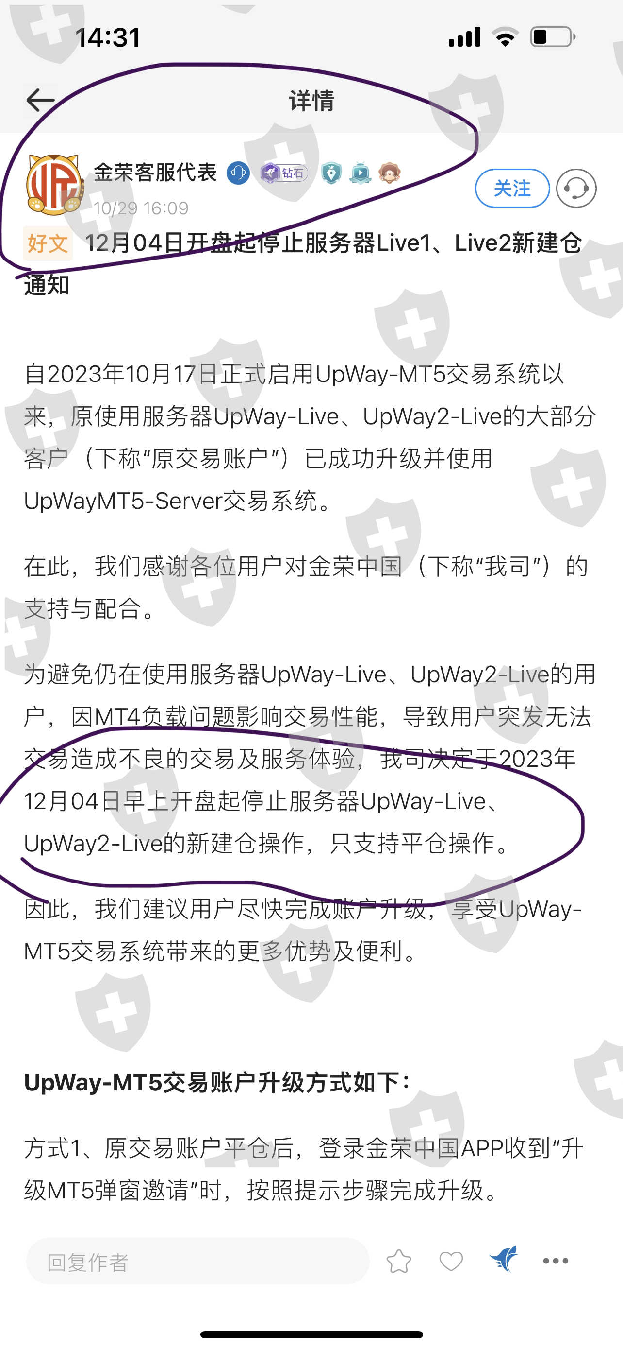 今年10月 金荣中国以需要升级服务器为由,要求旗下20,30开头的账户持有者升级账户,否则12月4日起不能再进行新建仓交易。但是在升级前要先平掉账户里所有的单子。否则12月4日后该账户只可出金入金不能够新建仓。就意味着对于账户有套单得客户,要么强行平仓升级,要么不能开新单不断入金扛仓直到账户的单子自己止盈。金荣客服说给了两个月缓冲期,实际上正式通知为10.29日,还仅仅在金荣圈平台发布,并没有挨个打电话通知客户。美其名曰缓冲期,事实是行情不会因为你的缓冲期而变化。金荣中国完全不顾客户利益,一刀切的手段,已经属于侵害了客户权益。此平台非常不靠谱!而且该平台多次遇到出金卡被冻结的情况!