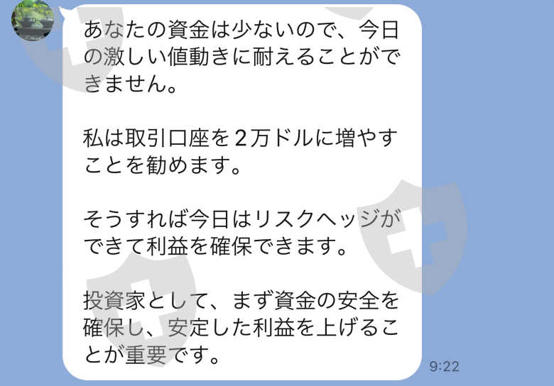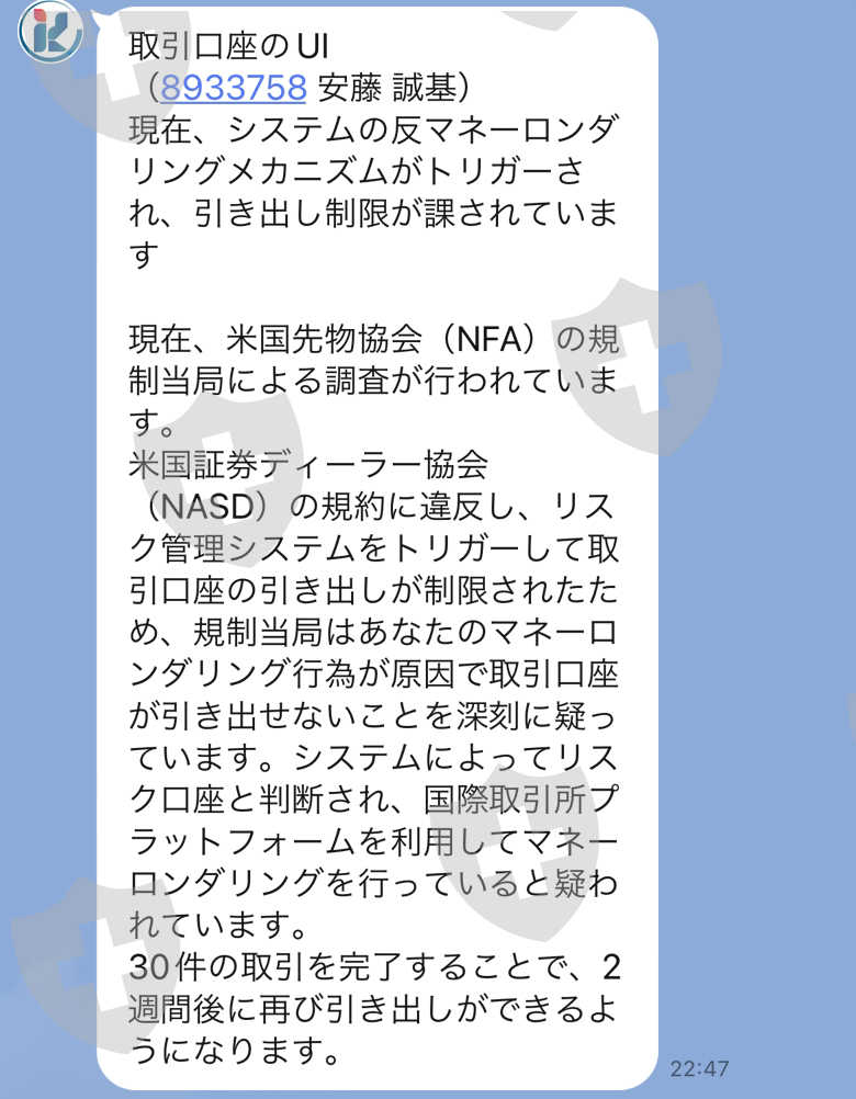 我被 Facebook 投资信息指南中一位名叫 Takahiro Uemura 的人邀请加入一个名为“神谷俊之研究小组”的 LINE 小组。在那里,成员们和一个自称神谷敏之的人正在谈论经济形势和股价,正在进行一场似是而非的对话。偶尔,老会员也会晒出自己的日常生活截图。神谷先生还提供了推荐股票的信息,股价上涨,会员盈利。最终,当日经平均指数开始下跌时,人们要求我像去年一样提供外汇指导。一些会员表示想第一次见识,其中一位资深会员邀请了一位自称是海外外汇交易所的山内宗太。账户陆续开立,神谷先生分别对他们进行货币对、交易方向、交易量的指导。最终,所有参与的会员都开始盈利。这是我第一次接触外汇,但我被利润所吸引,所以我在山内先生的指导下开设了一个账户,并分两次存入了20万日元。我最终在每笔交易中赚取了数百美元的利润。不久之后,一位被称为大师的名叫杉山义德的男子出现了。杉山先生现在将提供直接指导。我要求参加,但神谷先生告诉我,我的钱太少,不敢冒险。我想知道是否应该增加更多的资金,但我决定暂时不这样做。顺便说一下,当时我身边的会员的利润都是几万块钱。我没有根据我的需求进行任何额外的投资。我的利润约为1000美元,因此我申请了300美元的提款,金额以149日元的汇率转入我的账户。然而,我很害怕,做了一些研究,发现存在很多欺诈行为。当我申请提取所有资金时,山内先生告诉我,由于涉嫌洗钱,提款已被暂停。据解释,要取消,必须在完成30笔交易后两周后才能提款。奇怪的是,涉嫌反洗钱,交易还能继续进行,所以我查了一下海外争议解决机构,发现他们规定必须在事件发生后45天内提出投诉,我看到了。很明显我的时间不多了,所以我做了一些研究并找到了这个网站。