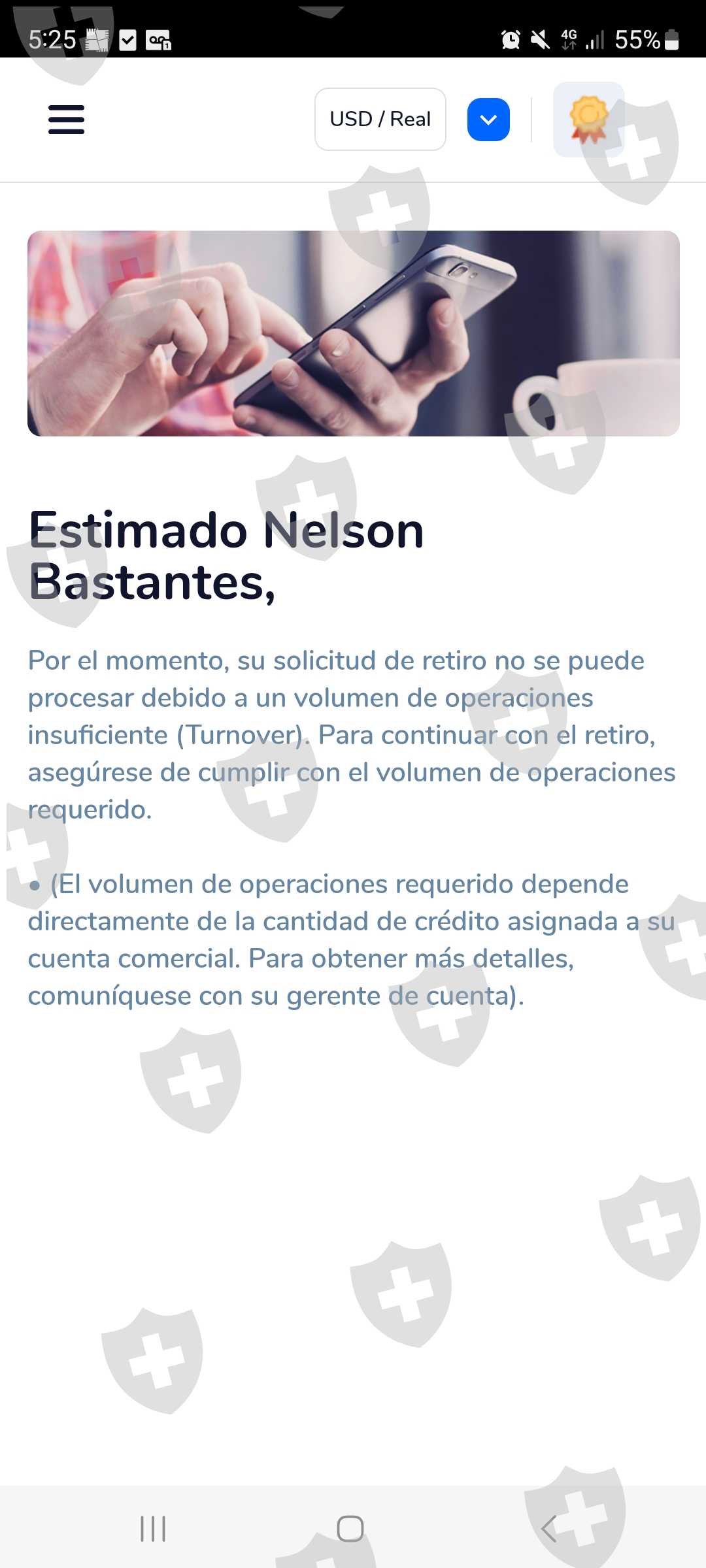 朋友们,我会尽量在我的演示中说清楚,我第一次转账了250美元,100美元后,第一个告诉我这已经足够了,第二个是基本的,我需要将资金转移到交换时,他们会给我提供 250 美元的第一笔价值,然后是 10 万美元,他们称之为奖金,最终作为贷款出现在系统中,然后由于我缺乏经验,他们告诉我他们自己会移动帐户就是说投资概况,两天后我问他们把利润转移给我,但利润是负数,现在我无法进入平台,因为他们要求我在外部控制它,如果我有正数头寸,我会平仓以获得一些利润这是一个谎言。注意。 Nelson Basantes R. 投诉人