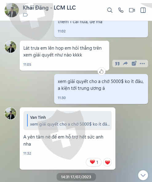 我的名字叫 Nguyen Anh Tuan - 身份证号 741193,于 2023 年 7 月 3 日在“Leap Capital Markets”创建了一个帐户 - 在向该帐户存入 6000 美元之前,我联系了一位名叫 Khai Dang 的朋友,号码电话/zalo:09447678471。来自Khai Dang的信息: - 账户有3000$可以在3天内进行交易,3天后,投资者将享受所有利润,条件是他必须存钱并进行交易。 3天内,资金返还30-50% + 交易7-15天后,资金100%返还账户 - 2023年7月6日,场内将提取3000$和5057$的经验奖金我的可交易资金。 3天后——因为我在等待5,057美元到账,所以我没有存入更多资金。到目前为止,我已经多次发短信和打电话给 Khai Dang,但都没有收到回复,所以我拨通了这个号码。交易所热线和楼层告知我们这是业务方的错误+我告诉楼层业务人员没有看错,因为他在zalo上发了短信(附图片)但楼层拒绝处理。 + 目前我的账户已被停止,因为我正在等待楼层销售人员承诺给我的钱,并且有欺诈的迹象,所以我不想再存入任何资金进行交易 -