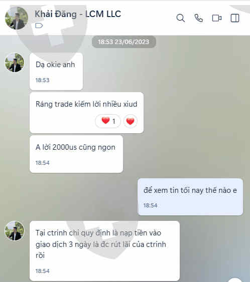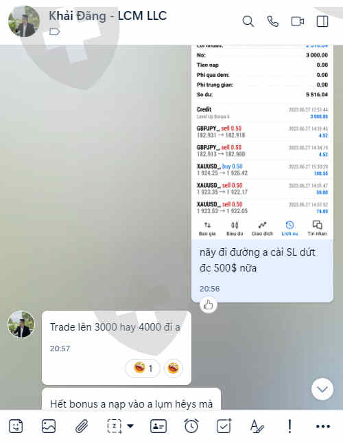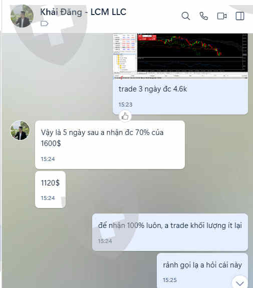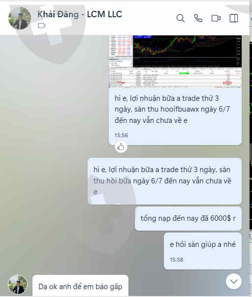 Mình tên Nguyễn Anh Tuấn - id số 741193, tạo tài khoản sàn "Leap Capital Markets" vào ngày 3/7/2023- trước khi nộp 6000$ vào tài khoản, mình có liên hệ với 1 bạn sele có tên Khải Đăng, số điện thoại/zalo: 09447678471. Theo thông tin từ Khải Đăng là:- Tài khoản có 3000$ trade trong 3 ngày, xong 3 ngày lợi nhuận được bao nhiêu thì nhà đầu tư hưởng hết, với điều kiện phải nộp tiền vào và trade trong 3 ngày thì tiền về 30-50%+ trade xong 7-15 ngày thì tiền về tài khoản về 100%- Đến ngày 6/7/2023 thì sàn thu hồi bonus trải nghiệm 3000$ và 5057$ tiền của tôi trade được sau 3 ngày- vì tôi chờ khoản tiền 5057$ về nên tôi không nộp thêm vốn vào, đến nay đã rất nhiều lần tôi có nhắn tin và gọi điện cho bạn Khải Đăng nhưng ko thấy phản hồi- nên tôi mới gọi điện đến số hotline của sàn và sàn thông báo lại là việc này bạn bên kinh doanh nhầm lẫn + mình có nói với sàn rằng là bạn kinh doanh không nhầm lẫn vì đã nhắn tin trong zalo (có hình ảnh kèm theo) nhưng sàn từ chối không xử lý + hiện tại tài khoản của mình bị stop out, vì mình mong chờ cái khoản tiền mà nhân viên sale của sàn hứa với mình, và có dấu hiệu lừa đảo nên mình ko muốn nộp thêm tiền vào trade nữa-
