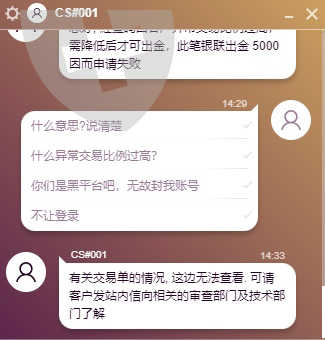 平台不旦不给出金,还无故封我账号,不让登录,实属黑平台,附上和在线客服聊天记录。