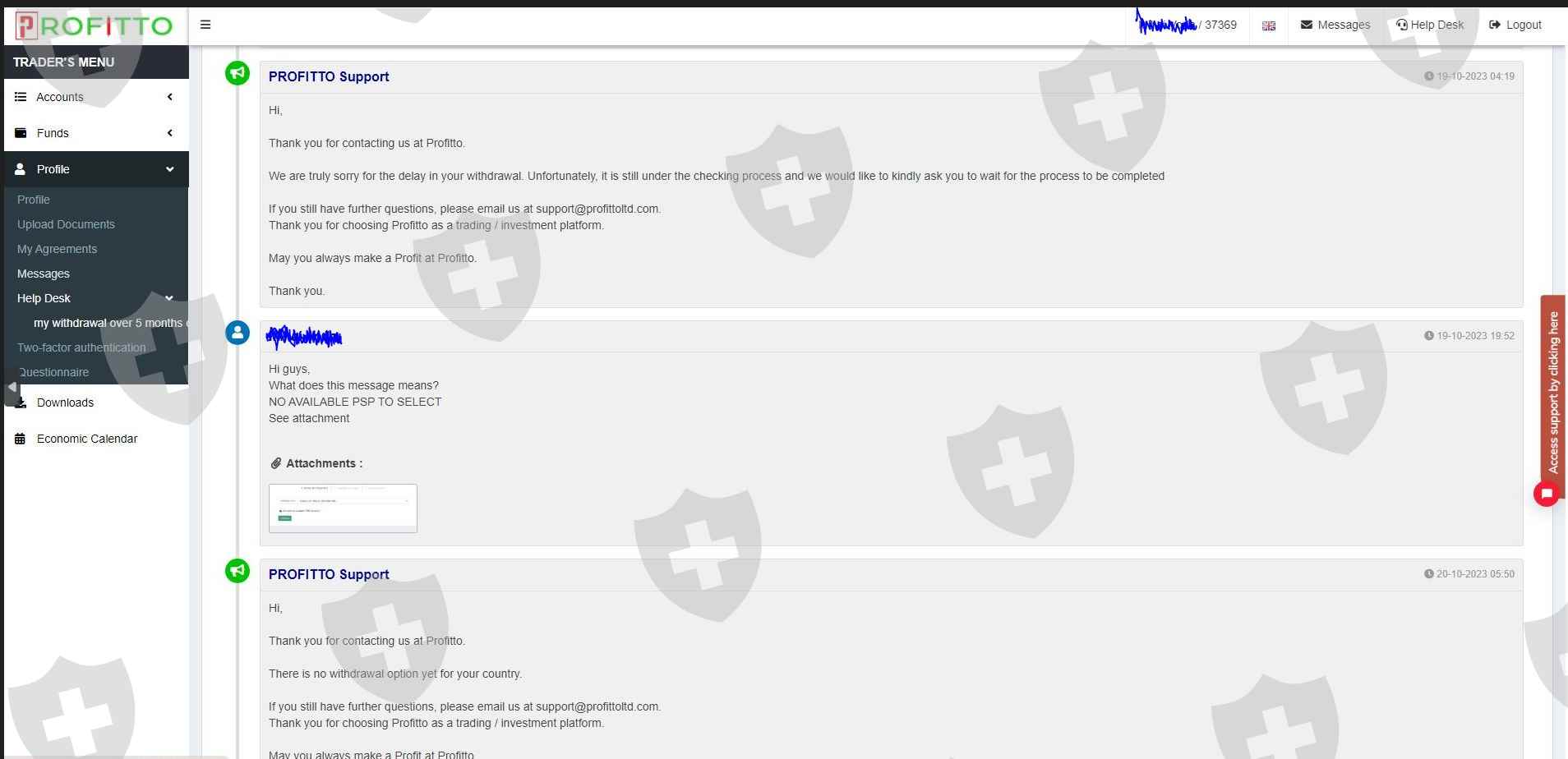 骗子交易商,我一直在Proffito交易。2023年2月,我想出金,但是过去了9个月,他们仍然拒绝让我出本金。不要在Proffito入金,他们就是骗子。