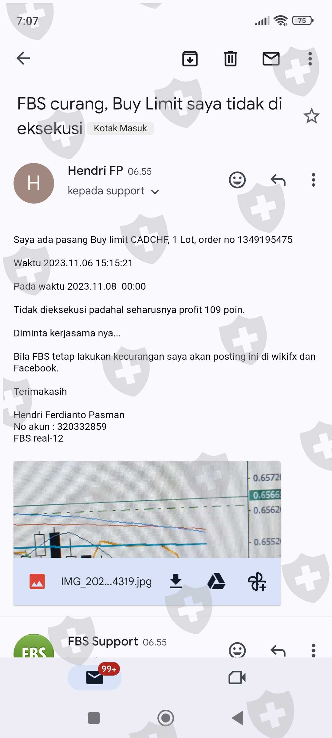 为什么 FBS不执行我的买入限价订单?一对 cadchf,1 批,订单号 1349195475,时间 2023 年 11 月 6 日。时间 2023 年 11 月 08 日 15:15:21。 00.00 即使利润应该是 109 点...帐号 320332859 FBS real-12 是否 FBS做错什么了吗?