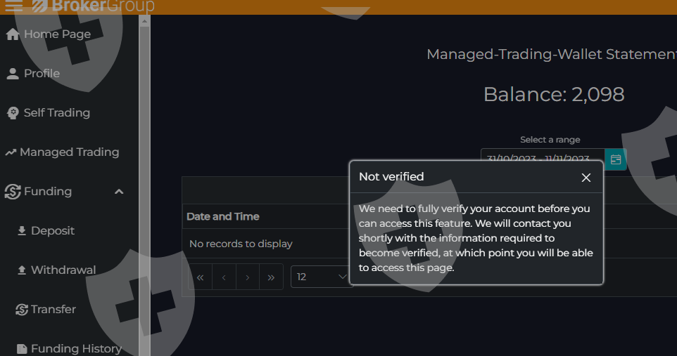 Tal como mencionan no se puede realizar el retiro de los fondos parcial o totalmente generando para cualquier operacion un mensaje de que van a verificar la cuenta, recordemos que esta cuenta estaba en la pagina de Omegapro y de ahi lo pasaron a Brokergroup(broker-group.com), mi usuario es HumbertoHS