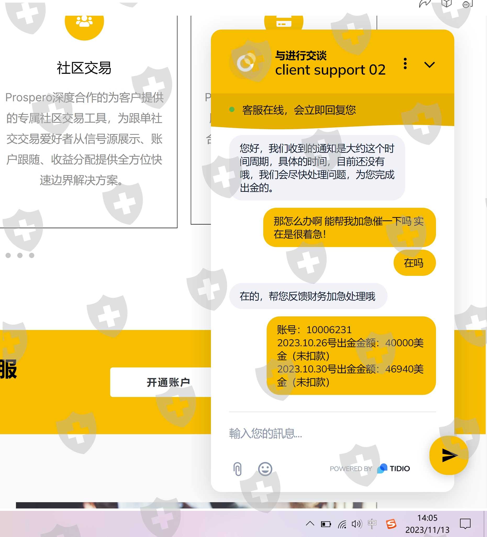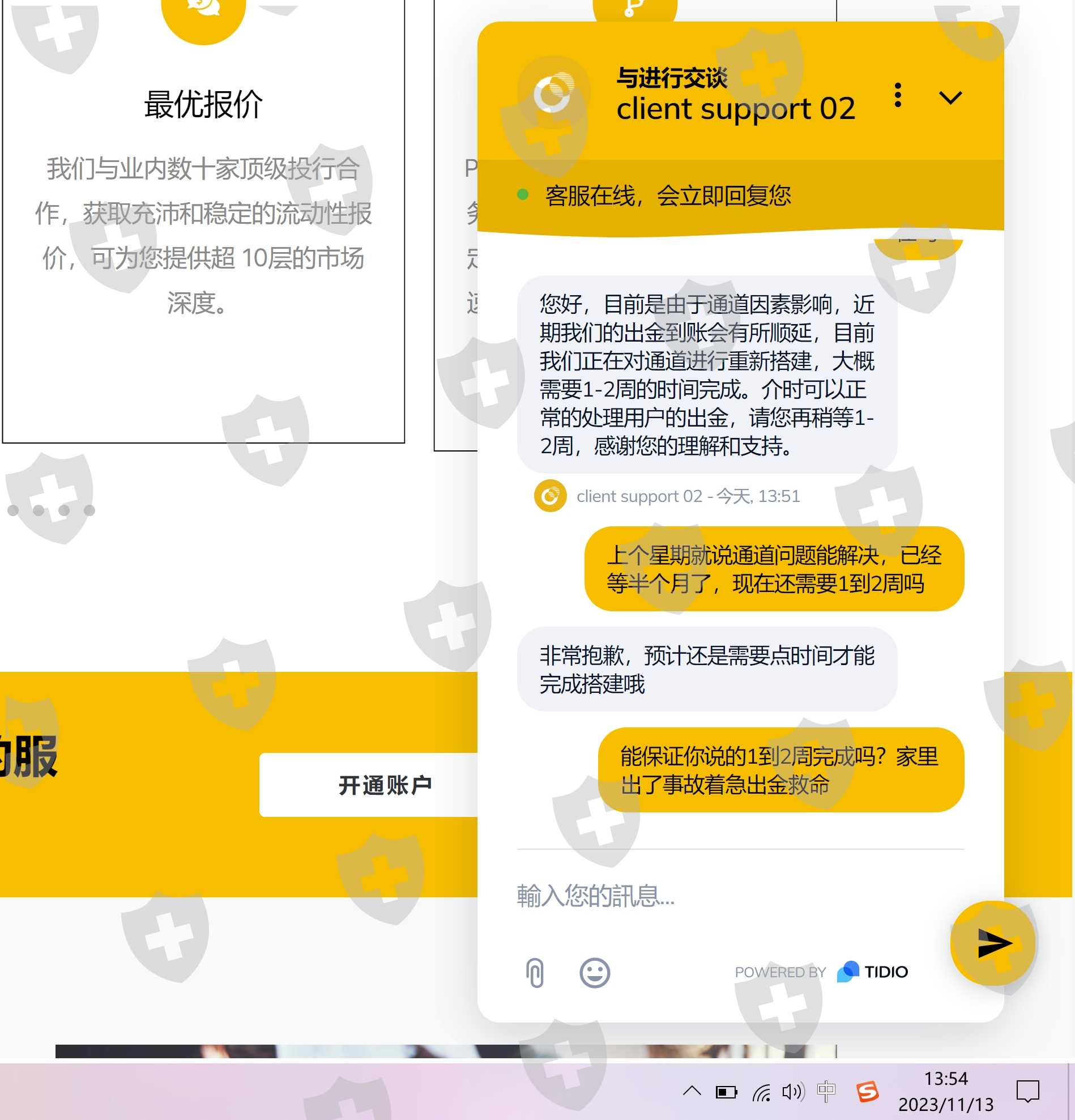 账号:100062312023.10.26号出金金额:40000美金(未扣款)2023.10.30号出金金额:46940美金(未扣款)今天是11月13号仍然没有扣款,联系在线客服,说通道问题,从1号开始就说一周处理,到现在又说还需要一周到两周,一直再拖时间。