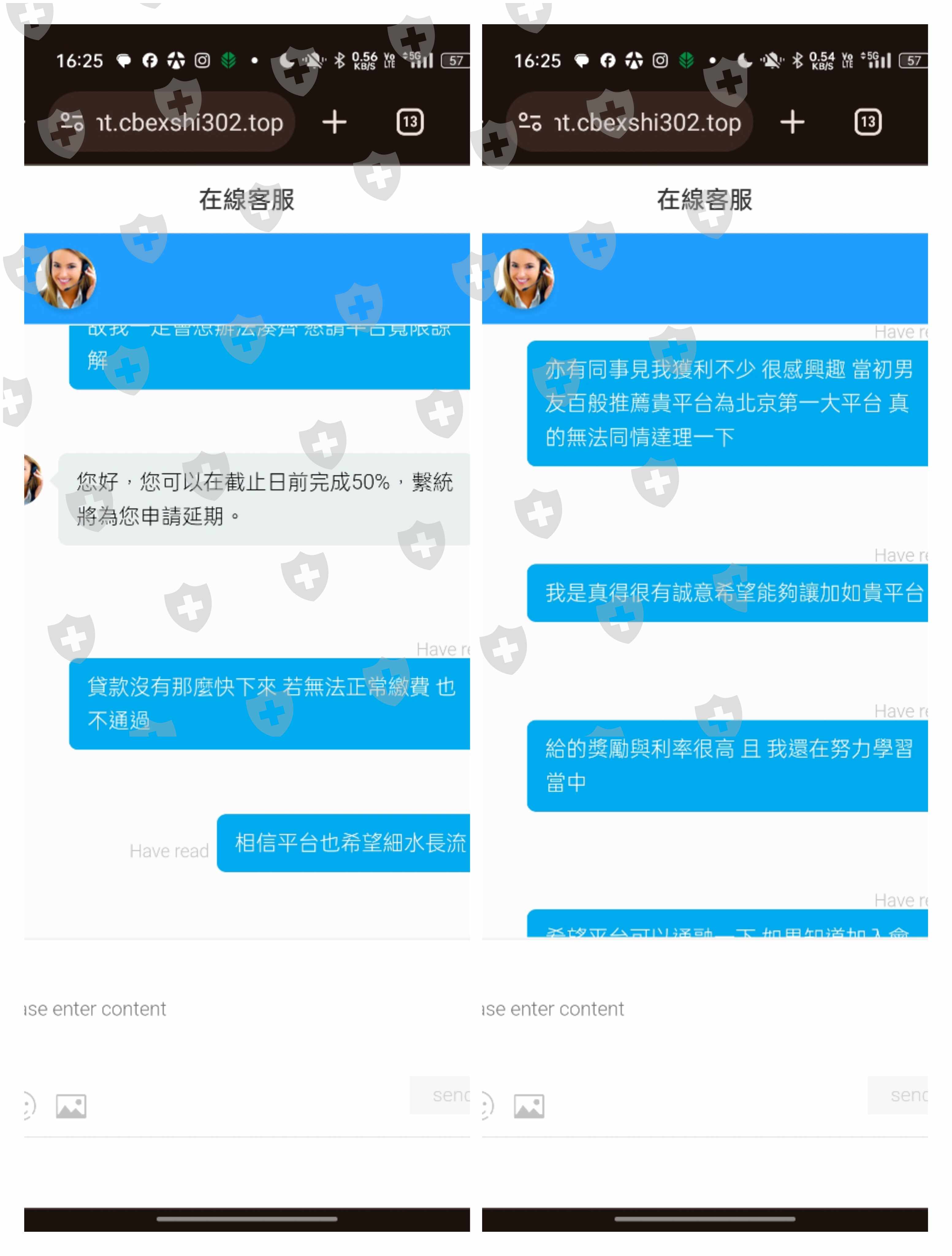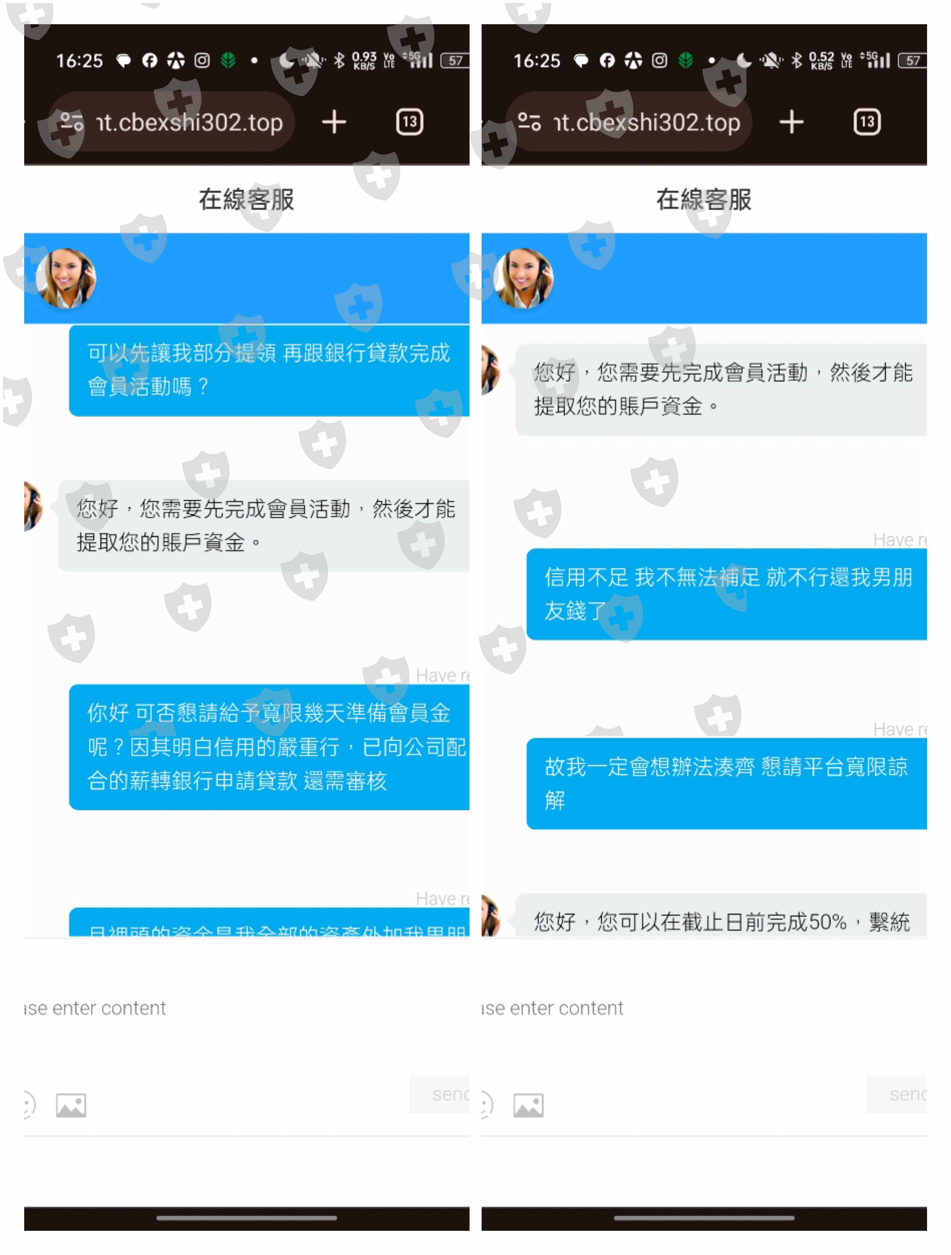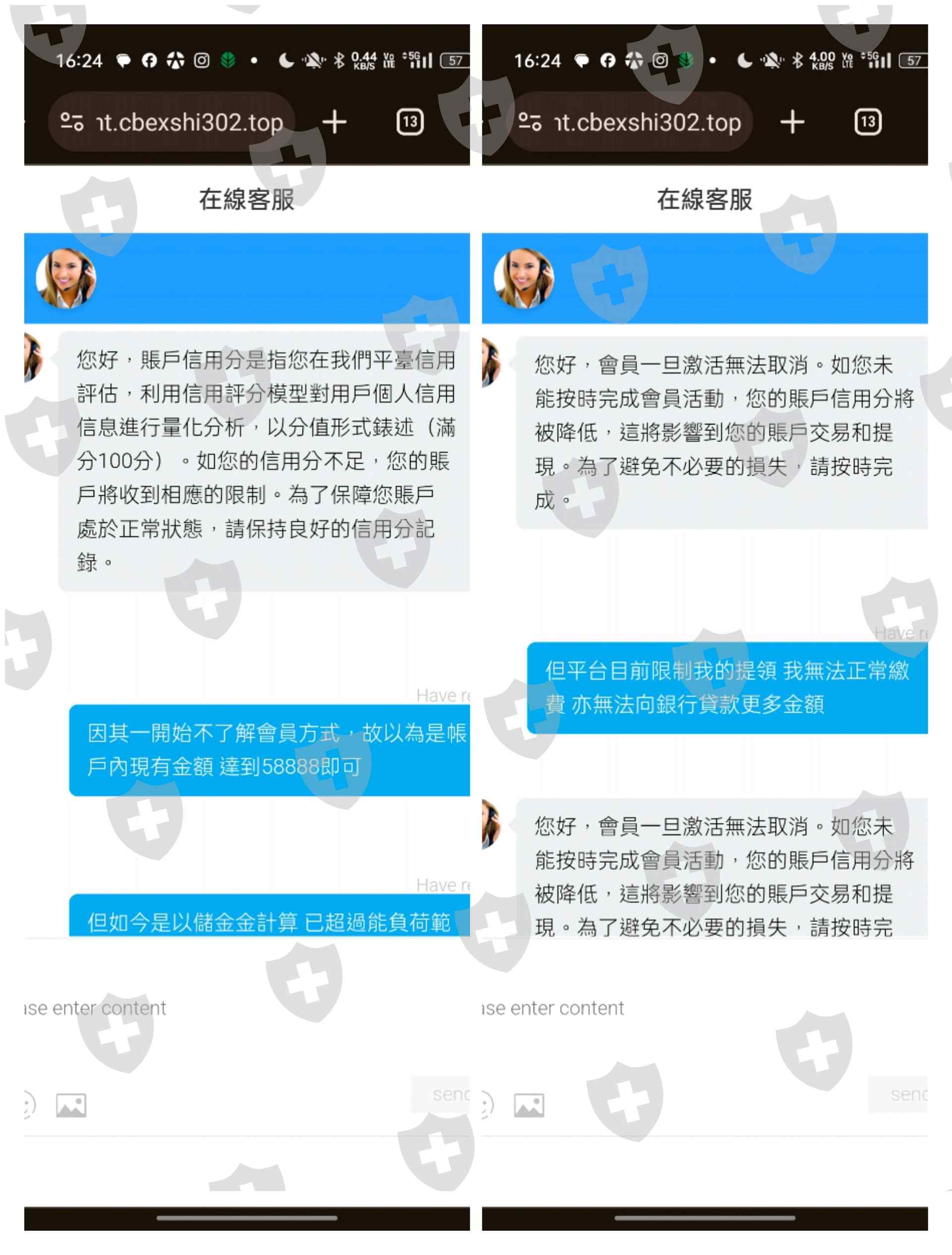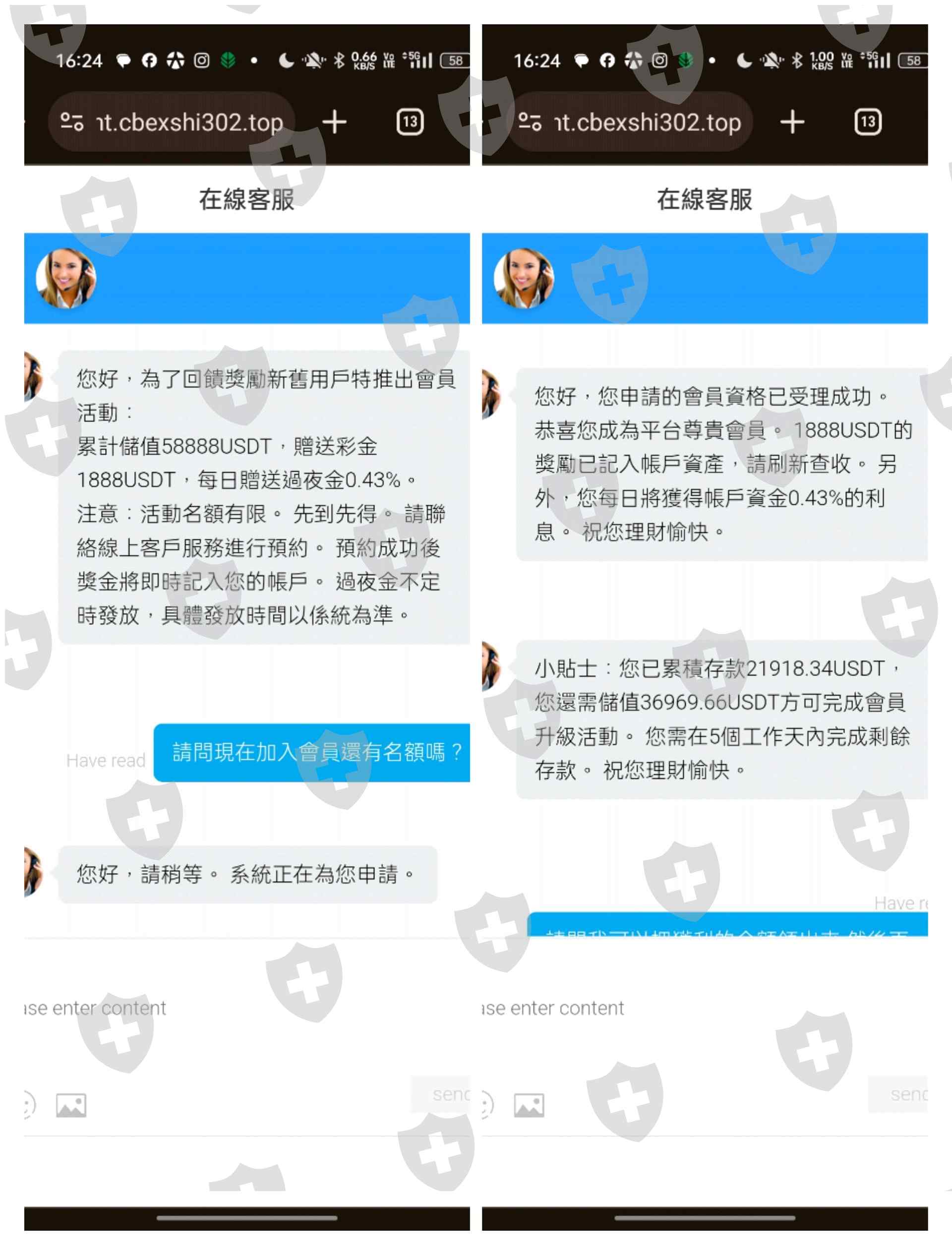 https://ht.cbexshi302.top/wap/#/home,誘使你諮詢客服加入會員,過程沒有任何的說明解釋,直接激活你的帳戶,贈送你1888USDT,看得到摸不到領不到的獎勵金,並要求你會員儲值金要儲值滿58888USDT,才可以出金,否則限制出金!不論怎麼好說歹說怎麼懇求暫且部分提款以應負日常支出繳費,對方無一絲心軟,目前說會員活動到11/18截止,生怕網站就此不見,懇請協助,並請大家多多注意!!