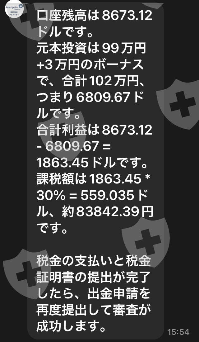 課税額は1863.45x30%=559.03ドル、約8384.39円です。税金の支払いと税金証明書の提出が完了したら出金申請を再度提出できます。」