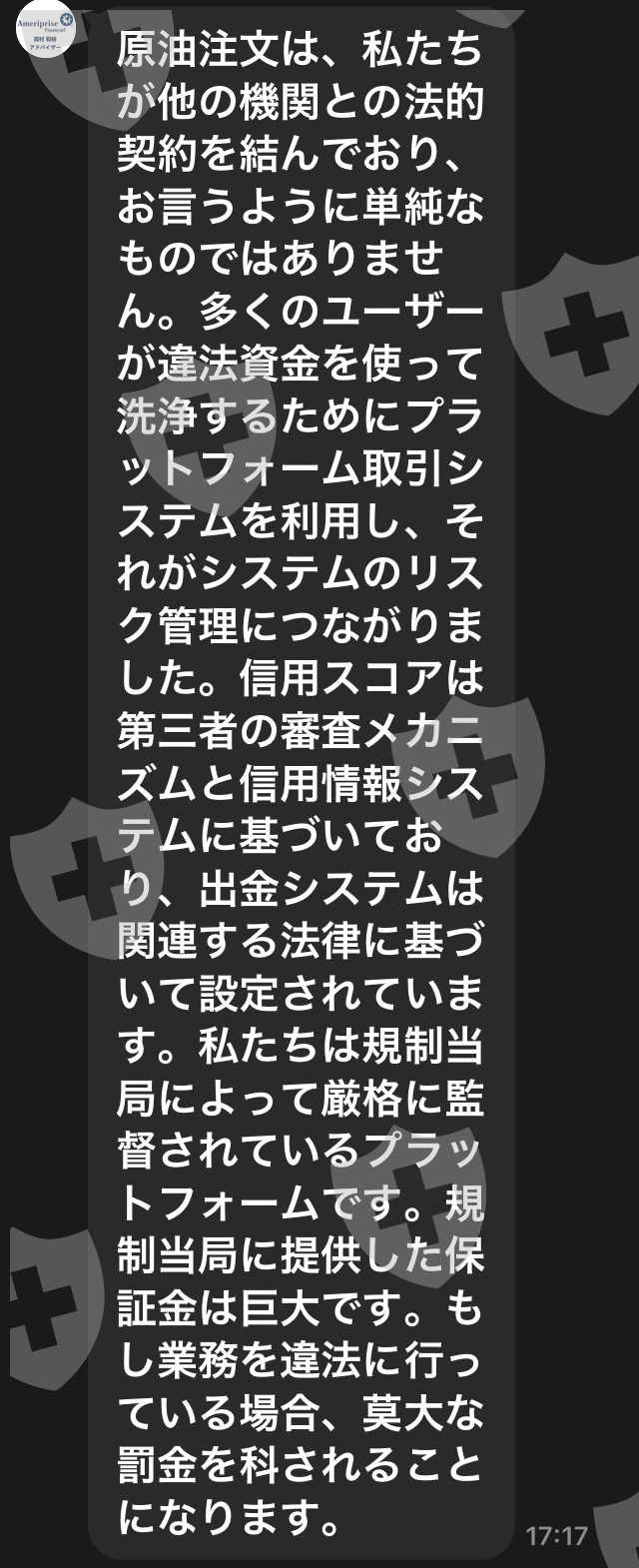 Ameriprise Finacial 介绍平台交易者 Hideyoshi Yokoyama,Ameriprise Finacial 在 Kazuhiro Takamura 的指导下我无法提取我交易外汇的资金,最近我什至无法查看它们,因为有评论说存储期限已过期。我从应用程序商店下载了“AMPINC”,存入100,000日元,获得了30,000日元的奖金,并开始进行外汇交易。我是新手,错误地将0.1手当成1手买入,但结算成功,获利80美元。被告知我现在的资金不够购买一批,但被告知下次要小心,之后一切都很顺利,但我误解了10月11日指示的付款程序,结果赔了钱。被告知已经成功完成。当我问他之后赚了多少利润时,他说:“我不能参与石油项目的原因是因为我没有支付违约金。我可以支付1,040,000日元的余额并收到1,638美元的利润,或者我可以支付30%的罚款和利润。我拒绝了,说我不记得成交过交易,但最终,10月4日,我无法预结算原油交易当我被告知要收取罚金时,我发邮件说“我会等”,但最终我支付了1,040,000日元的运费,我对我账户中的所有付款和利润负责。我被告知它在我的账户中。支付金额为1,024.46美元(2,662.46美元减去1,638美元),约15万日元。换句话说,我们支付了1,040,000日元➖15万日元=89万日元。此后,交易继续进行,手数增加,但在10月份23 我要求提取120万日元,因为我要用它来工作,并得到批准,所以我完成了程序并等待。但是,我被告知我的外汇交易账户将被审查,所以请等待这次根据国家的外汇税收政策,赚取利润后需要纳税,然后审核就成功了。当时账户里有$8,673.12。账户余额:8,673.12。本金投资:990,000日元➕30,000日元=1,020,000日元=$1,863.45税金额为1863.45 x 30%=$559.03,约8384.39日元。完成缴税并提交税务证明后,您可以重新提交提款请求。“我没有选择但也转移税款,税务稽查完成后,账户全额退还,说可以提现,没有任何限制,但是说可以提现,也可以继续交易税完之后,但是这个时候我开始想,“这很奇怪吗?”我们多次催促你提款,但这次我们要求你提款。我们的平台集成了一个全面的评估系统,第三方审核机制、信用信息系统,提现制度依据相关法律,您需要将信用评分提高到85分以上,这是平台提现筛选的最低标准。避免被提款系统拦截,提款。我的分数在80左右。” “在不缴税的情况下提高信用分数有两种方法: 1:增加继续交易的时间,以提高账户的信用度信用评分。2:更快地提高您的信用评分。”如果您想提高您的信用评分,可以通过增加活跃存款来提高您的信用评分。您每存入 1,340 美元,系统会自动将您的信用评分增加1分,将信用评分提升至85分以上,增加金额即可绕过提现审核,正常提现。 11月份,我提出了很多要求,但他们坚持让我继续按原样或缴纳费用,并拒绝提交税务证明,因为我的信用评分不够,无法发送到我的帐户。从昨天开始,证据就从 LINE 上消失了,但我已经全部保存下来了。如果我错了,你能告诉我吗?当我提出销毁证据投诉时,公司写道:“如果你给我们公司带来负面影响,我们将追究你的责任。” 11月15日,在LINE的一次交流中,高村的照片和转账单等证据突然消失。我已经很累了,但请评估一下并做出决定。我们正在保存所有电子邮件通信、详细图像等,因此我们期待您的回复。