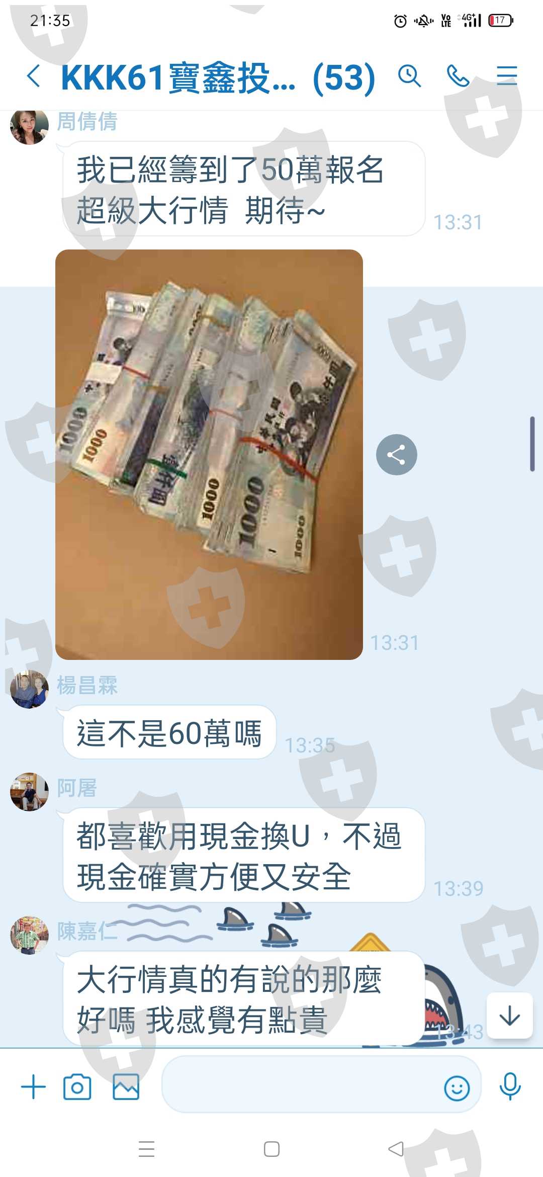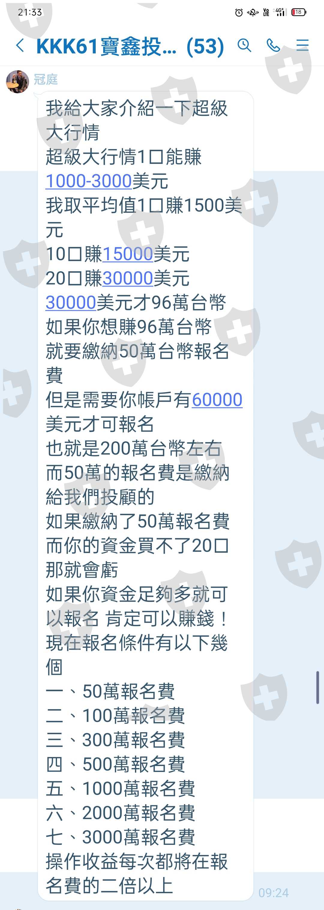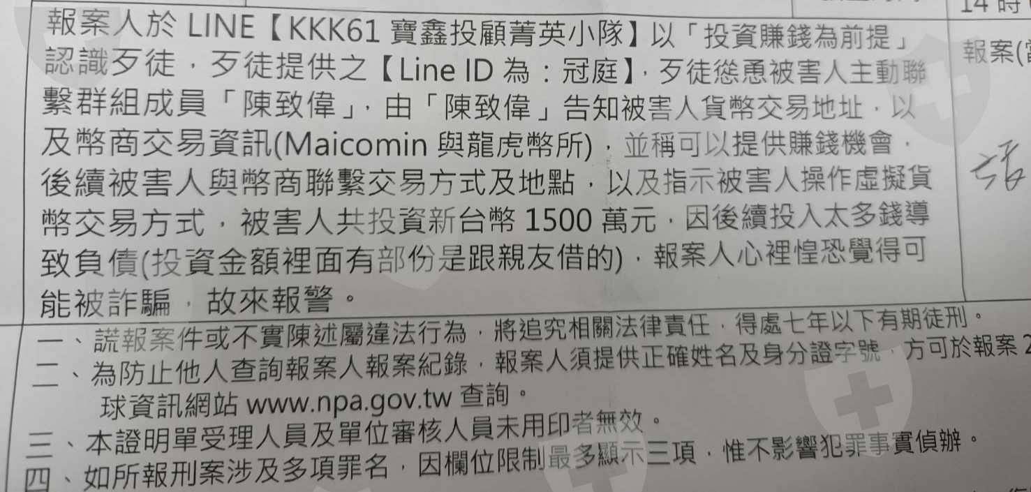 報案人於 LINE【KKK61寶鑫投顧菁英小隊】以投資賺錢為前提」 認識歹徒,歹徒提供之【Line ID為:張冠庭】,歹徒慫恿被害人主動聯 繫群組成員「陳致偉」,由「陳致偉」告知被害人貨幣交易地址,以及幣商交易資訊(Maicomin 與龍虎幣所),並稱可以提供賺錢機會, 後續被告人與幣商聯繫交易方式及地點,以及指示被害人操作 幣交易方式,被害人共投資新台幣1500萬元,因後續投入太多錢導 致負債(投資金額裡面有部份是跟親友借的),報案人心裡惶恐覺得可 能被詐騙,故來報警。