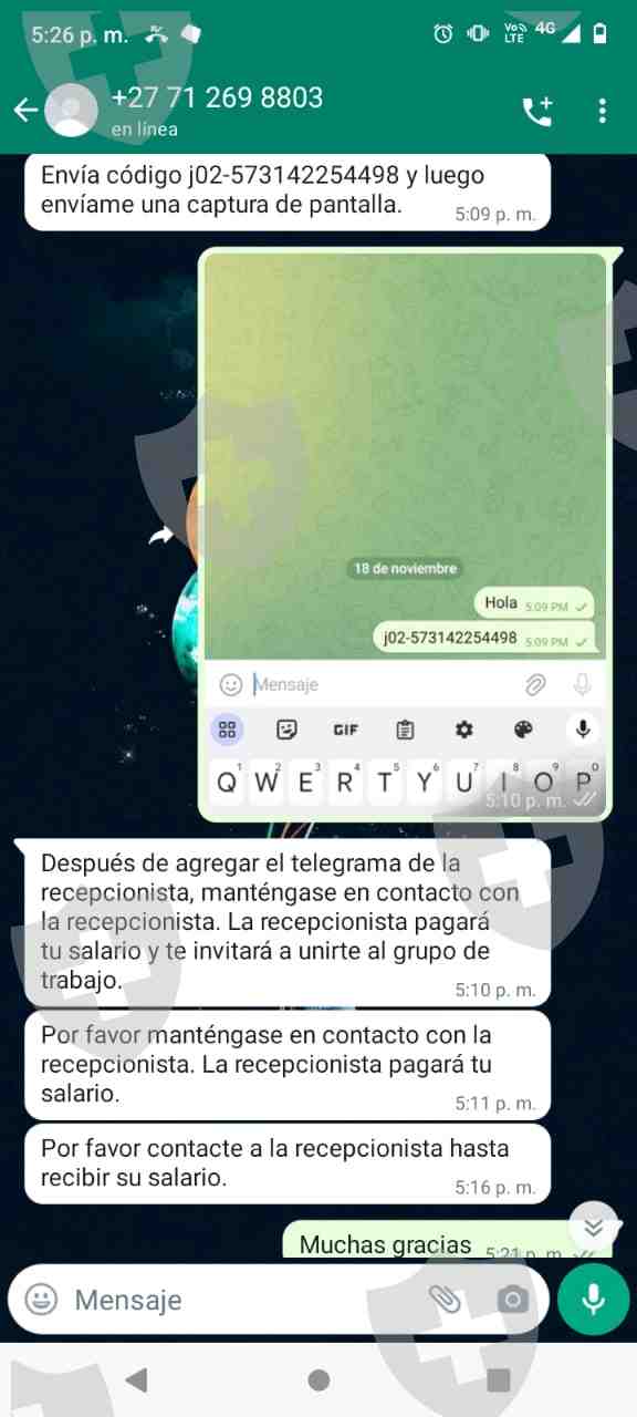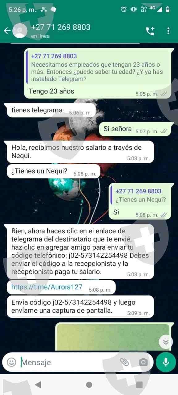 2023 年 11 月 19 日,我陷入了欺诈经纪人的诈骗。这一切都始于通过 WhatsApp 进行的联系人,该联系人承诺通过简单的任务(例如“喜欢”Facebook 上的视频)来换取收入。随后,我被重定向到一个 Telegram 链接,其中一位名叫 Aurira 的假定管理员提供了说明,并共享了一个 Telegram 群组的链接,该群组不断显示成功交易的屏幕截图。完成第一个任务后,我被要求存钱,从小额开始。据推测,这样做是为了人为地将商品观点提高到夸大的价值。尽管我相信该操作的合法性,但我还是被骗了,损失了大约 1,954,000 哥伦比亚比索,希望能从中获利。当我完成第 12 项任务时,情况变得复杂了,当时所谓的文森特教授告诉我一个错误,他说他们无法偿还我,直到我额外存入 300 万比索。由于无法支付这笔款项,文森特建议存入 1,760,000 比索以推进相应交易的流程。附件是据称管理利润的页面的链接:https://pp557.vip/user .php?mod=do&act=login。在此页面上,我看到 930,000 哥伦比亚比索的冻结余额,但我不知道如何解冻该值以尝试收回部分资金。