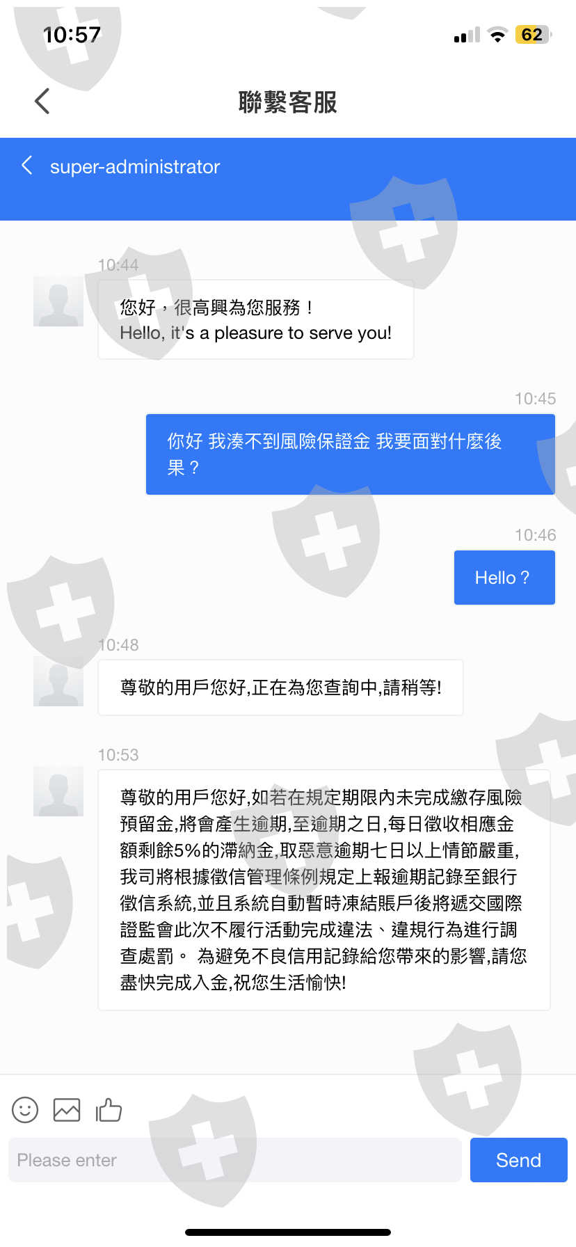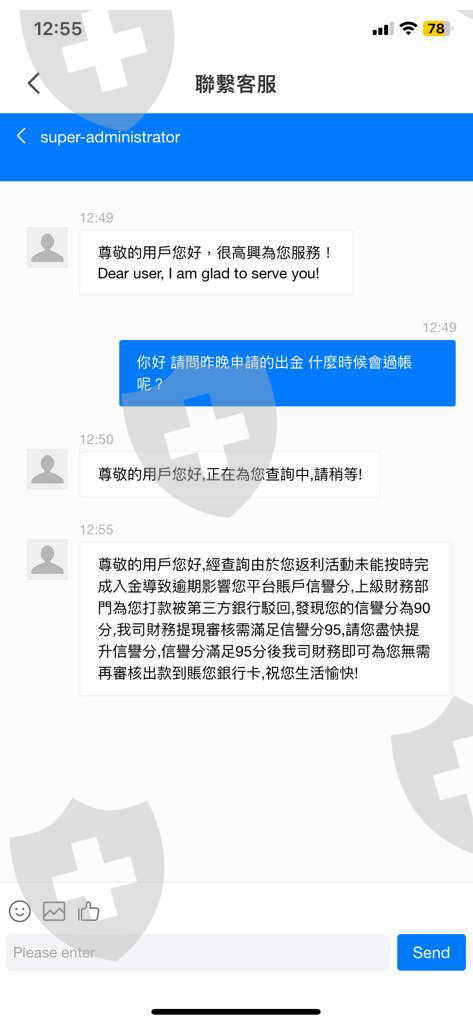 男人隨後入了第一筆錢,之後又入了兩三筆錢。我無奈貸款完成活動後,平台表示新人活動不接受他人代入金,要我自己獨自完成10萬美元的入帳。由於錢壓在平台帳戶裡,我只能繼續借貸。入金完成後,客服表示由於我逾期完成新人活動,導致平台信譽分不足,我需於7天內提升5分平台信譽分才能出金。2萬美元1分,可他人代入金。那男人說他會借錢幫我,無奈之下,我只能繼續貸款。限期內完成入金後,客服又說那男人的入帳是黑錢,要我交差不多10萬美金風險預留金來證明我沒有參與洗黑錢,還不斷威脅說我需繳錢,不然會有逾期罰金、凍結帳戶並送交國際證監。這時我已借無可借,那男人說他會想辦法借錢。但最後因資金不足完成不了,平台除了扣款,並沒有任何其聲稱會發生的後果。
